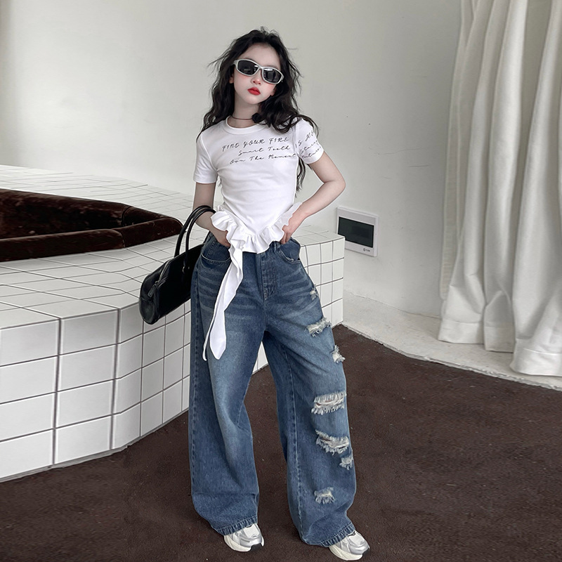 국경 2025 소녀 여름 새로운 불규칙한 레이스 인쇄 탑 찢어진 청바지 한국 스타일