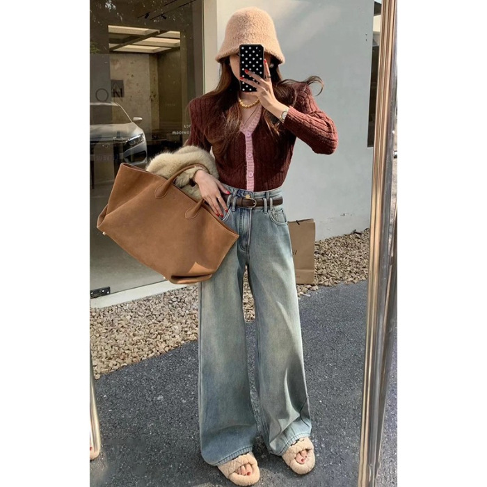 밝은 색상의 넓은 다리 청바지 여성의 높은 허리 드레이프 2024 봄 새로운 패션 간단한 느슨한 슬림 스트레이트 바지