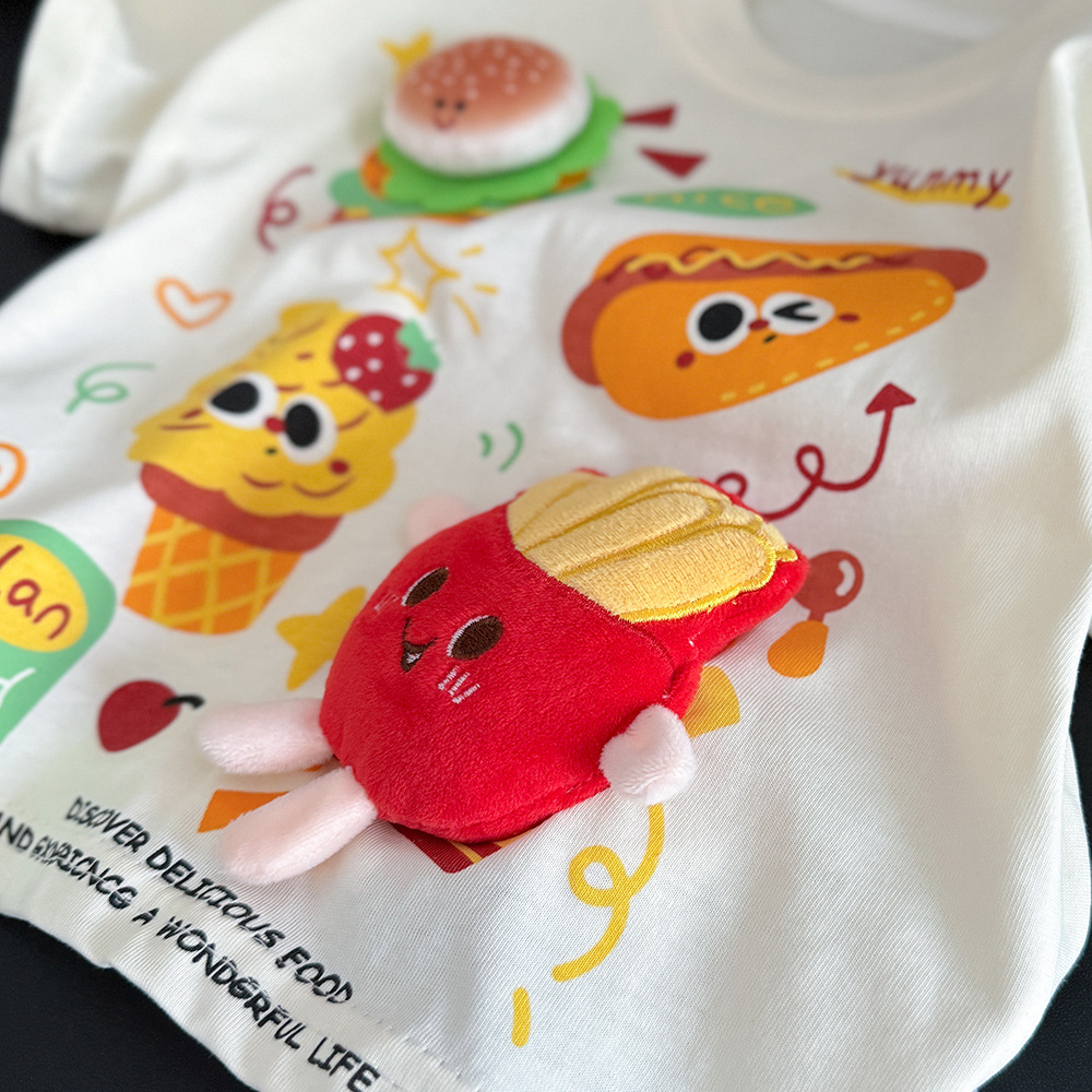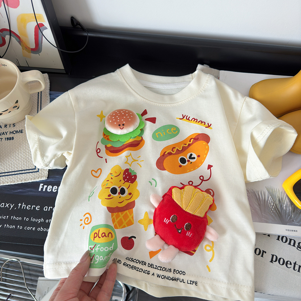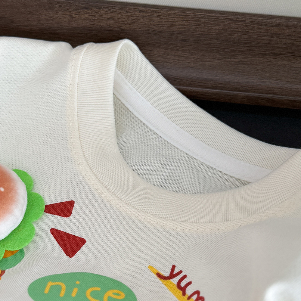 어린이 반소매 티셔츠 2025 여름 새 반소매 소년 소녀 3 차원 수직 스트립 햄버거베이스 셔츠 탑