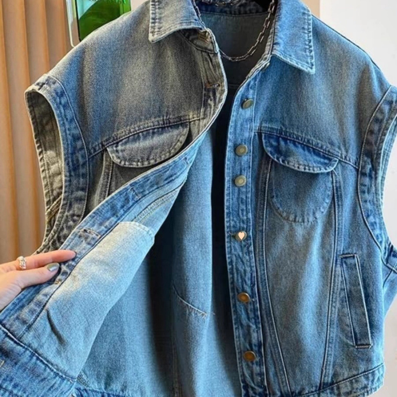 빈티지 2025 새로운 한국 스타일 느슨한 짧은 디자인 데님 조끼 봄과 가을 민소매 허리 코트 재킷