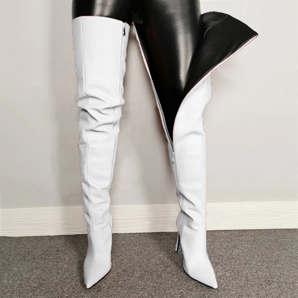 2021 년 가을과 겨울 여성의 화려한 롱 부츠 섹시한 뾰족한 발가락 푸 사이드 지퍼 하이힐 플러스 사이즈 여성용 오버 더 무릎 부츠