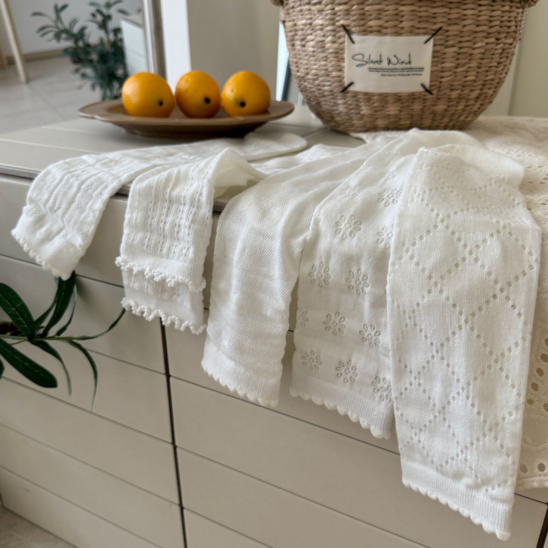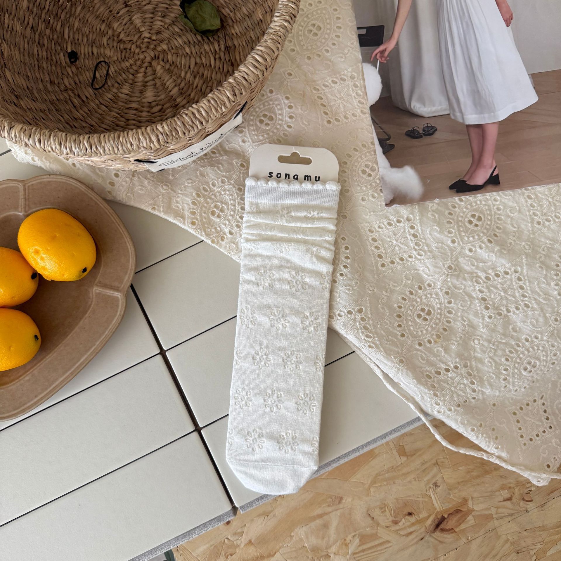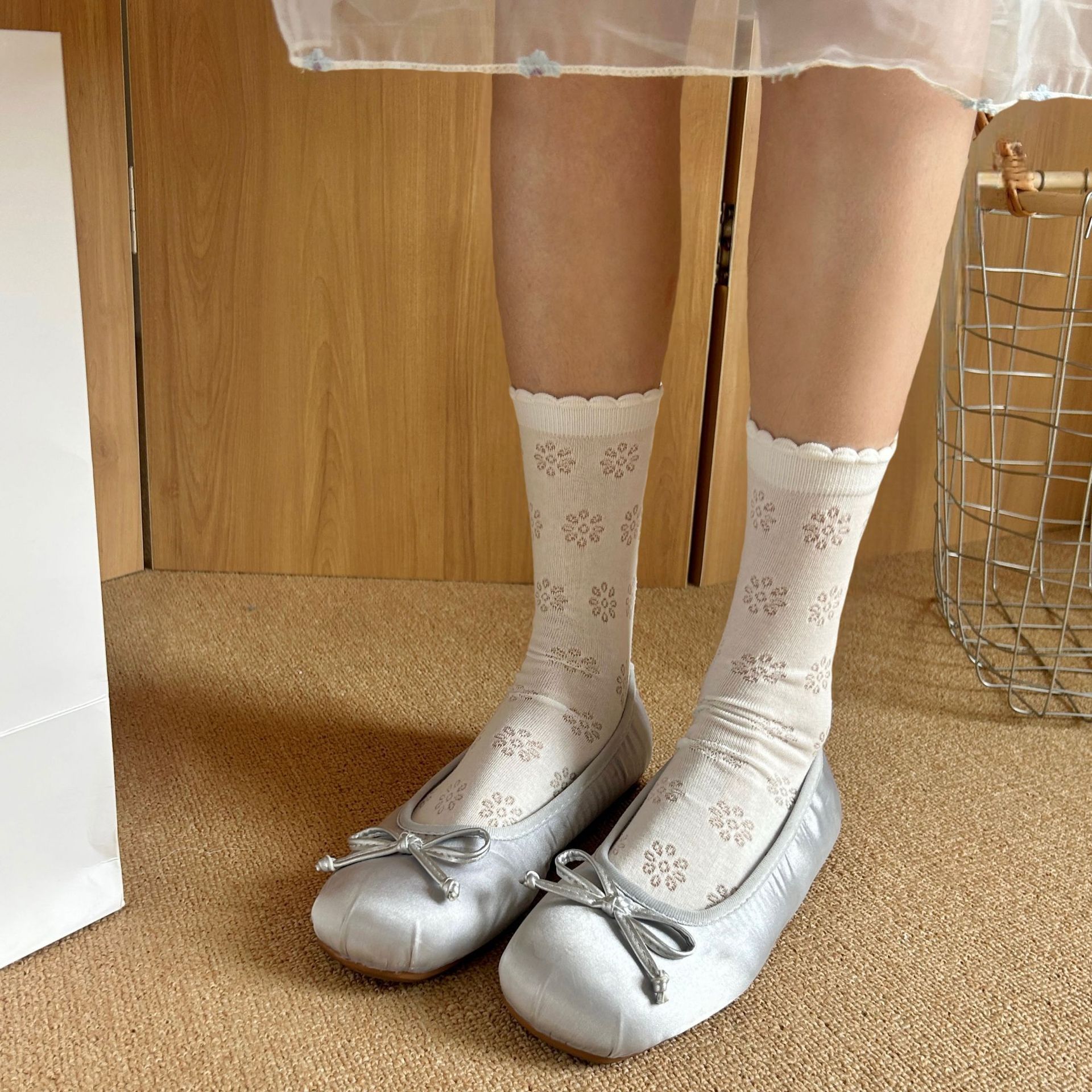 Songmu 'White Stacked Socks Summer Light-color in Thin Cotton Hollow-out Bow Diamond Lattice 초박형 미드 튜브 양말