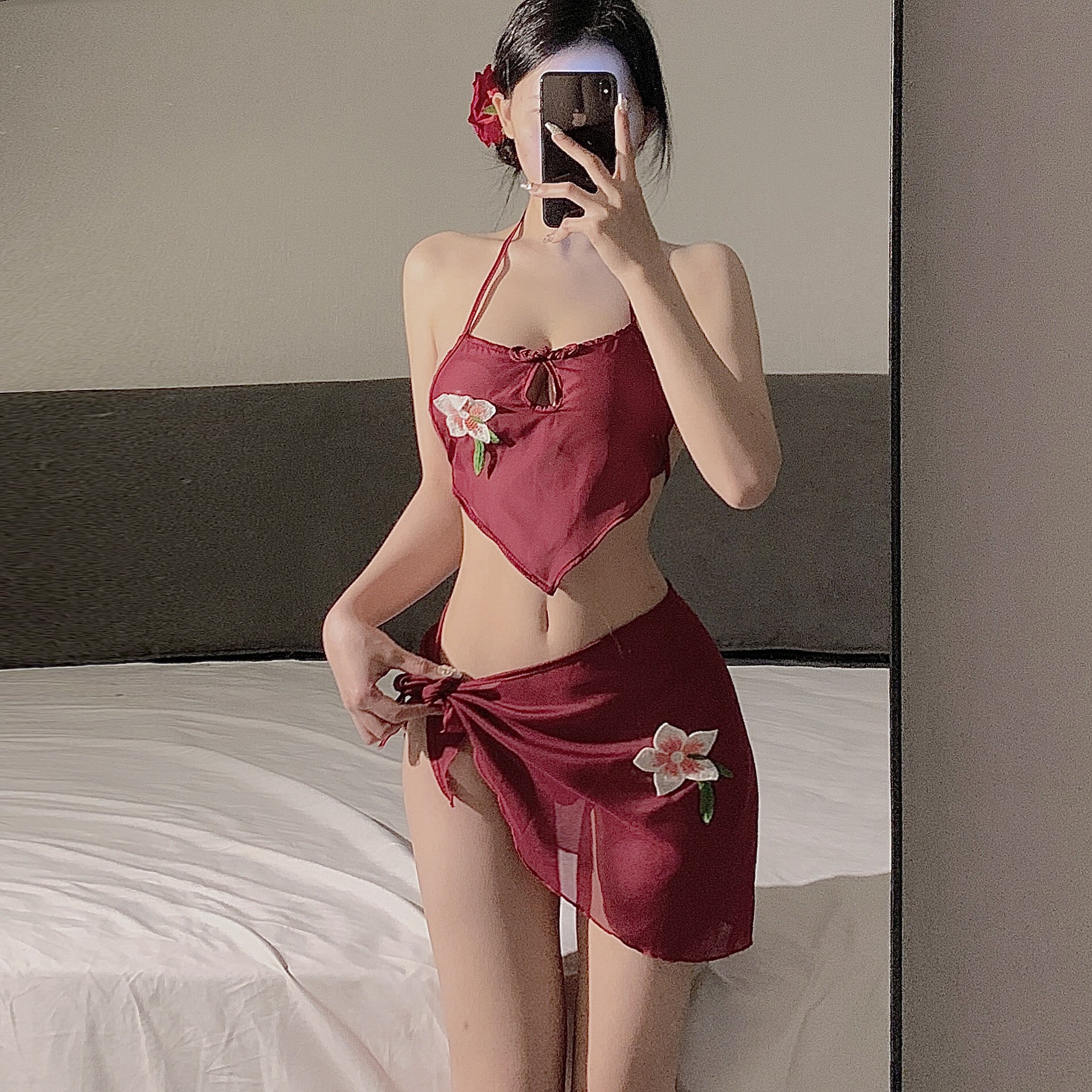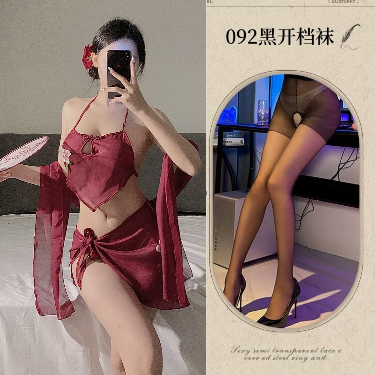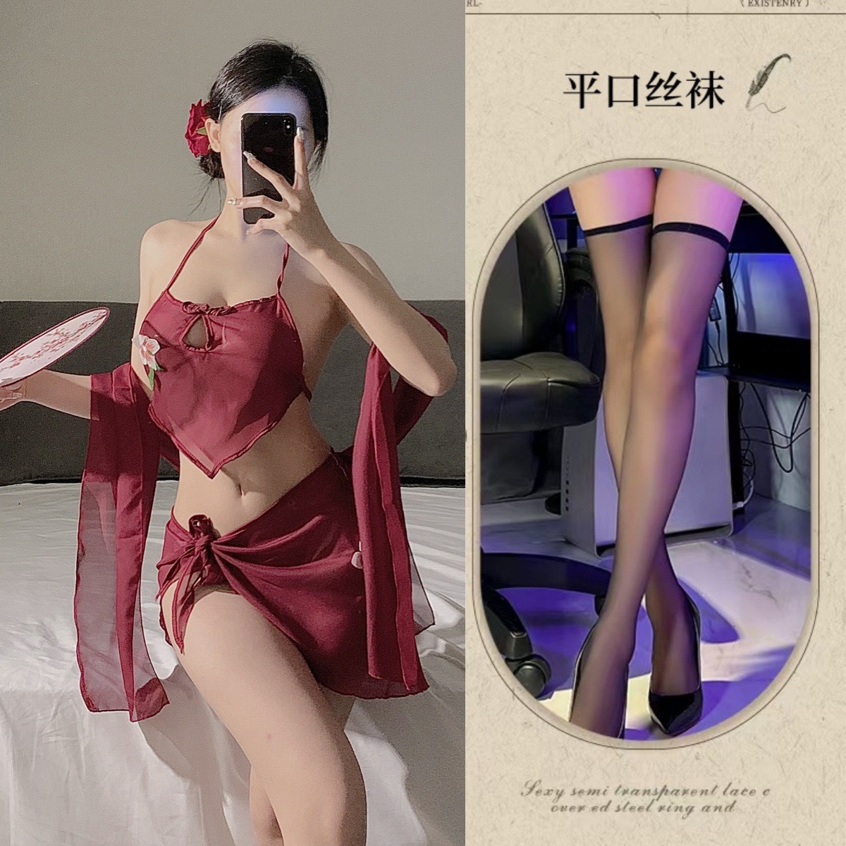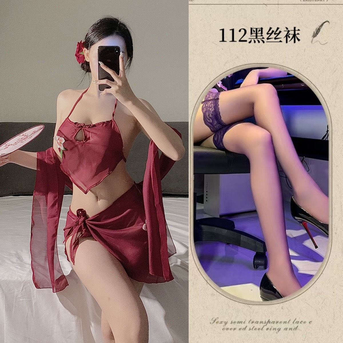 • 버건디 3피스 복대 세트 + 블랙 스타킹