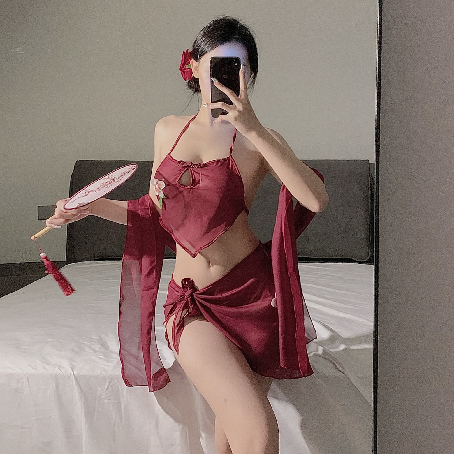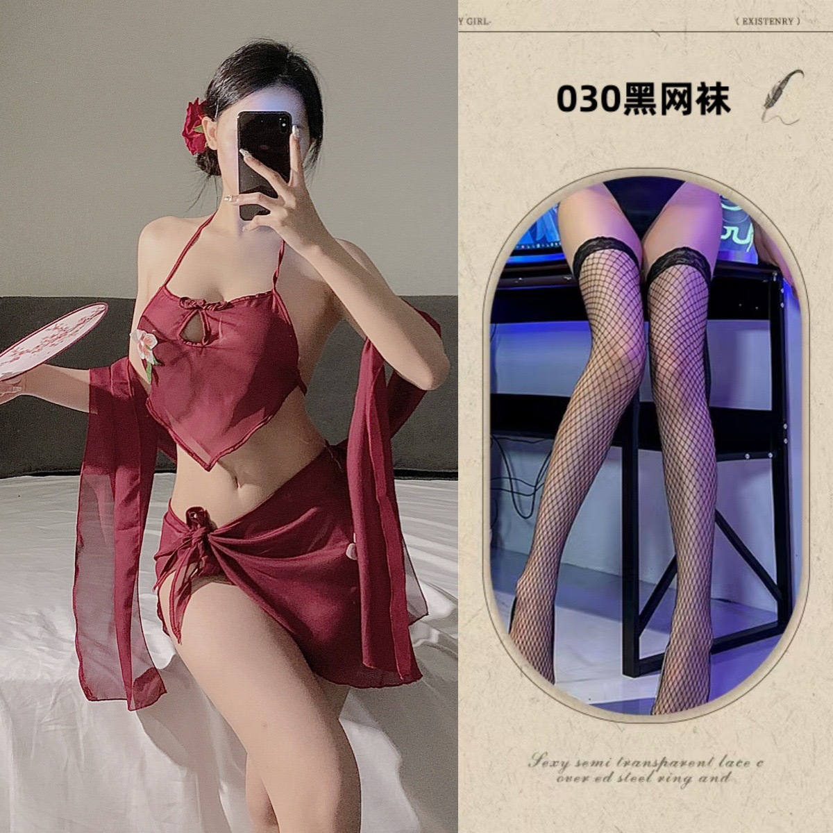 • 버건디 3피스 복대 세트 + 블랙 망사 스타킹