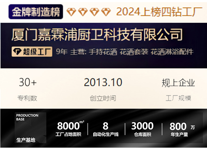 厦门嘉霖浦厨卫科技有限公司定位OEM为主,为客户提供整体卫浴花洒系列和相关配套服务,拥有软硬件设施完善的规模生产工厂,严格产品质量管控。多年来,凭借专业努力的团队及本地区成熟的供应系统,成功为多家龙头企业提供产品服务并成为颇有影响力的卫浴花洒供应商。在此过程中积累了丰富的行业设计及制造经验,曾解决众多此行业技术难题!