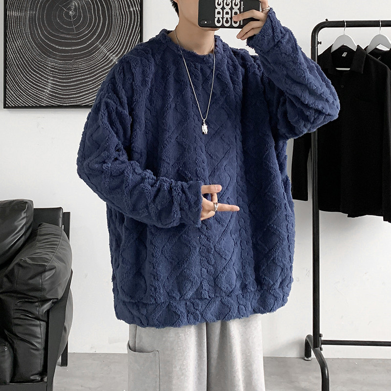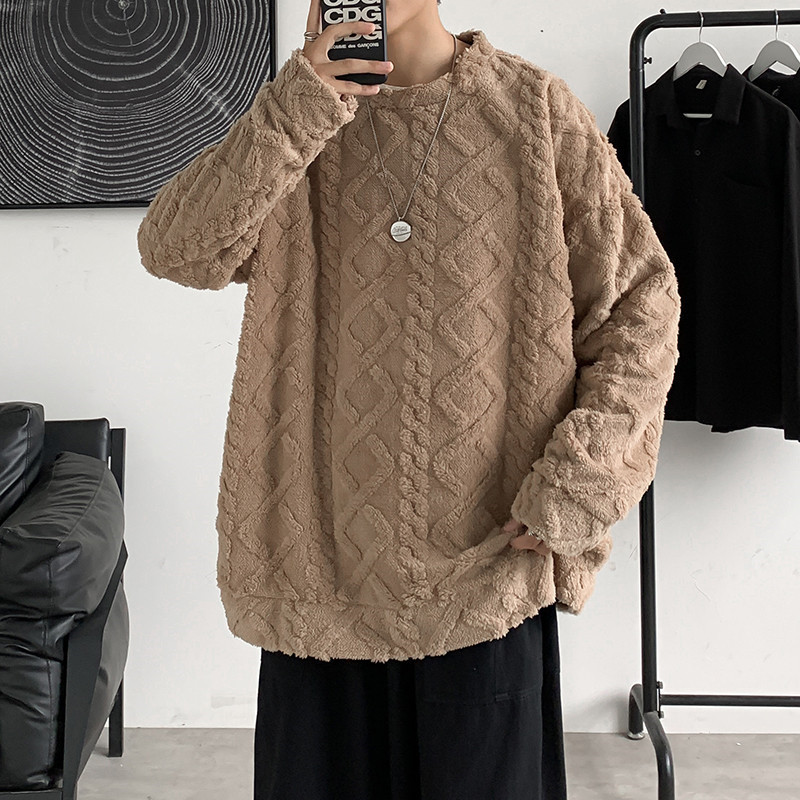 Y45Pexrozna 트렌디 한 게으른 스타일 양고기 양모 운동복 남자의 겨울 기모 느슨한 둥근 목 따뜻한 옷
