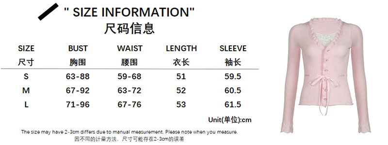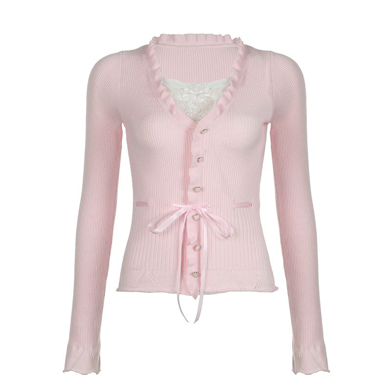 부드럽고 달콤한 스타일의 레이스 스플라이싱 스트랩 가짜 투피스 긴팔 티셔츠 핑크 소녀 다용도 레이스 니트 탑