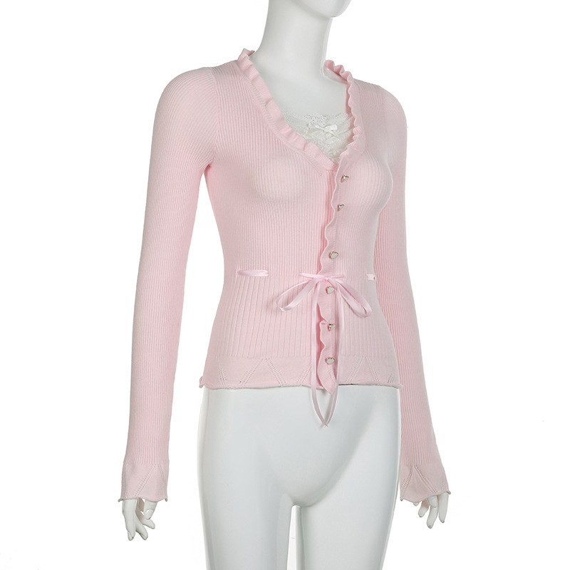 부드럽고 달콤한 스타일의 레이스 스플라이싱 스트랩 가짜 투피스 긴팔 티셔츠 핑크 소녀 다용도 레이스 니트 탑스토어 가기