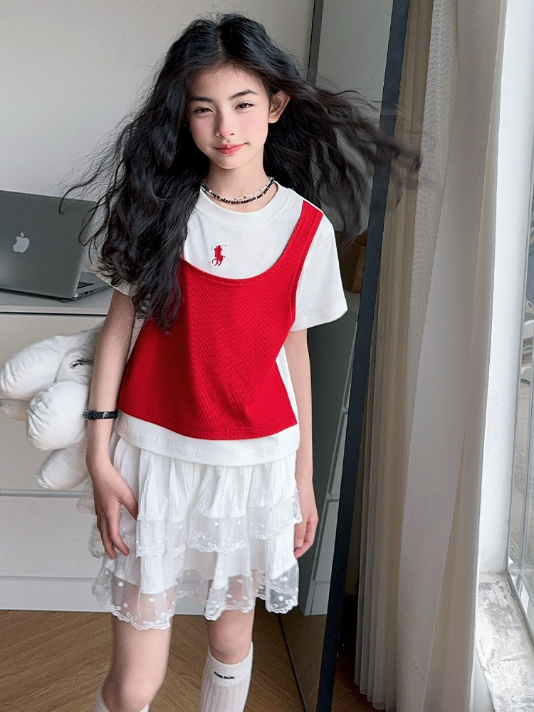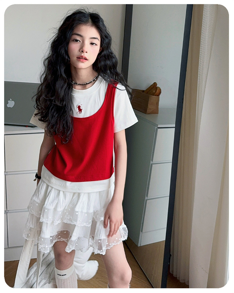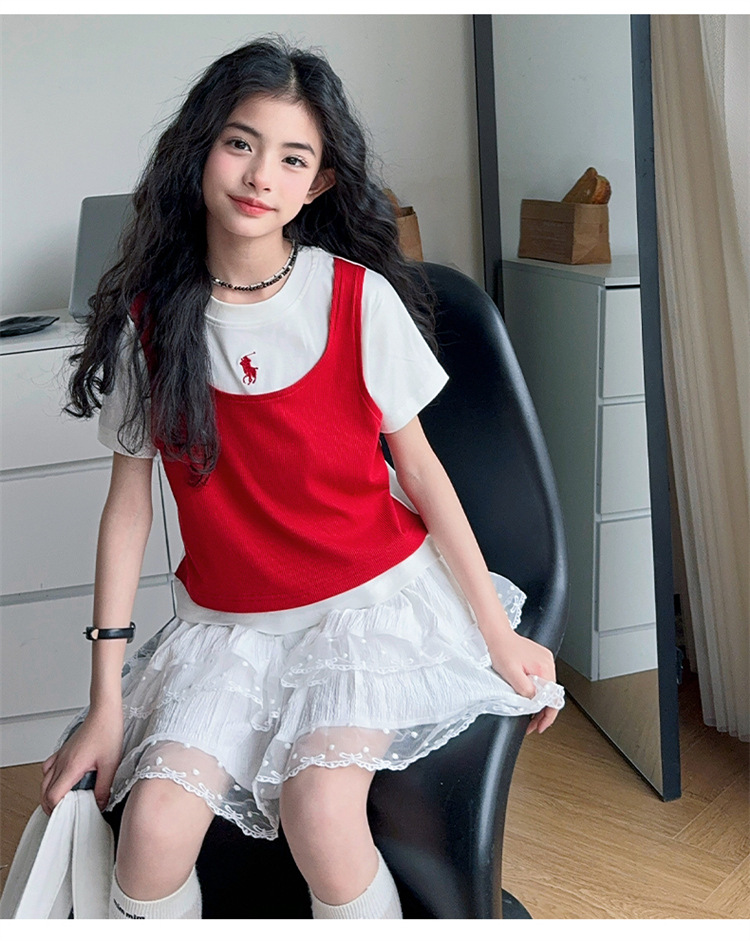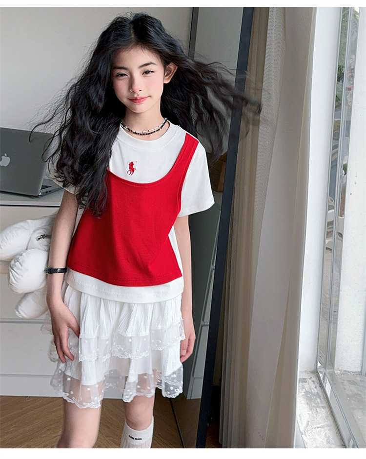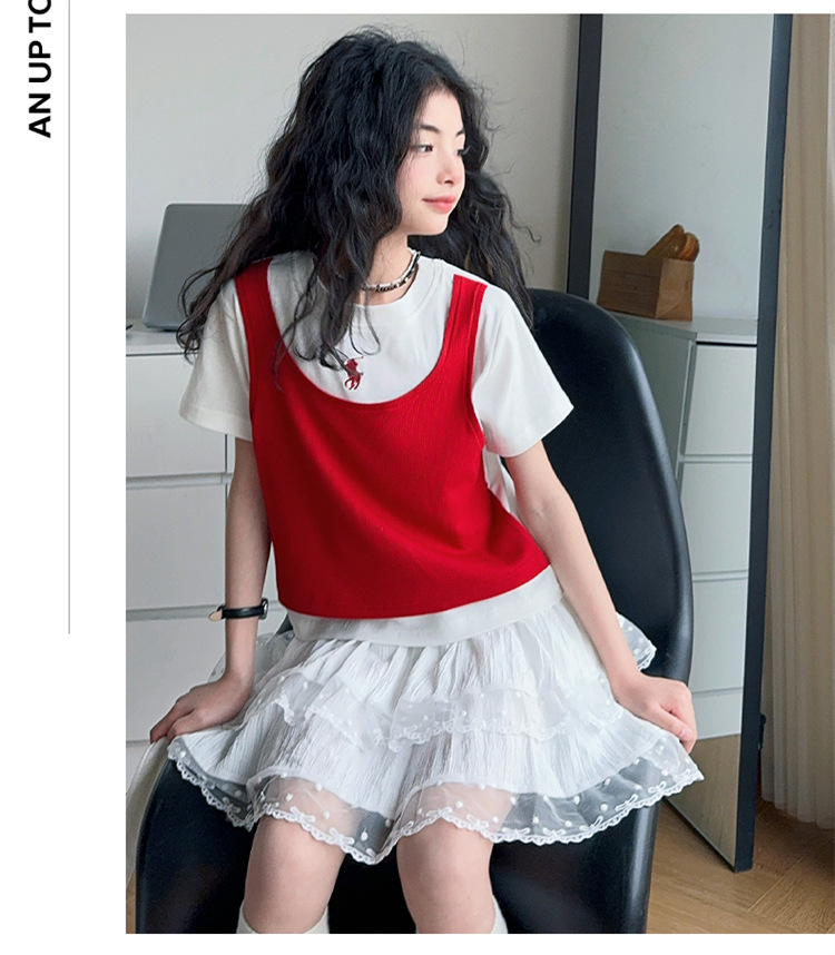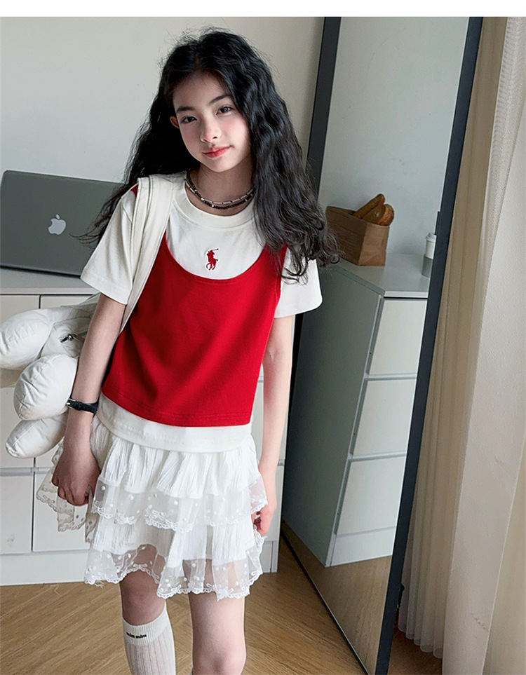 소녀의 가짜 투피스 반팔 티셔츠 세트 여름 2025 새로운 스타일 소녀의 유행 레이스 케이크 스커트 투피스 세트