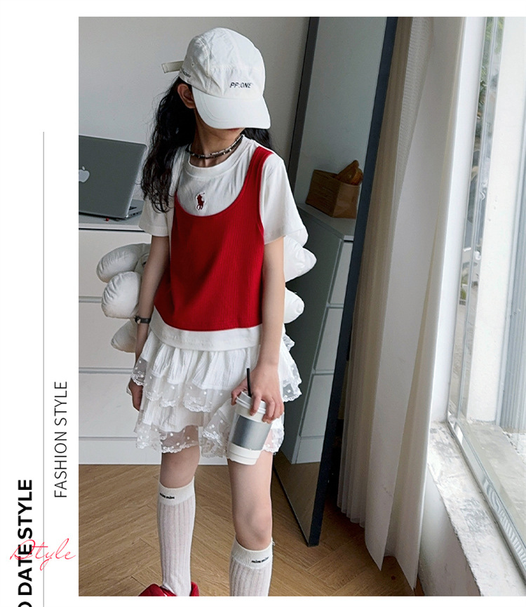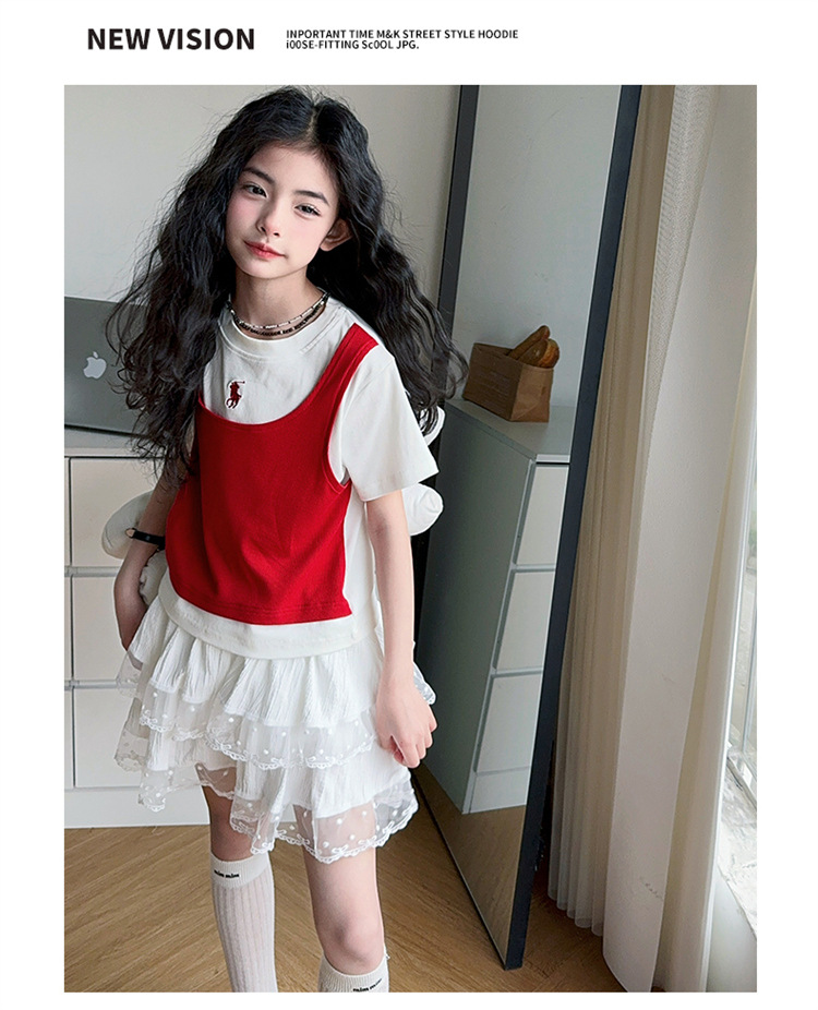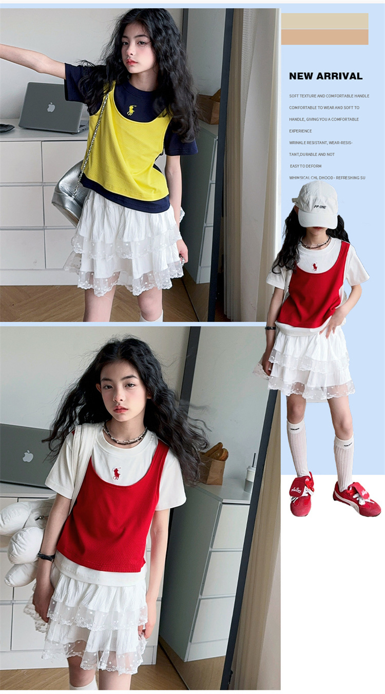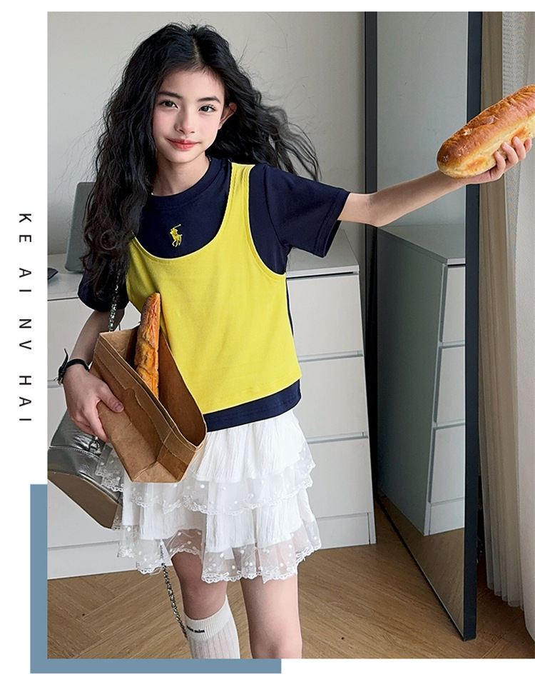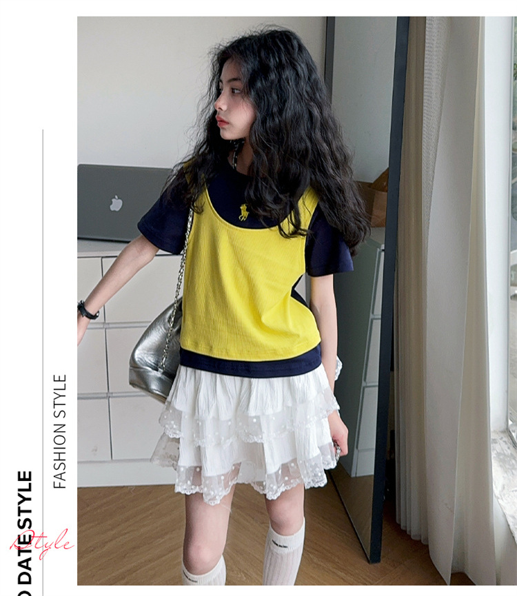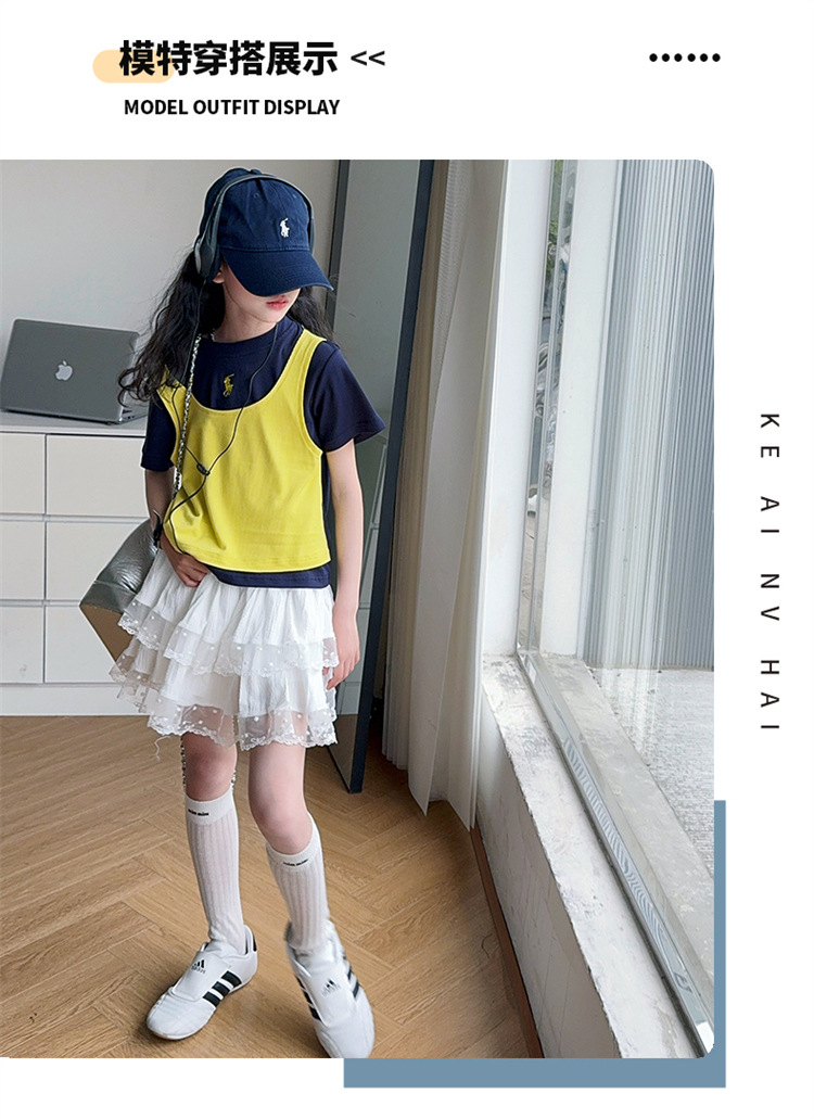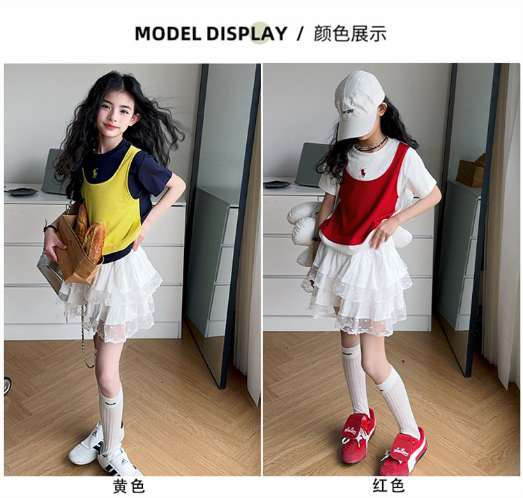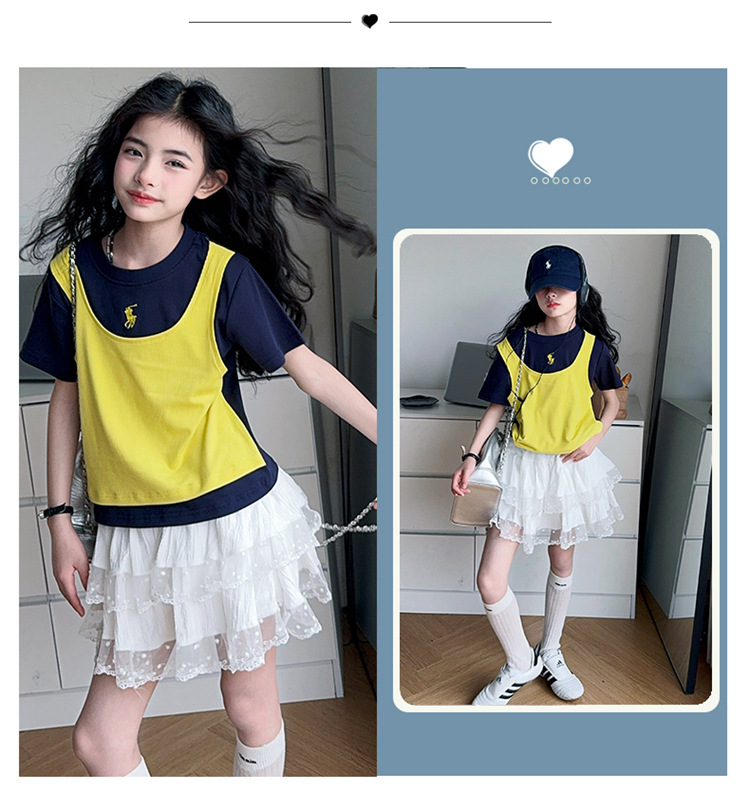 소녀의 가짜 투피스 반팔 티셔츠 세트 여름 2025 새로운 스타일 소녀의 유행 레이스 케이크 스커트 투피스 세트스토어 가기