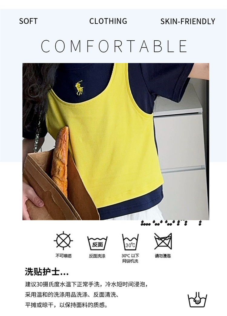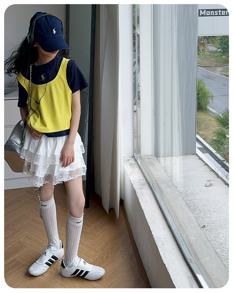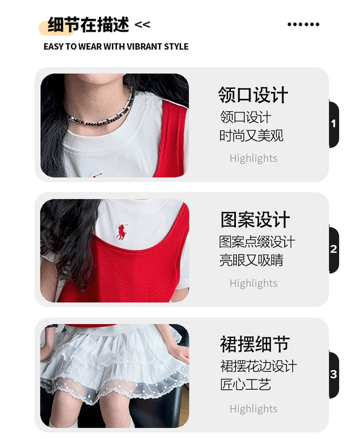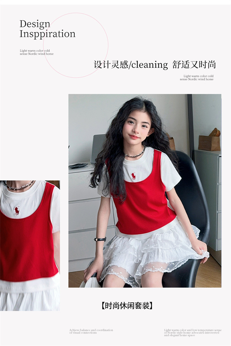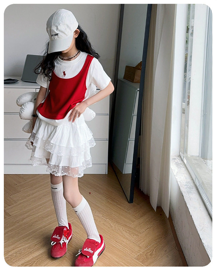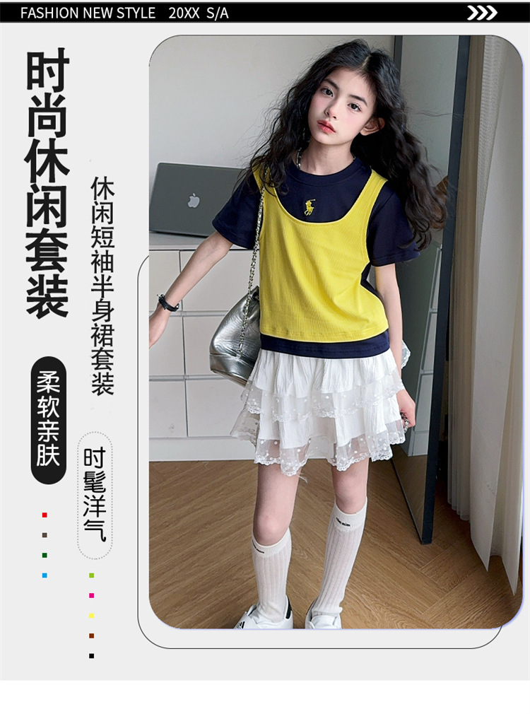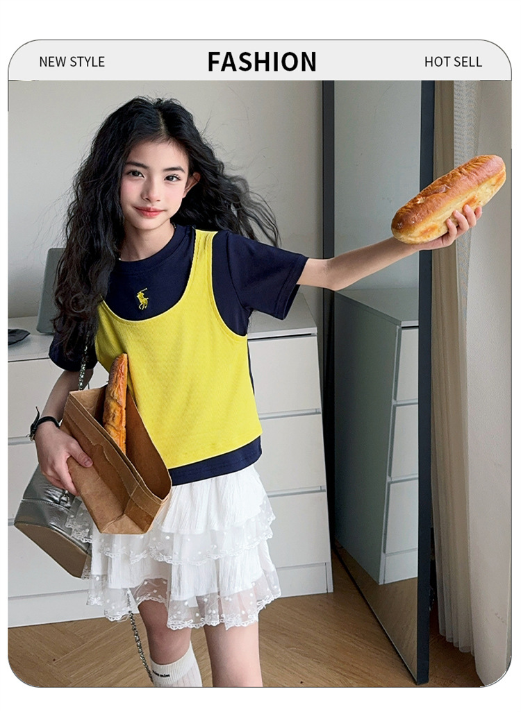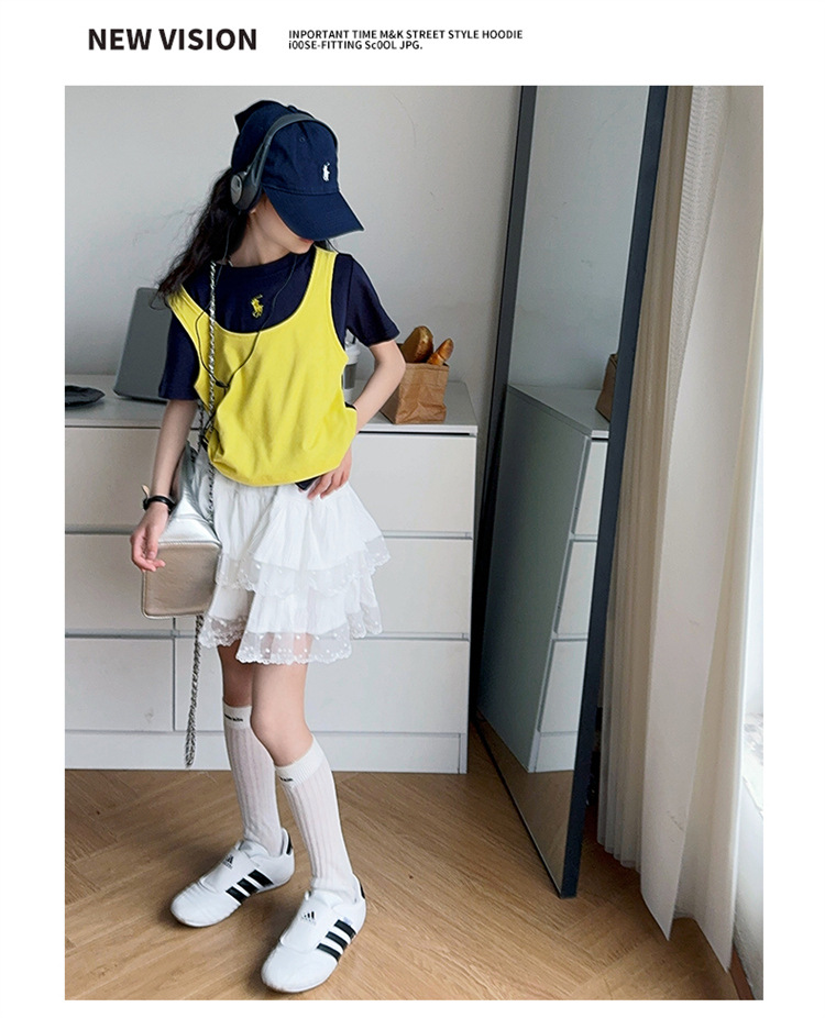 소녀의 가짜 투피스 반팔 티셔츠 세트 여름 2025 새로운 스타일 소녀의 유행 레이스 케이크 스커트 투피스 세트스토어 가기