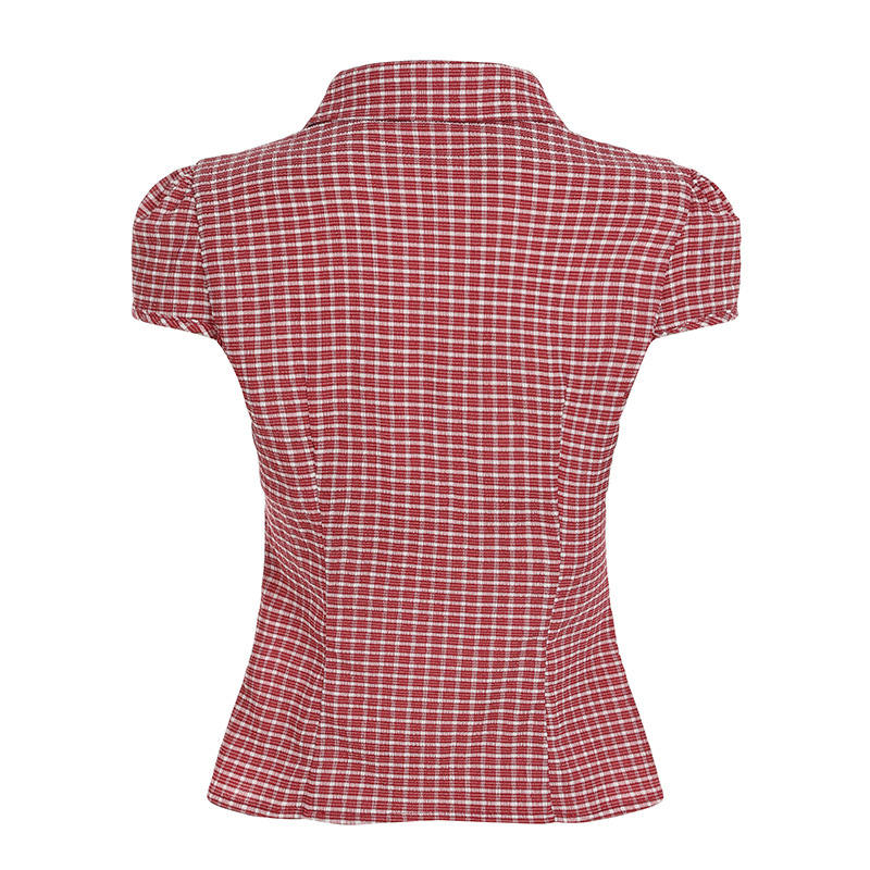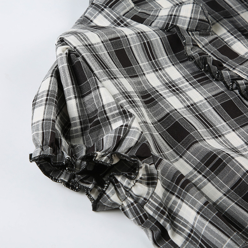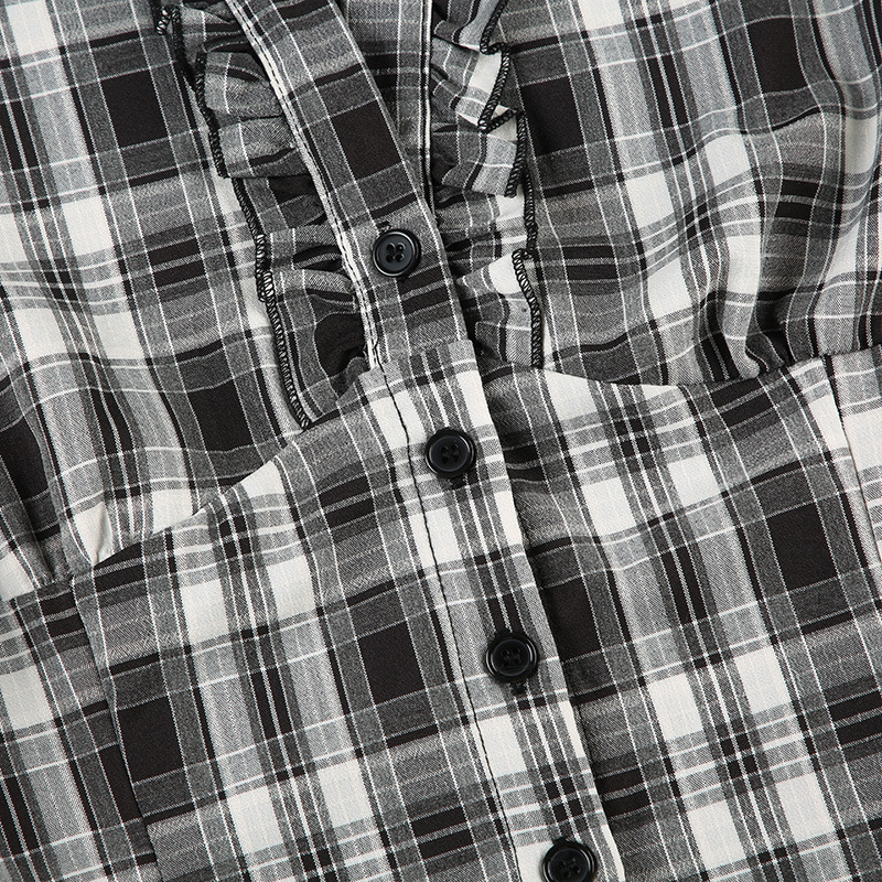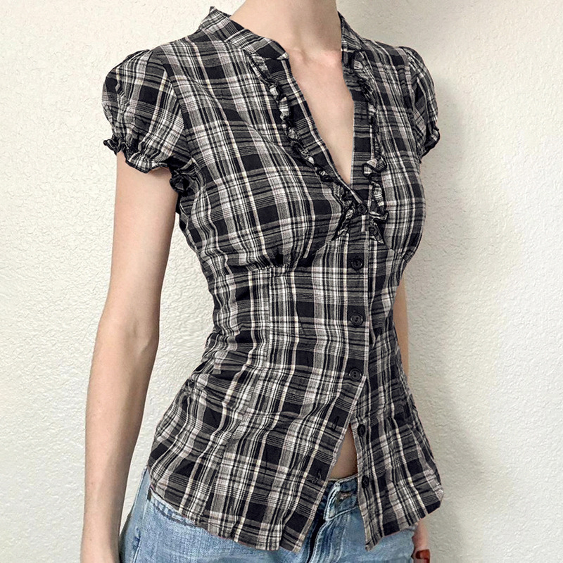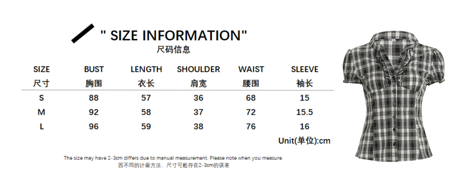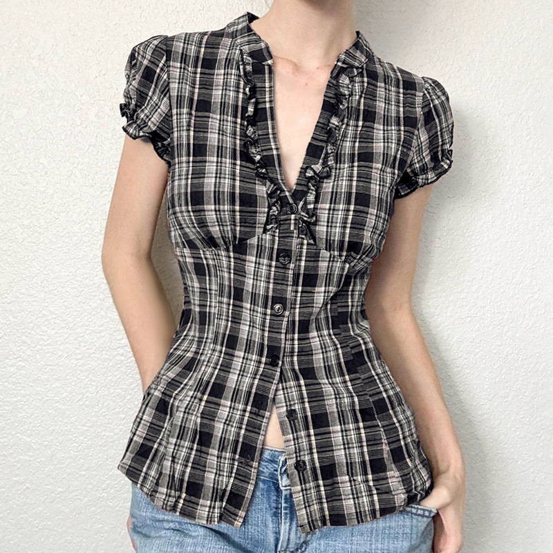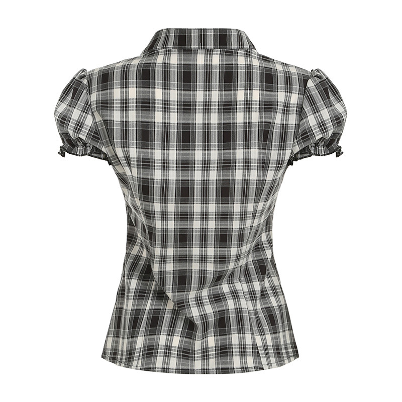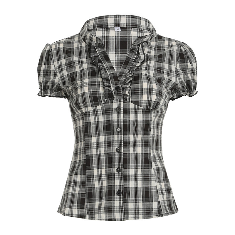 영국 스타일 V-Neck 체크 무늬 블라우스 우아한 여성용 허리 버튼 버블 슬리브 탑