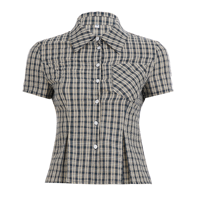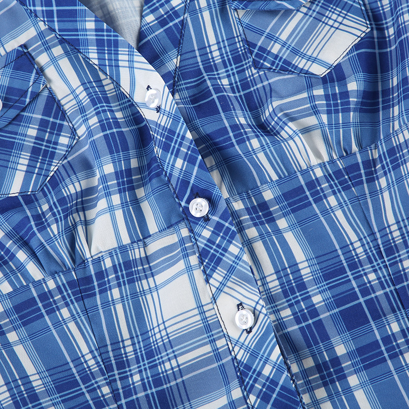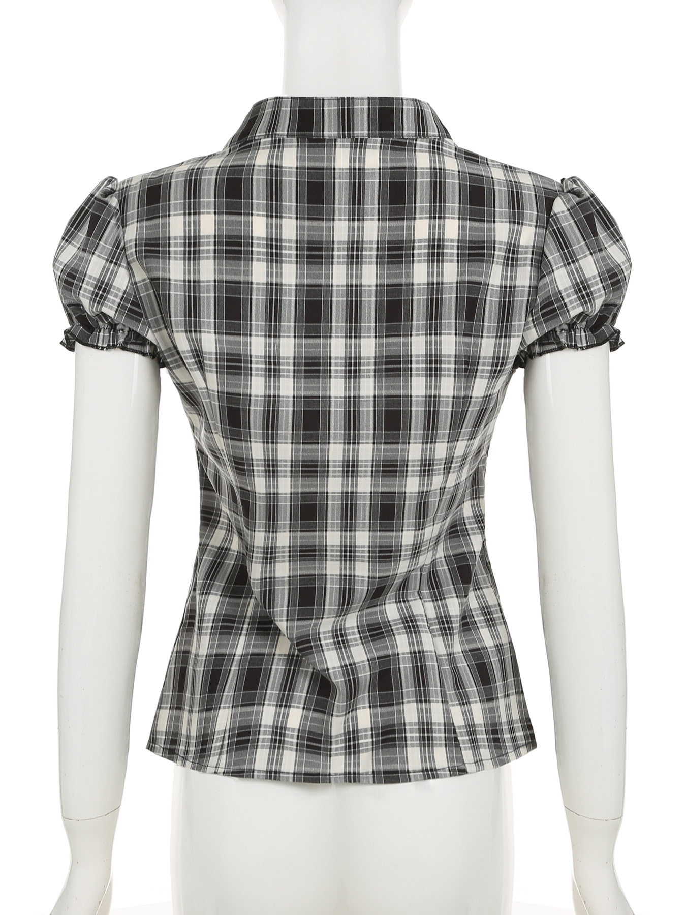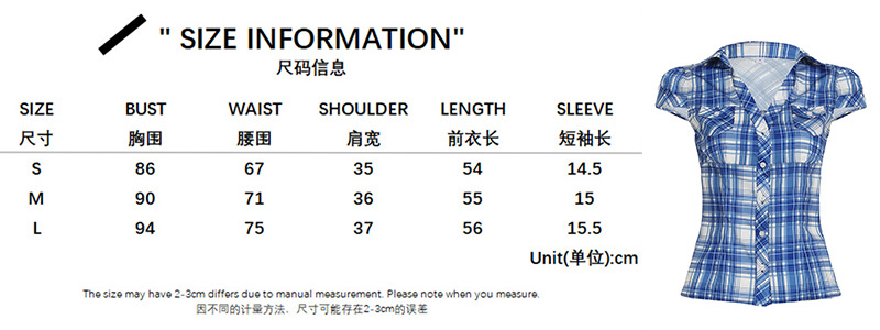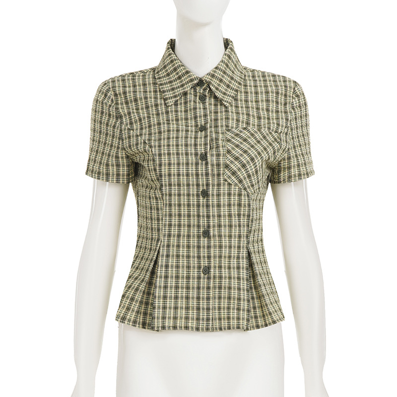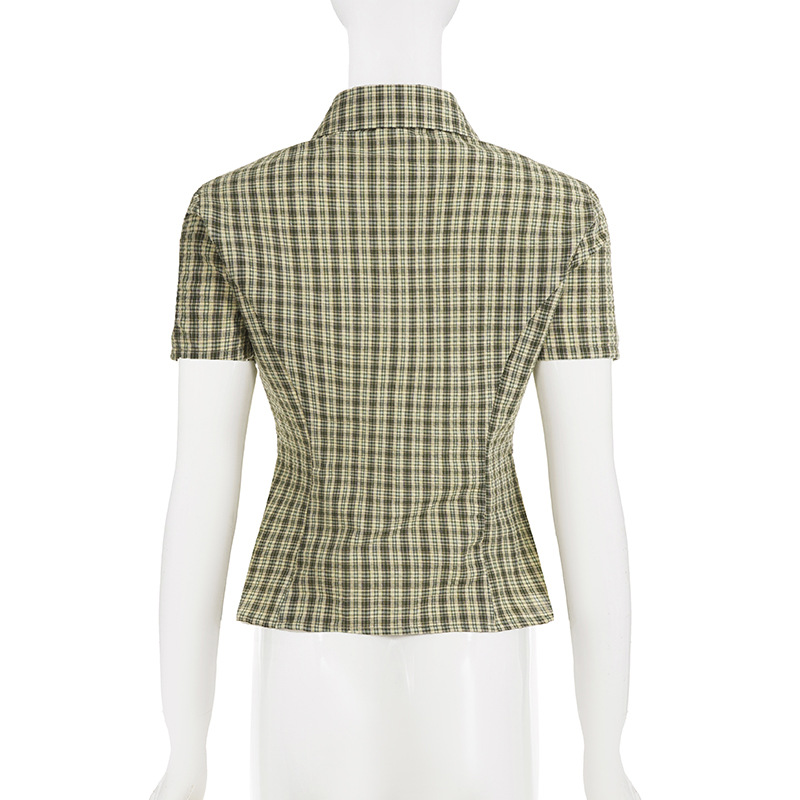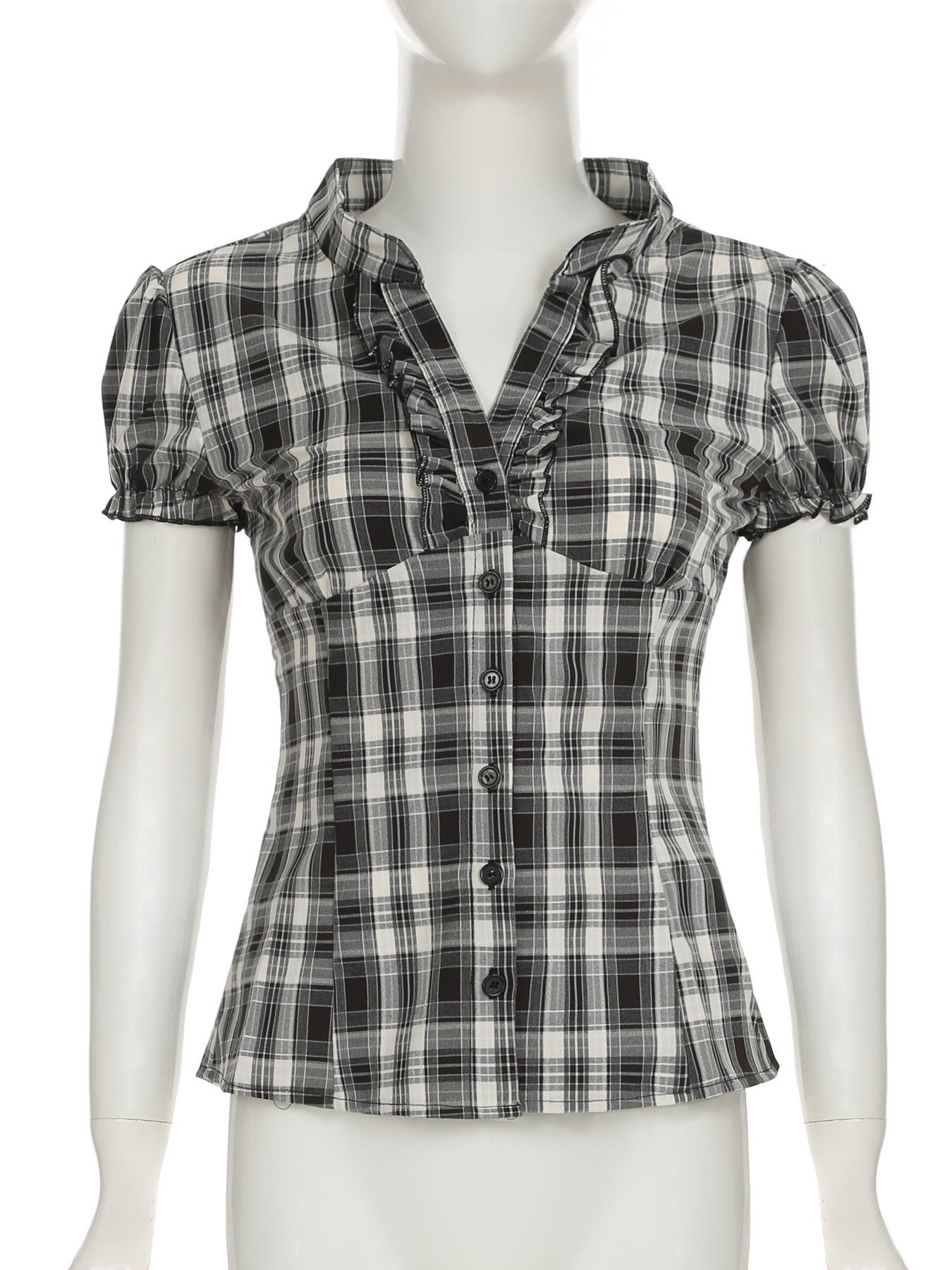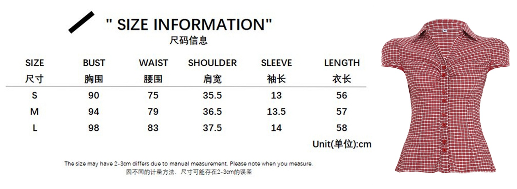 영국 스타일 V-Neck 체크 무늬 블라우스 우아한 여성용 허리 버튼 버블 슬리브 탑
