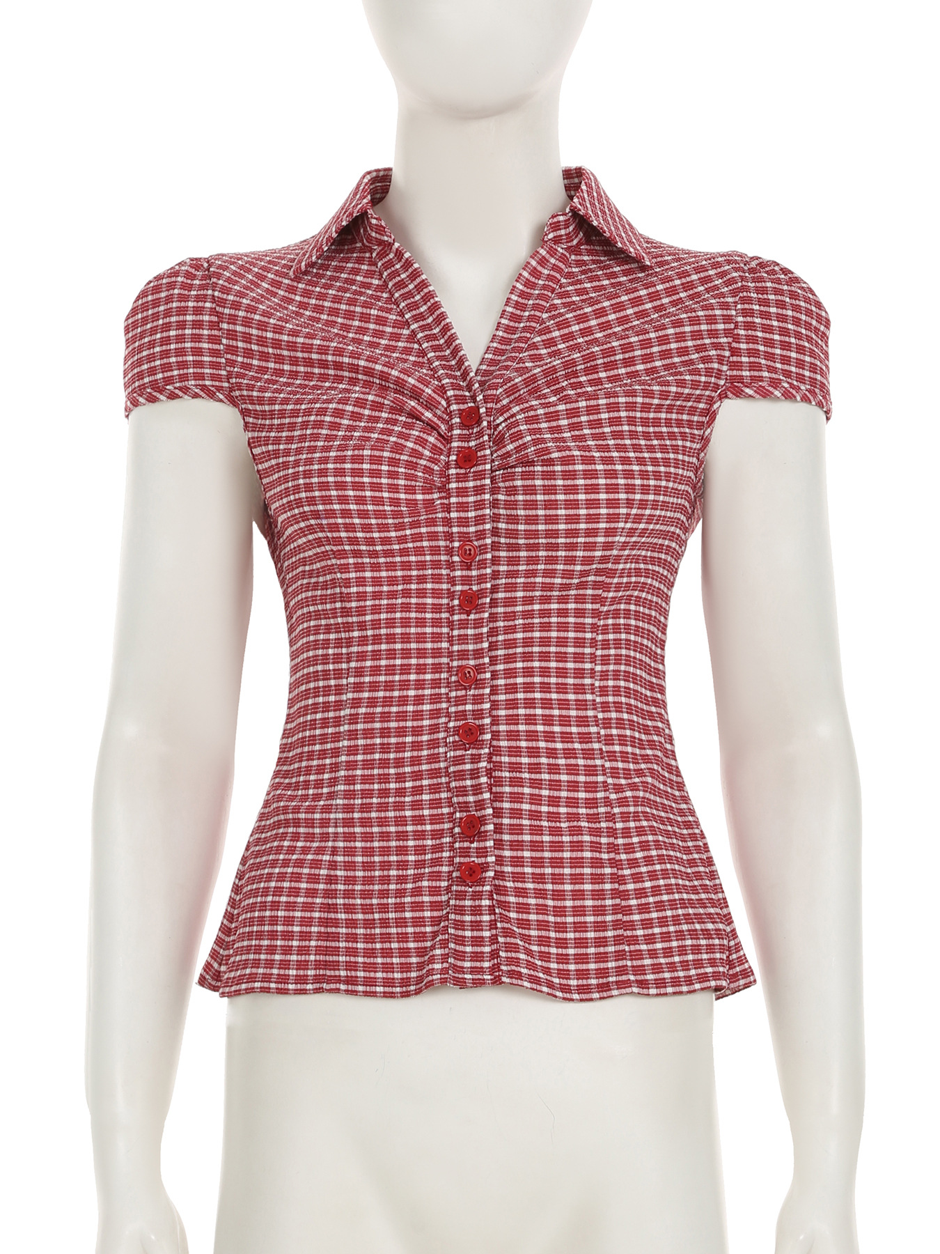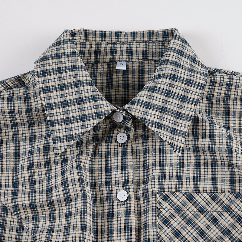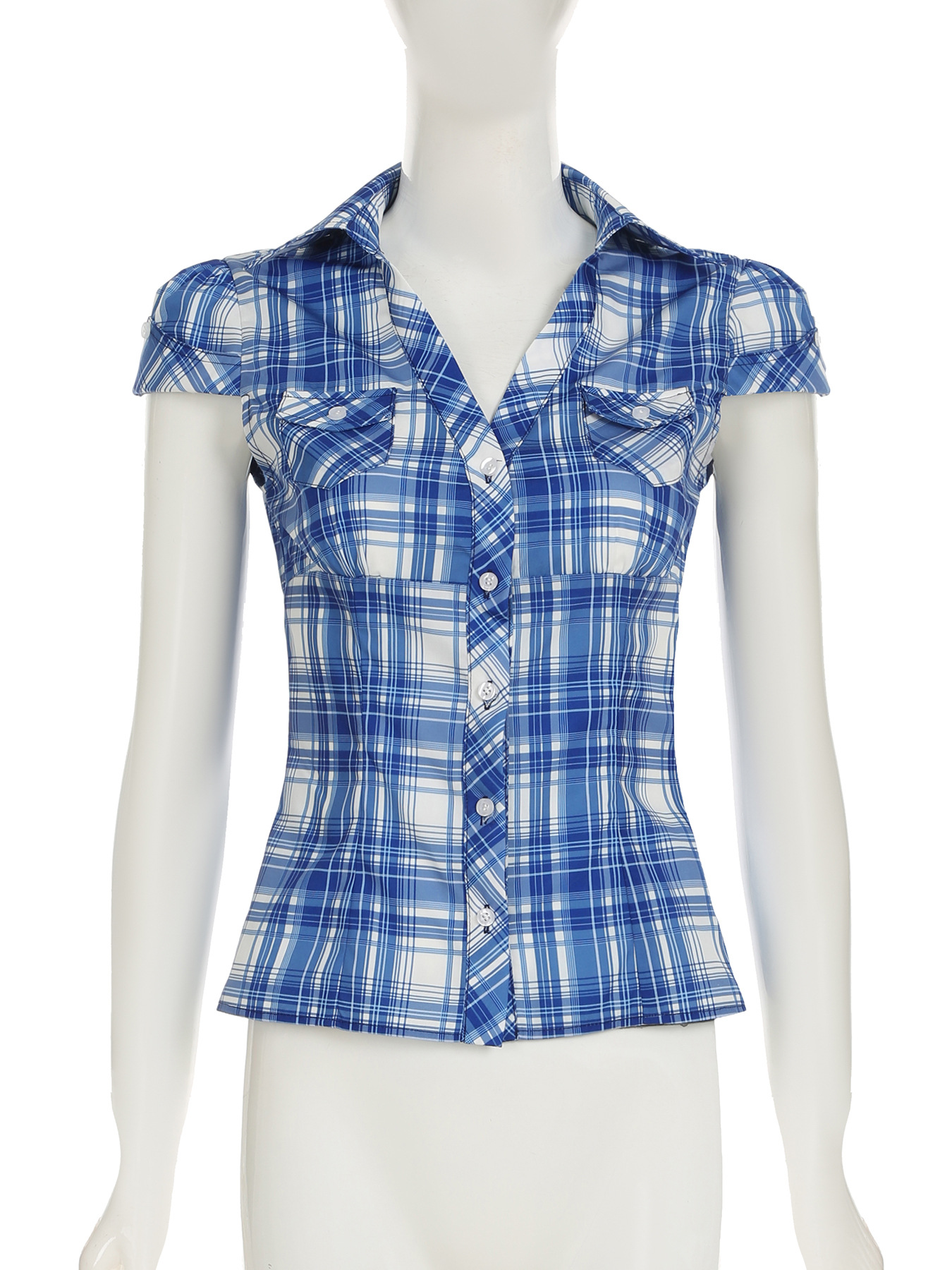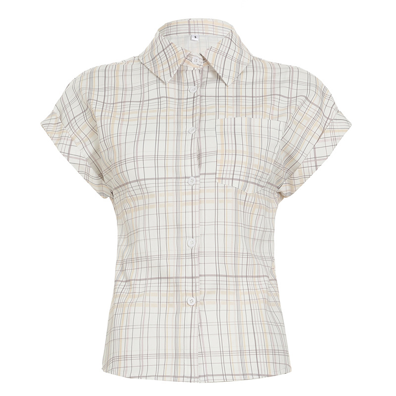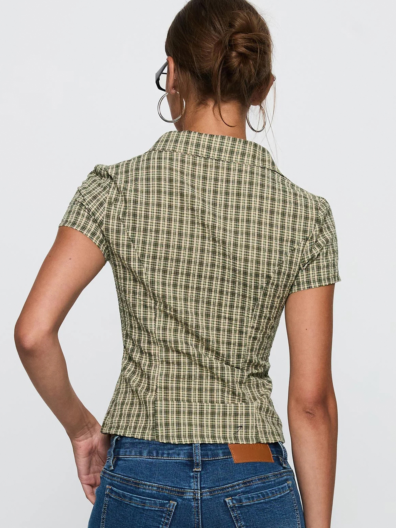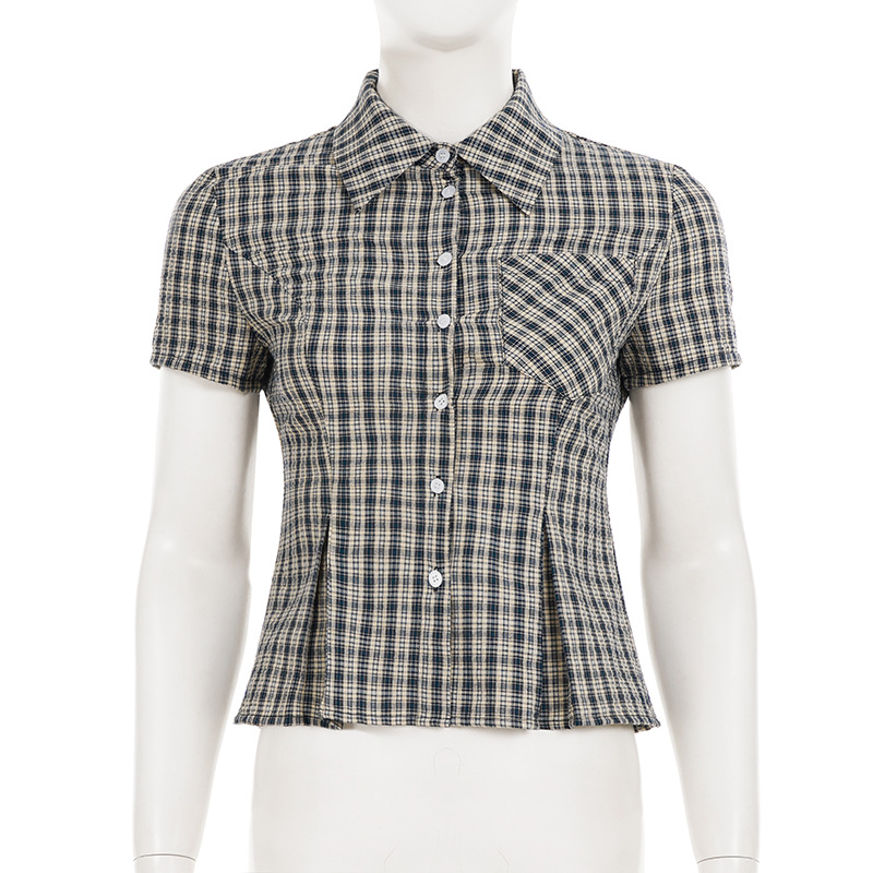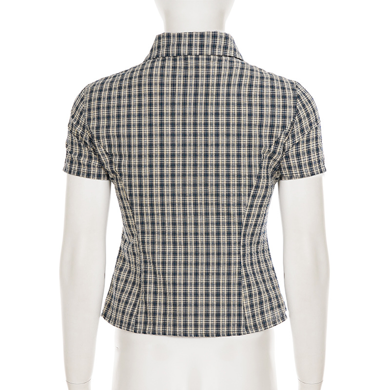 영국 스타일 V-Neck 체크 무늬 블라우스 우아한 여성용 허리 버튼 버블 슬리브 탑