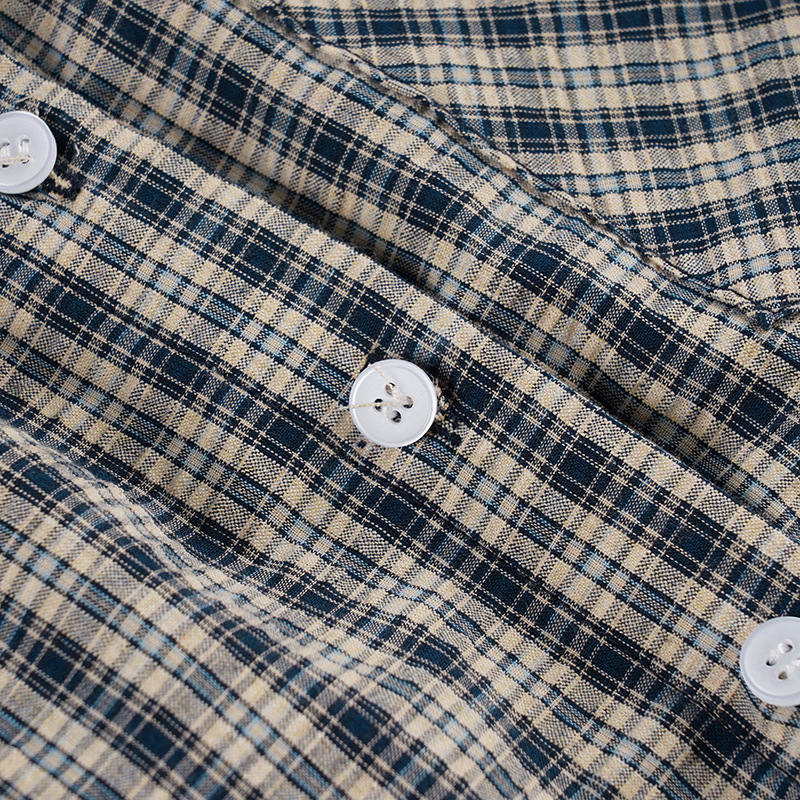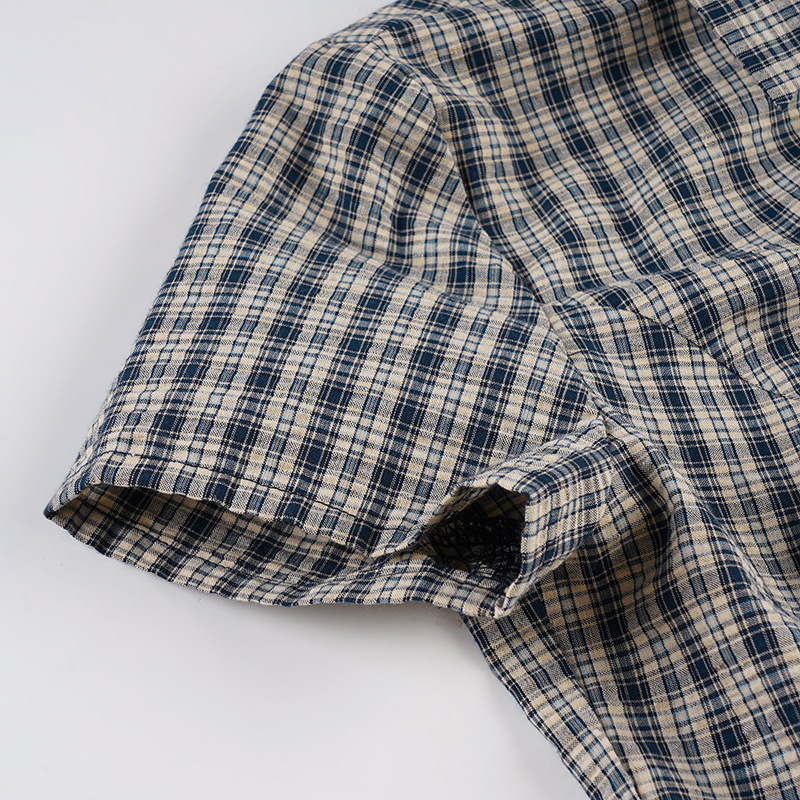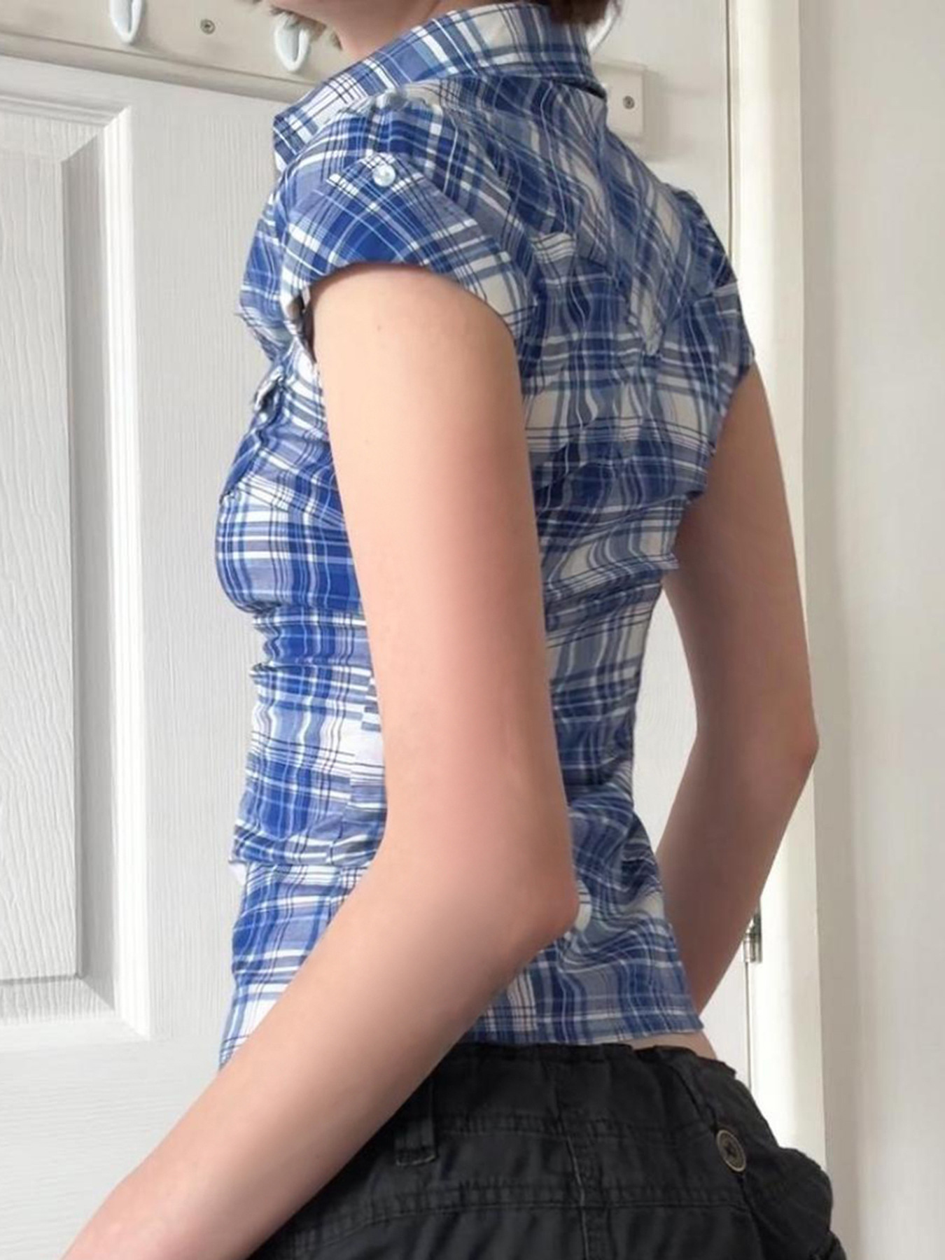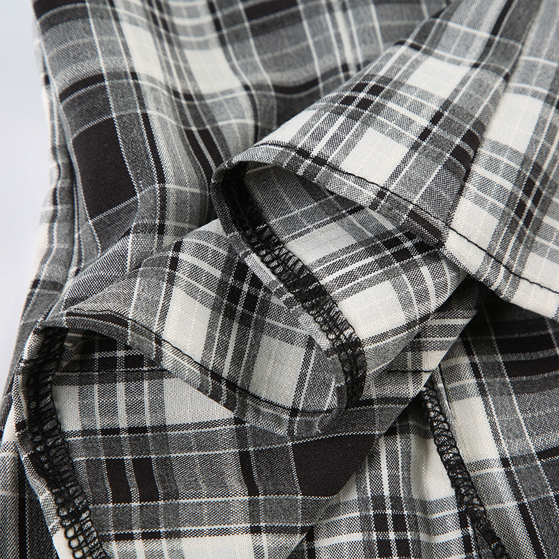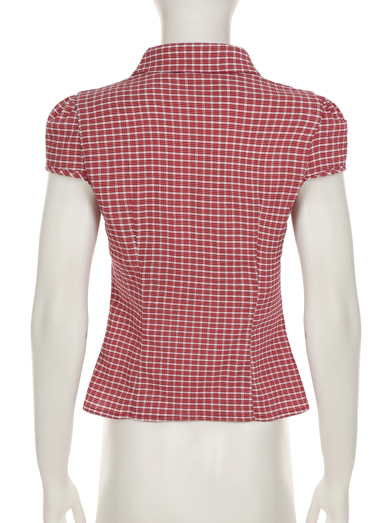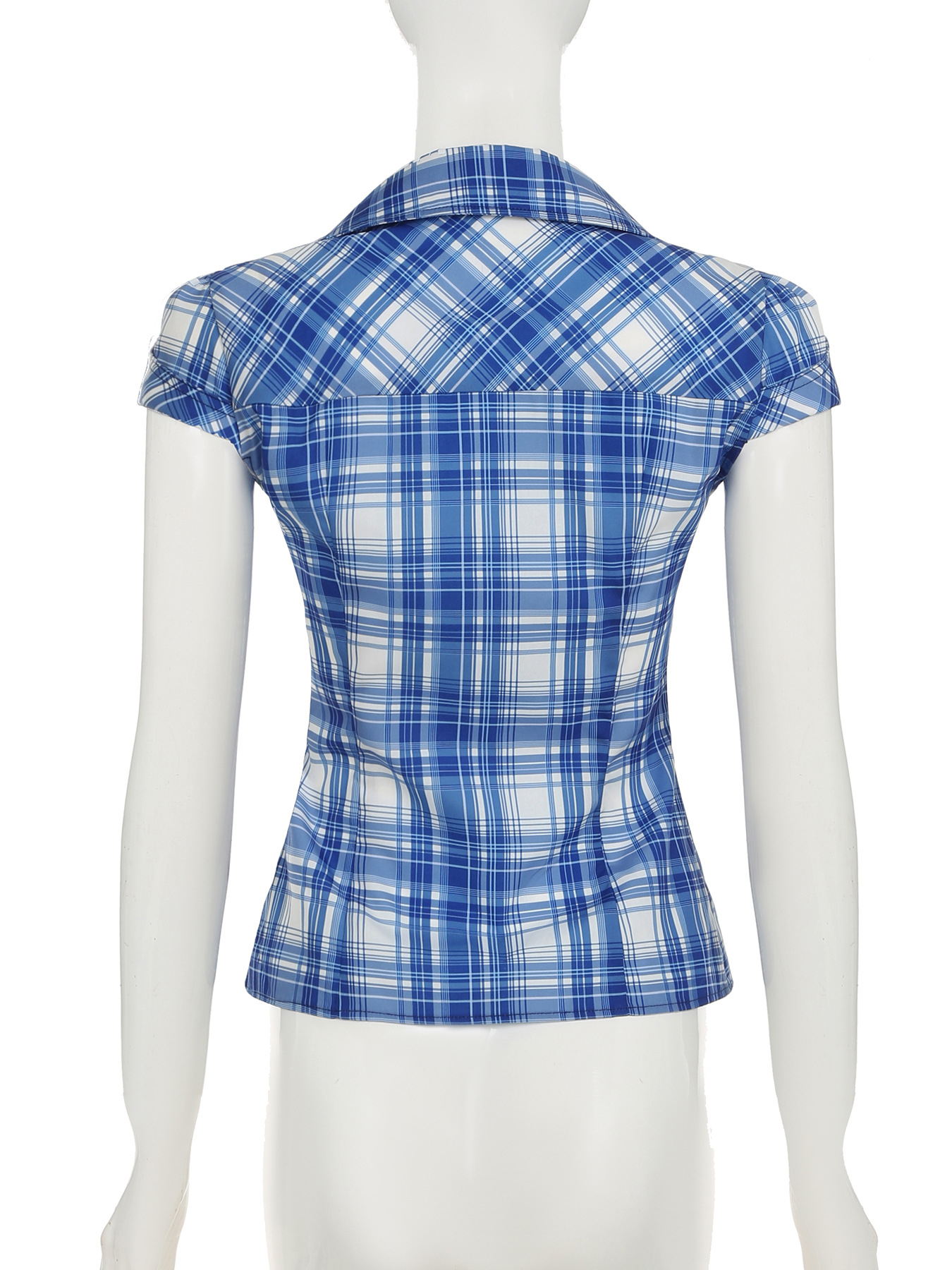 영국 스타일 V-Neck 체크 무늬 블라우스 우아한 여성용 허리 버튼 버블 슬리브 탑