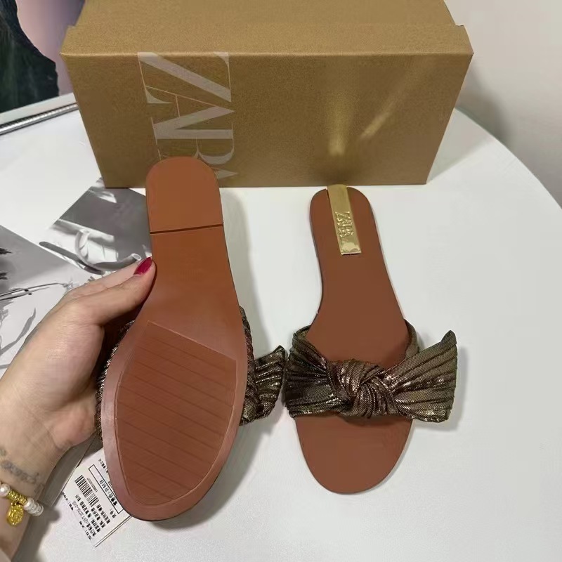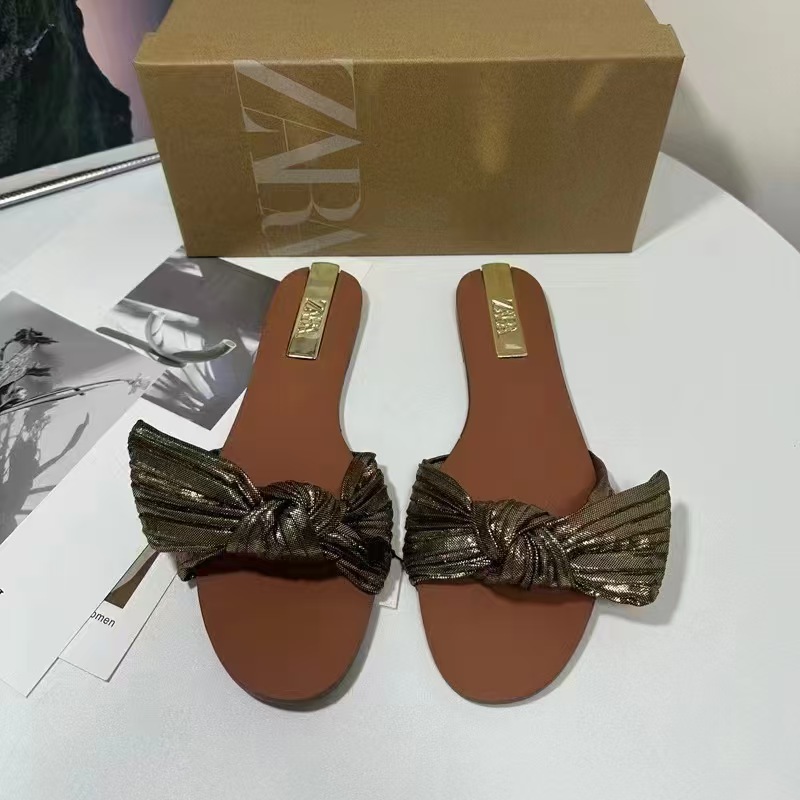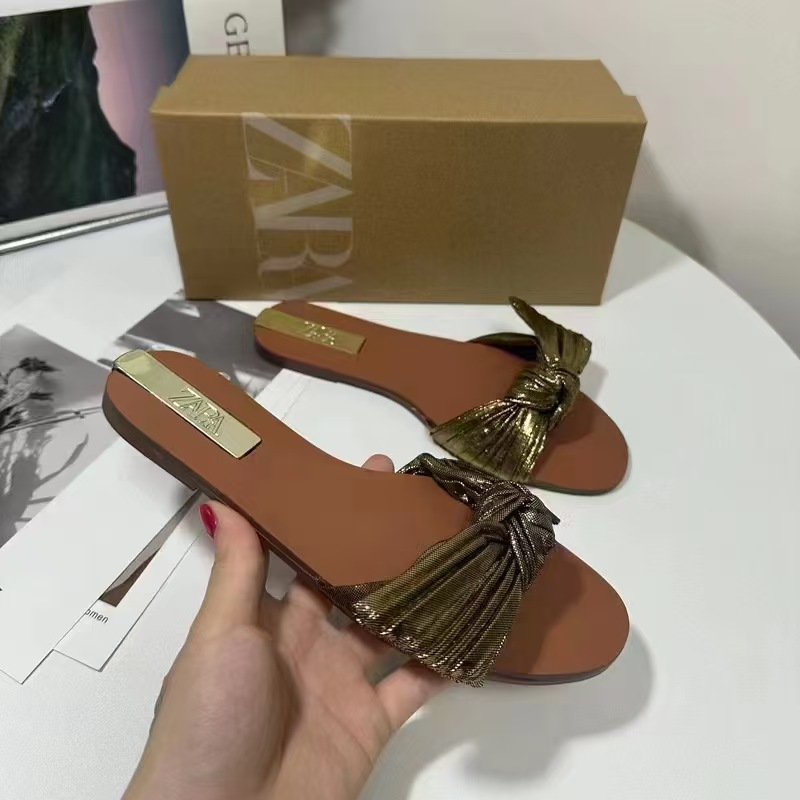 ZA 새로운 2024 여성을위한 활 금속 타이 후면 빈 빈 발가락 샌들을 가진 평면 유럽과 미국의 플러스 사이즈 여성 신발스토어 가기