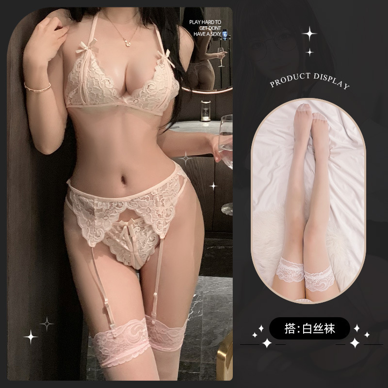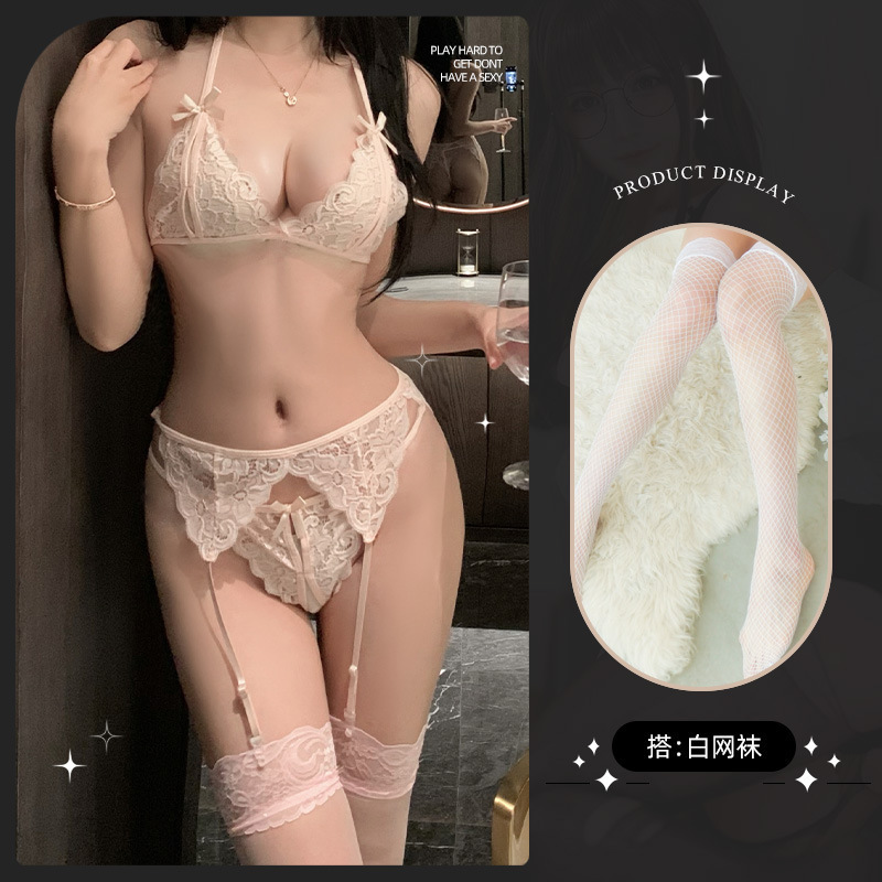• 핑크색 쓰리피스 세트 [브라+팬티+가터] (양말은 포함되지 않습니다)