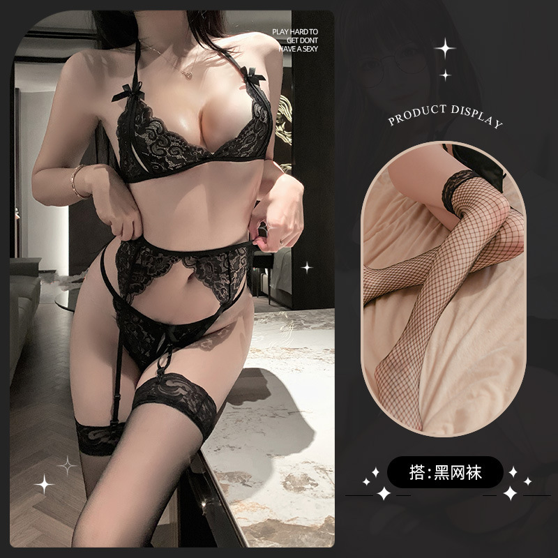 • 블랙 쓰리피스 세트 [브라+팬티+가터] (양말은 포함되지 않습니다)