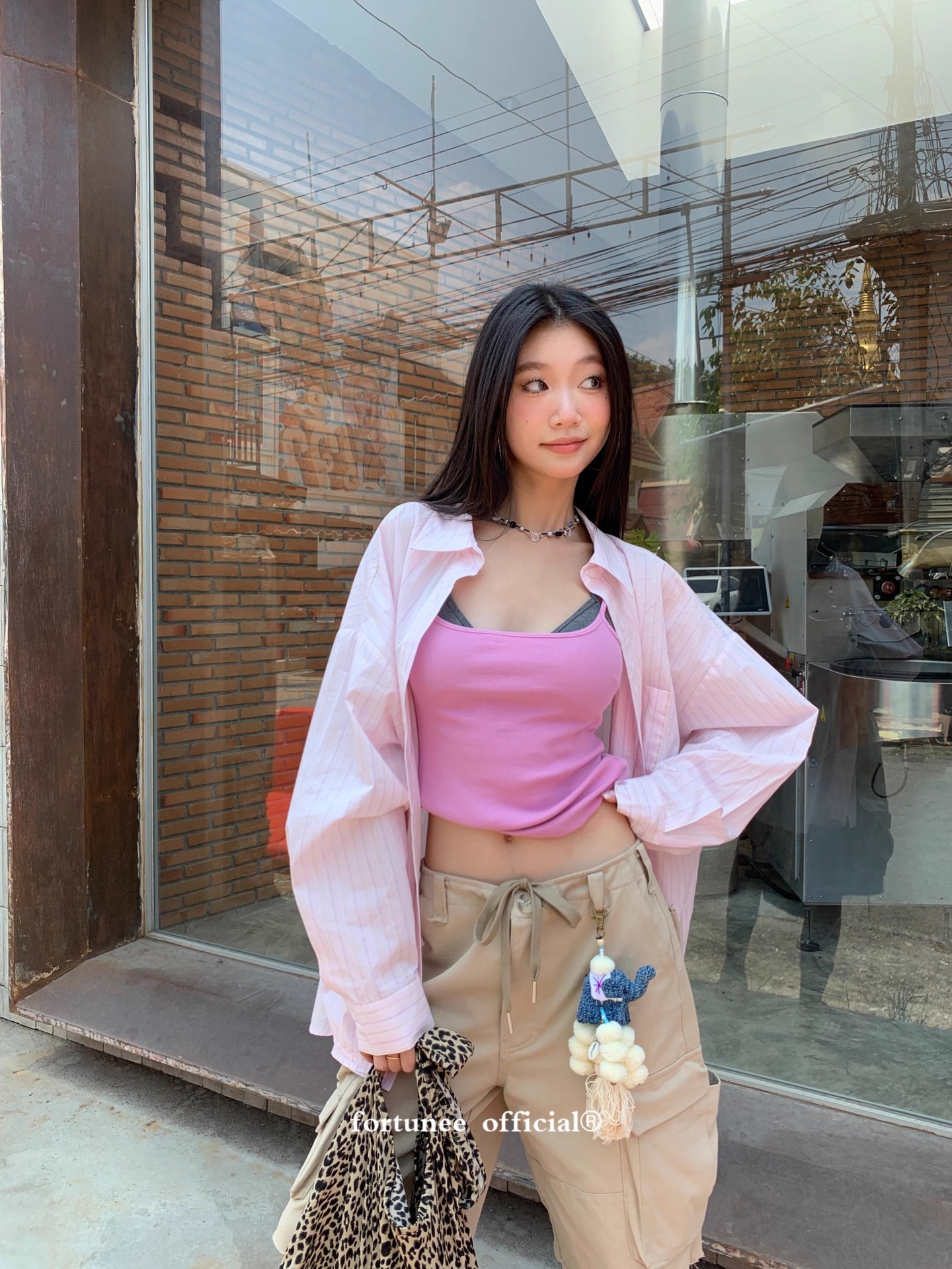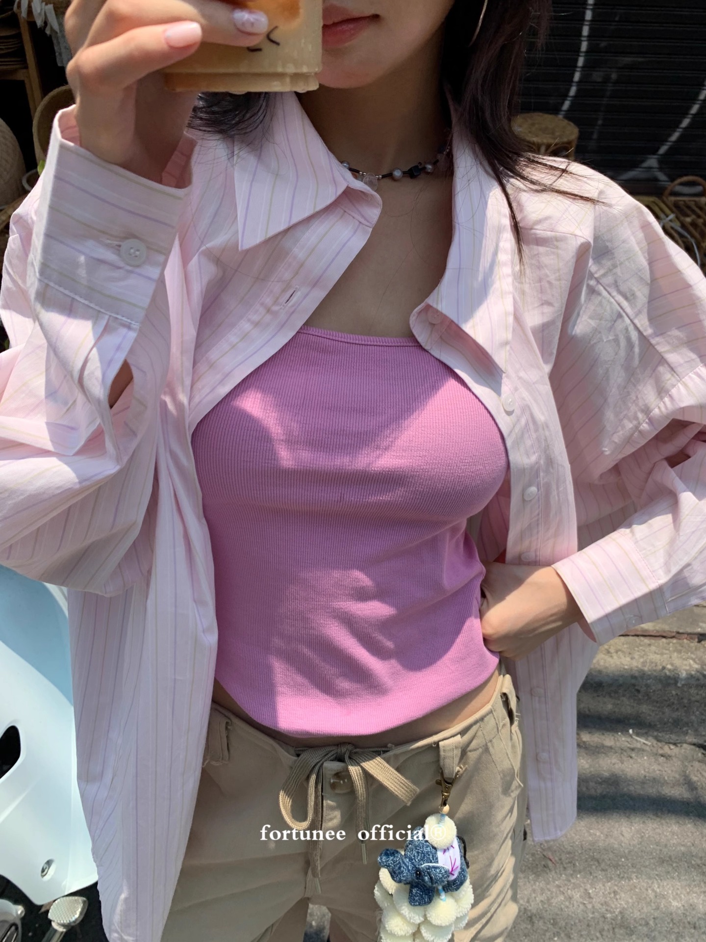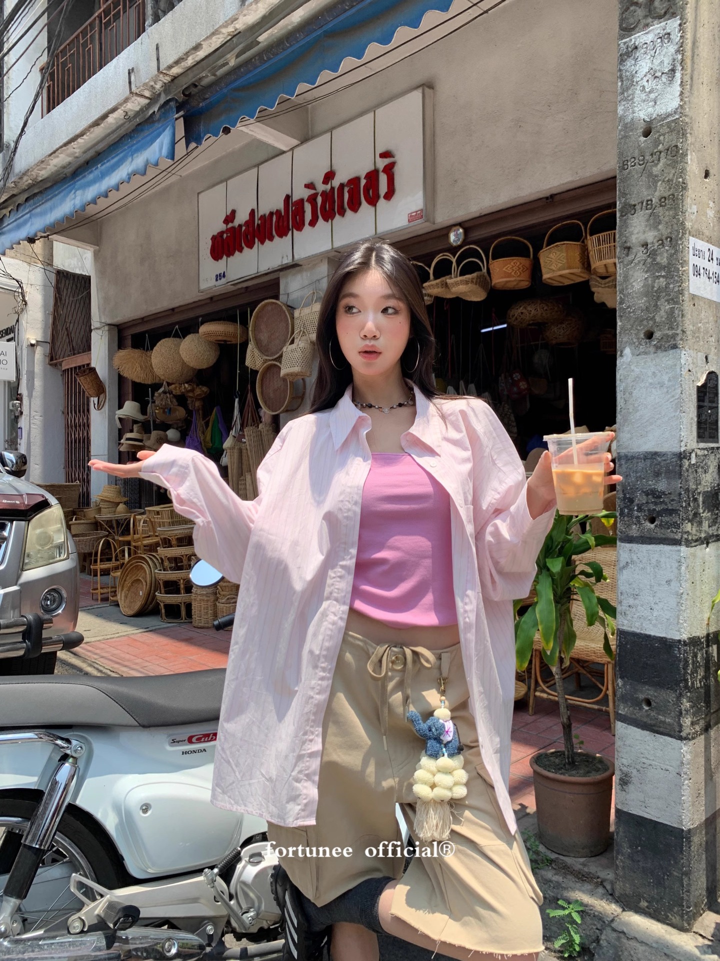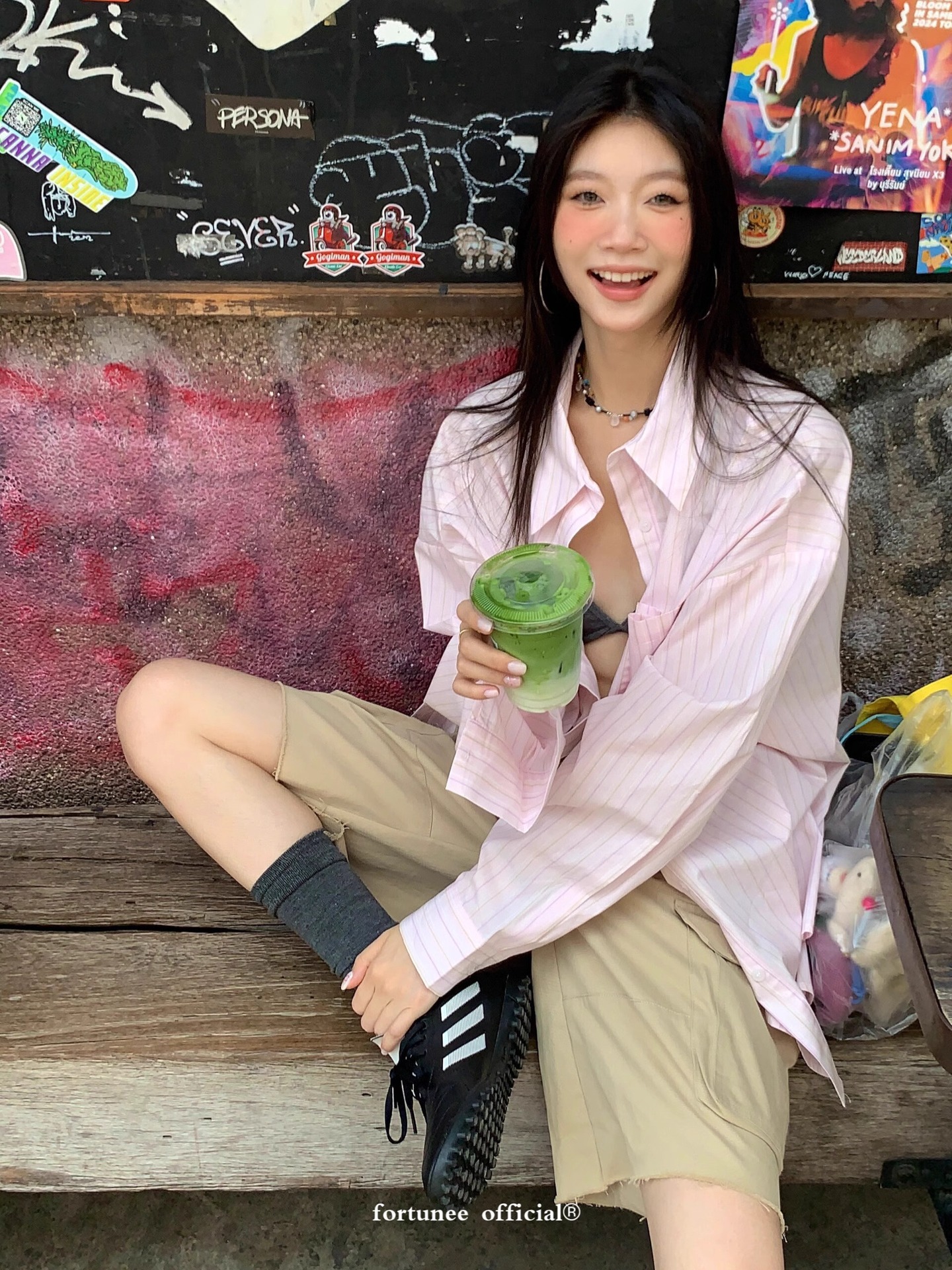 3062 # 포춘 핑크 스트라이프 셔츠 루즈핏 다용도 캐주얼 탑 독특한 셔츠 자외선 차단 긴팔스토어 가기