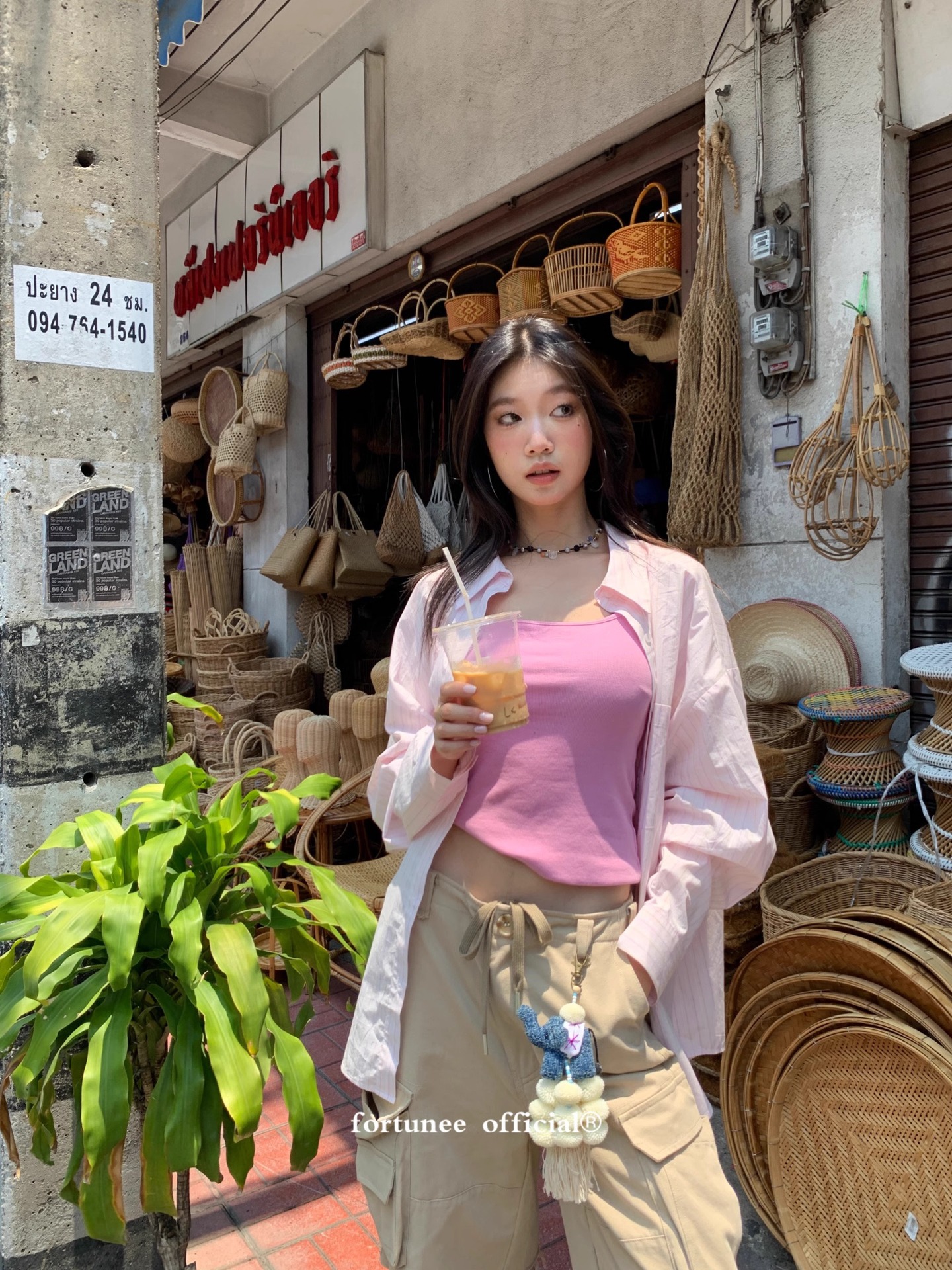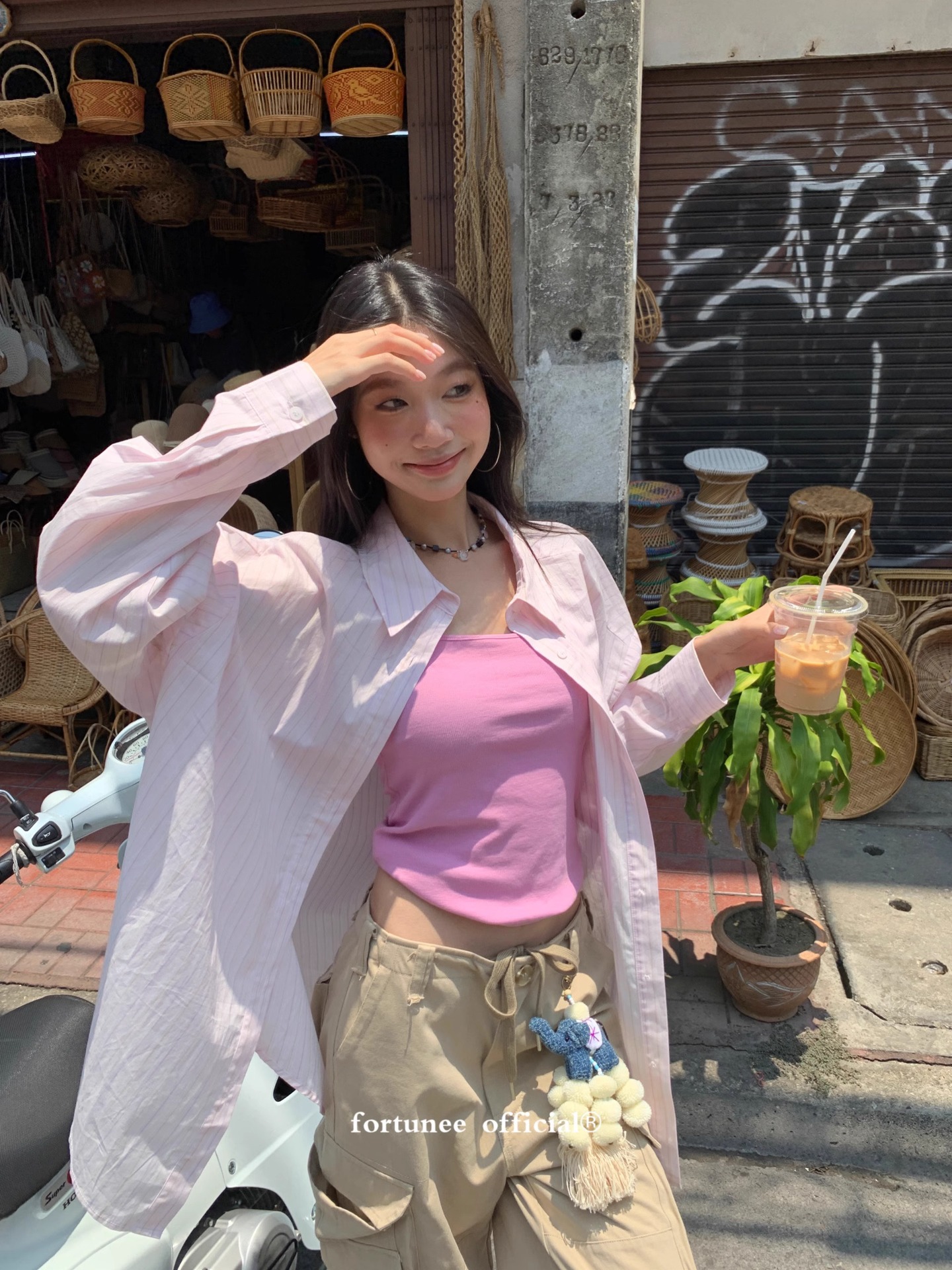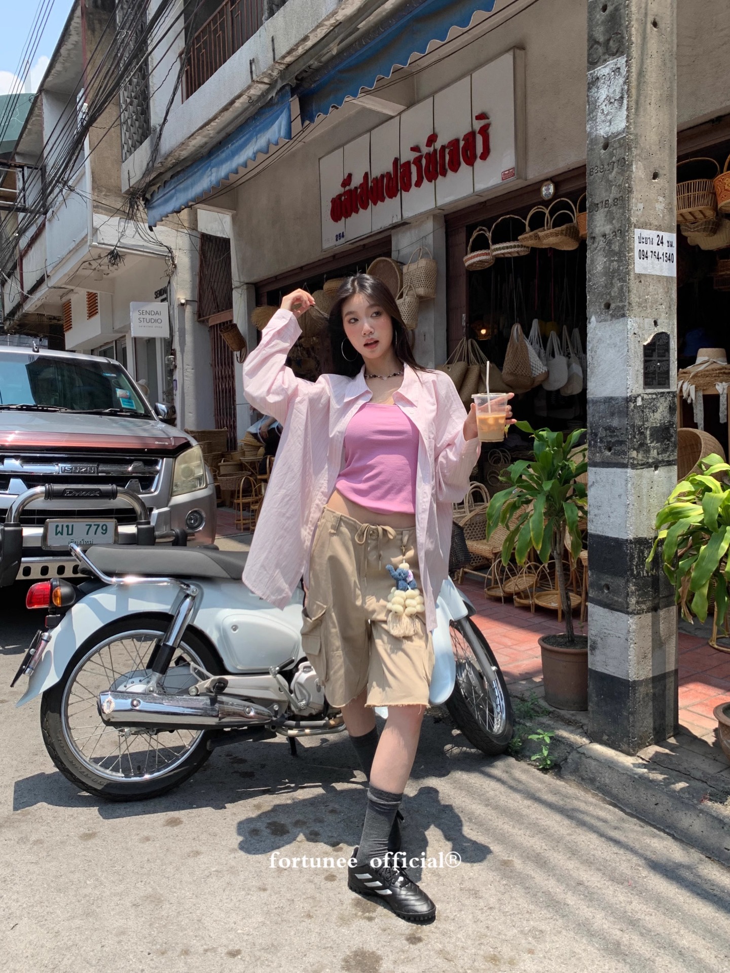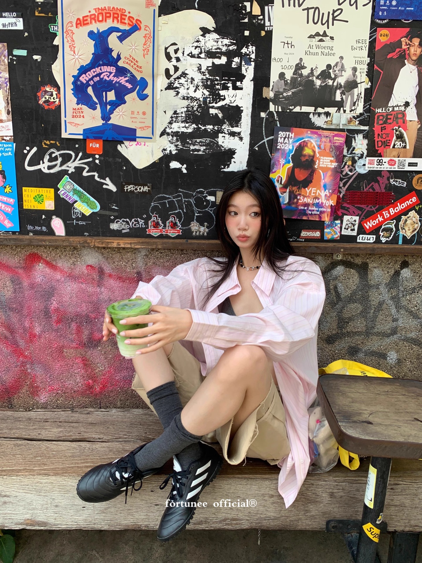 3062 # 포춘 핑크 스트라이프 셔츠 루즈핏 다용도 캐주얼 탑 독특한 셔츠 자외선 차단 긴팔스토어 가기