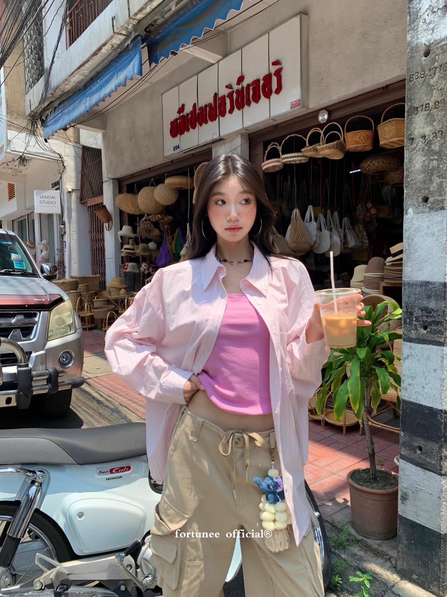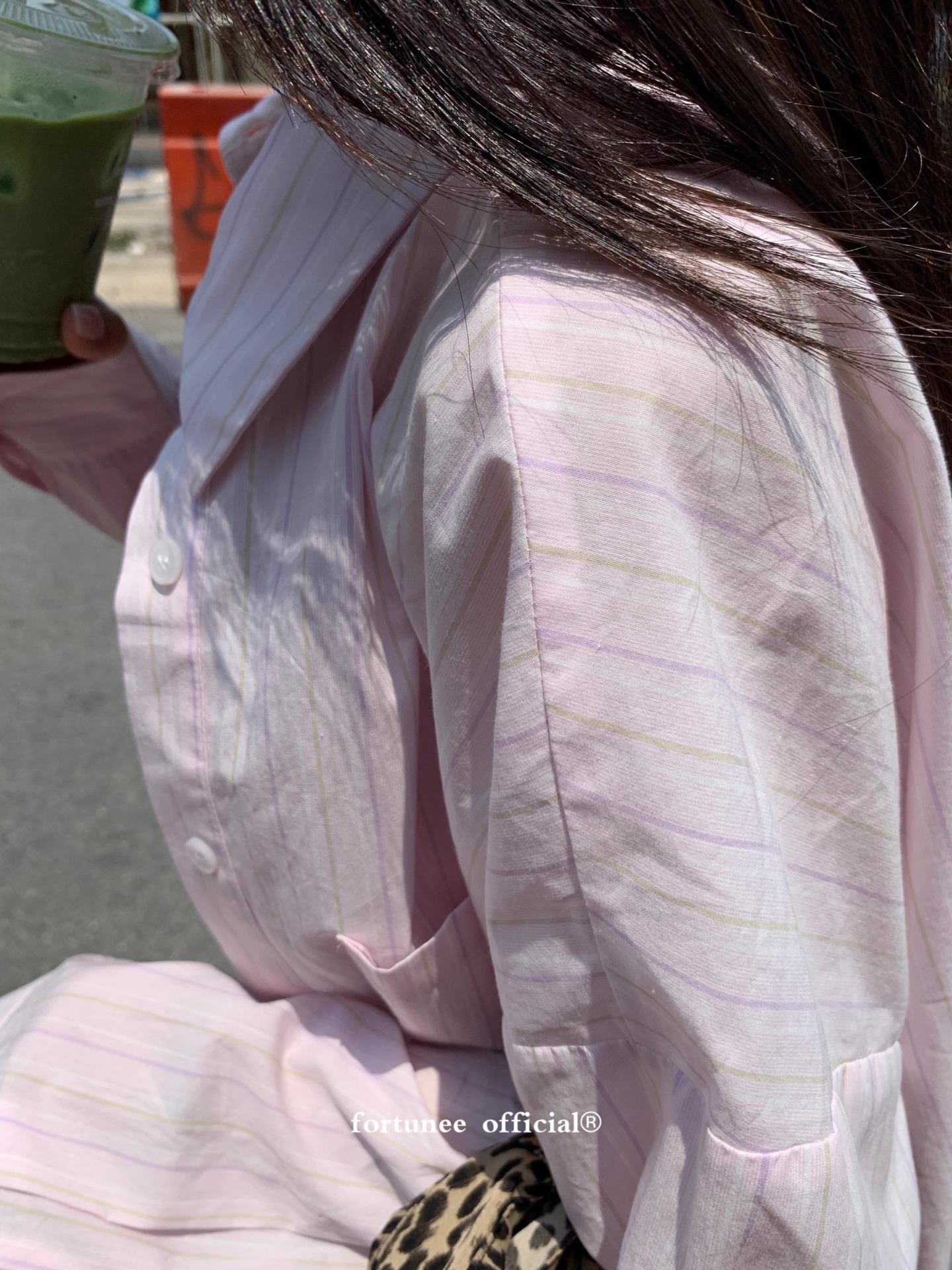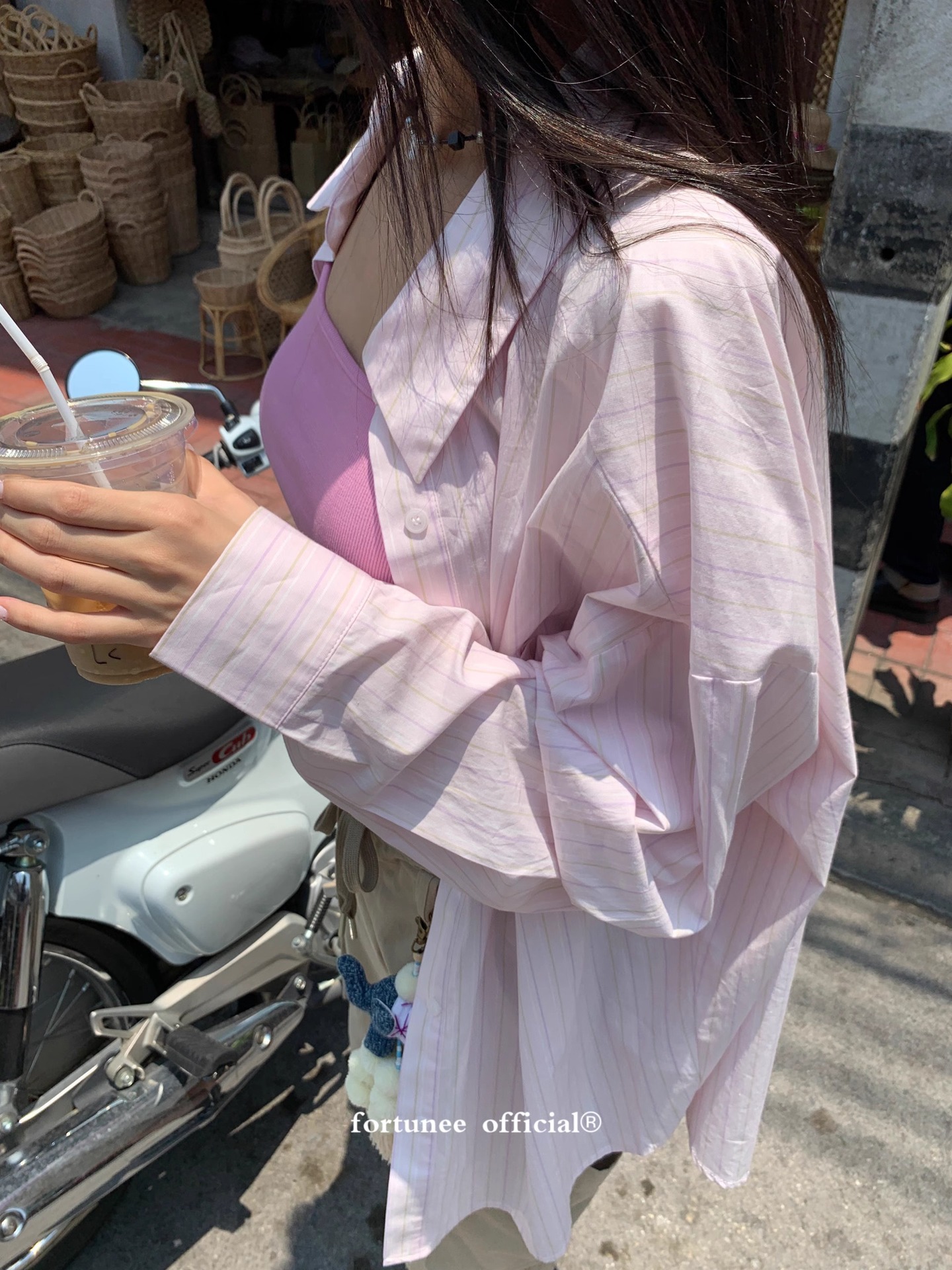 3062 # 포춘 핑크 스트라이프 셔츠 루즈핏 다용도 캐주얼 탑 독특한 셔츠 자외선 차단 긴팔