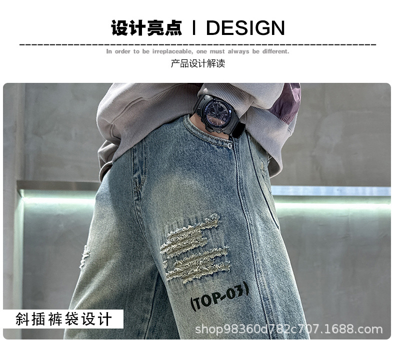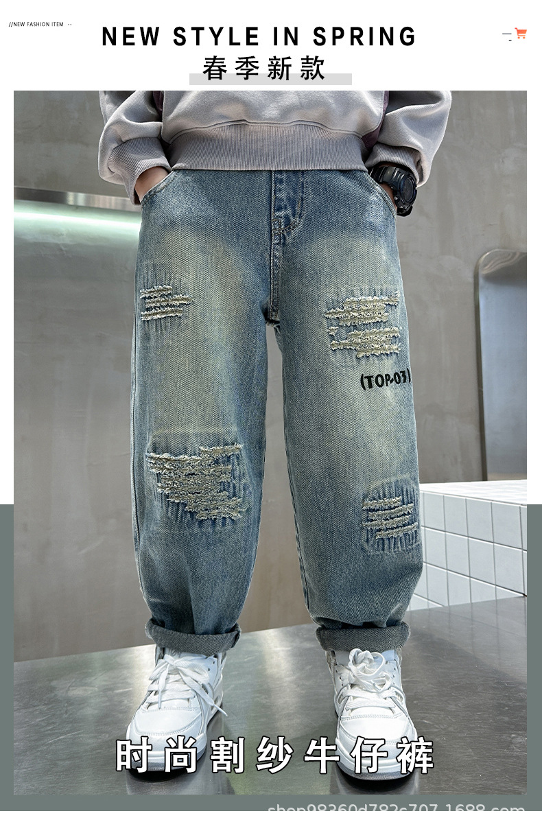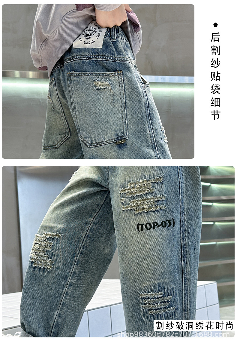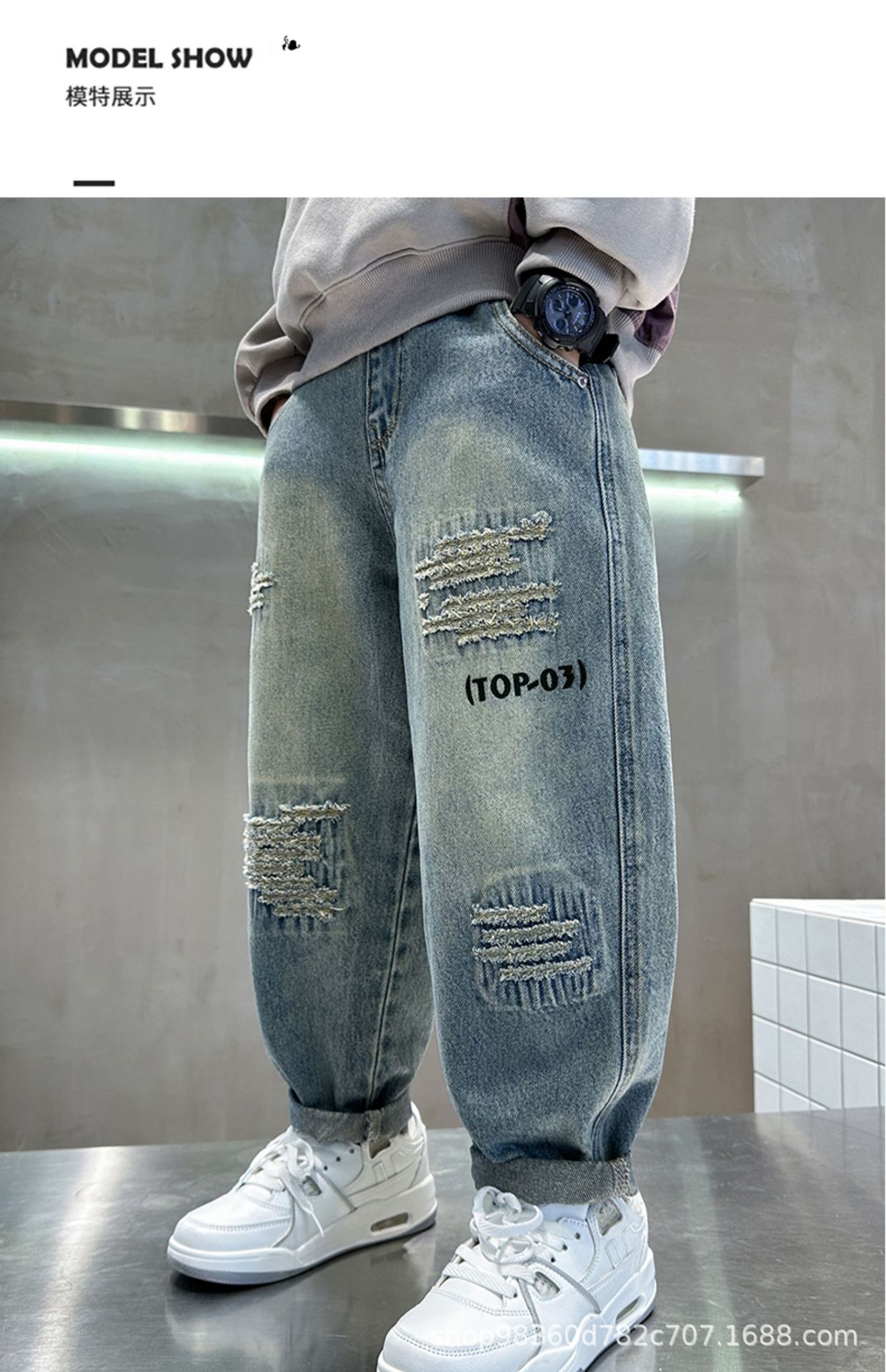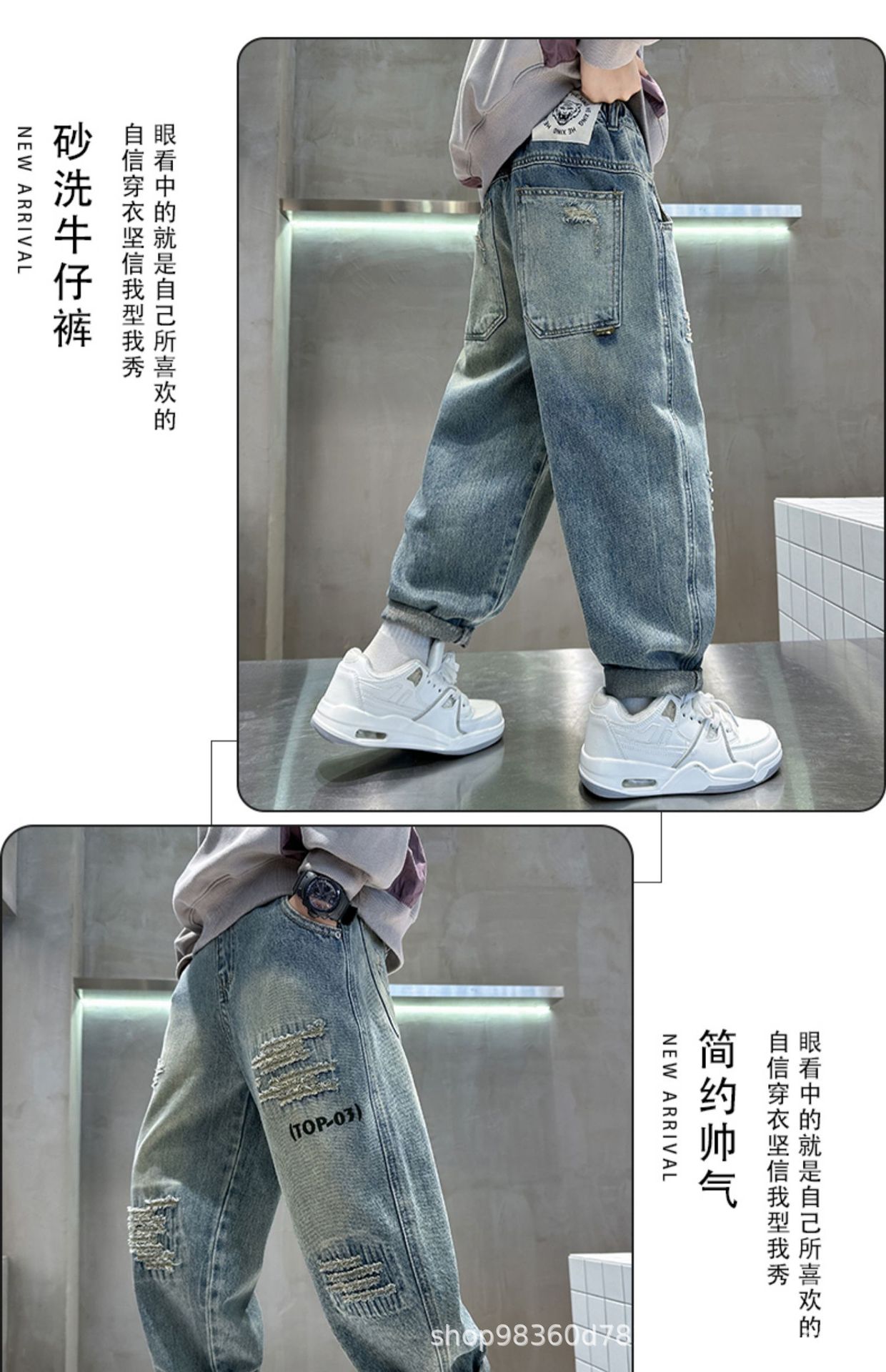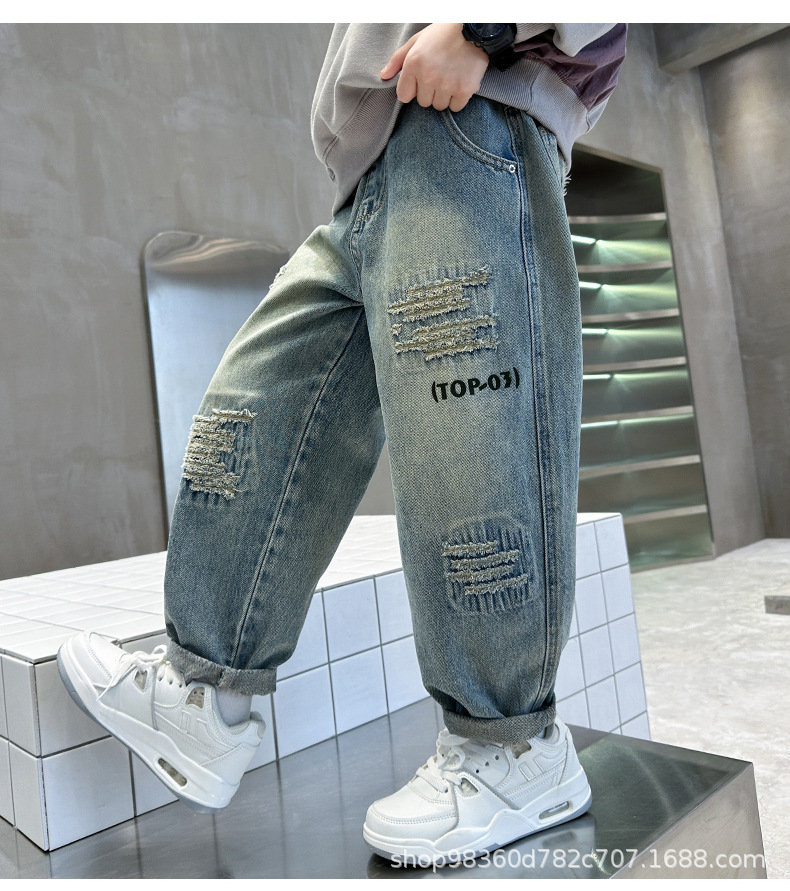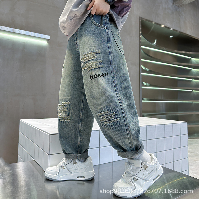 어린이 소년의 청바지 2025 년 봄과 가을 새로운 얇은 튀김 거리 더미 잘 생긴 봄과 여름 봄 트렌디 바지스토어 가기