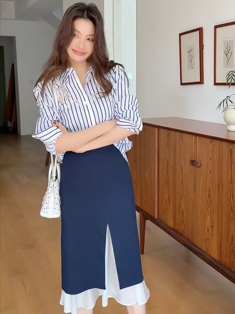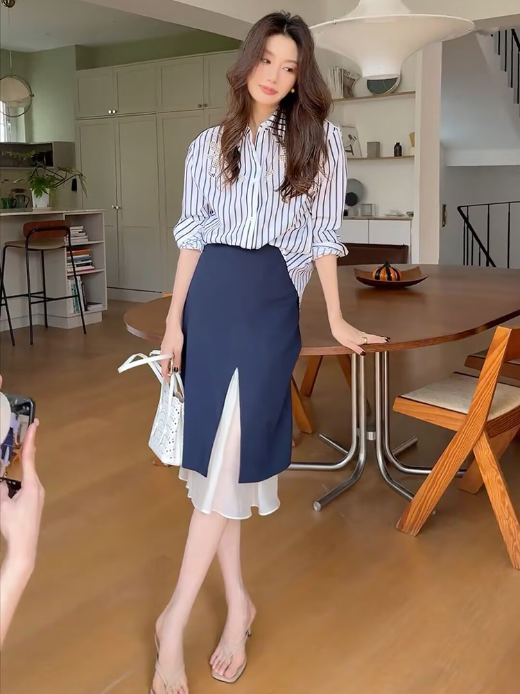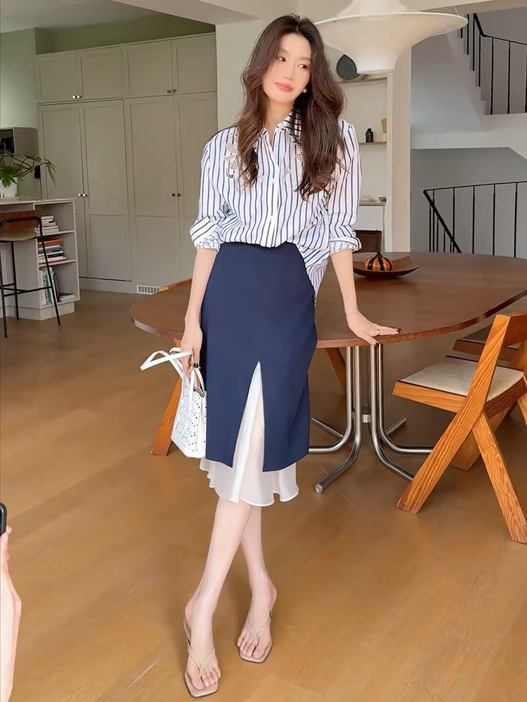 여름 아름다운 세트 여성을위한 우아한 두 조각 세트 작은 독특한 아름다운 줄무늬 셔츠 착용스토어 가기