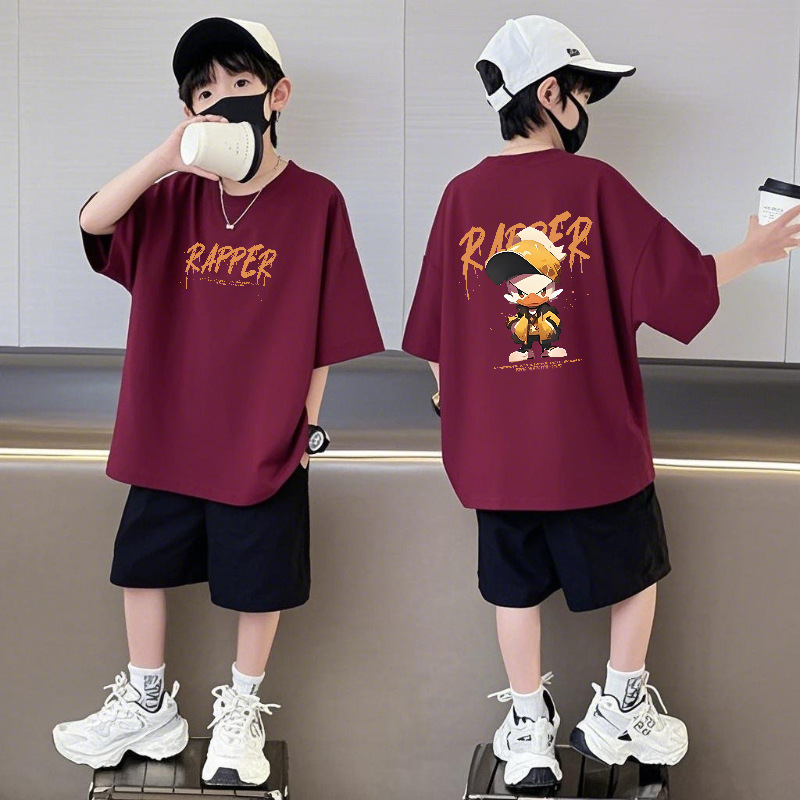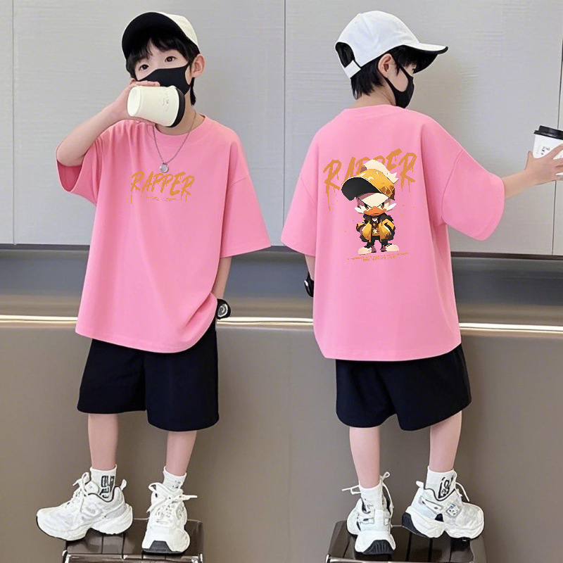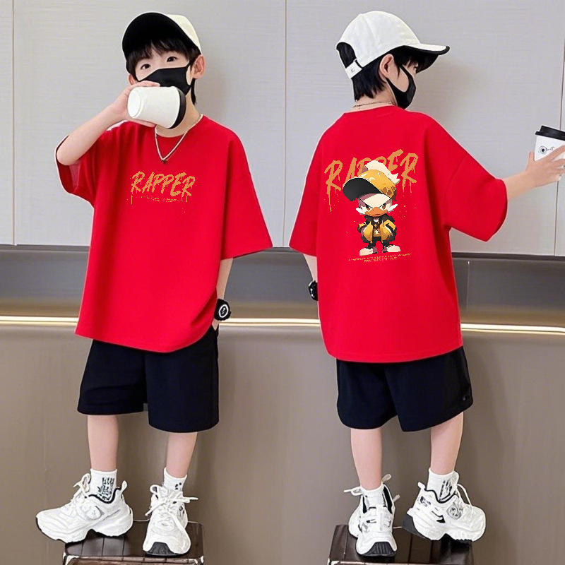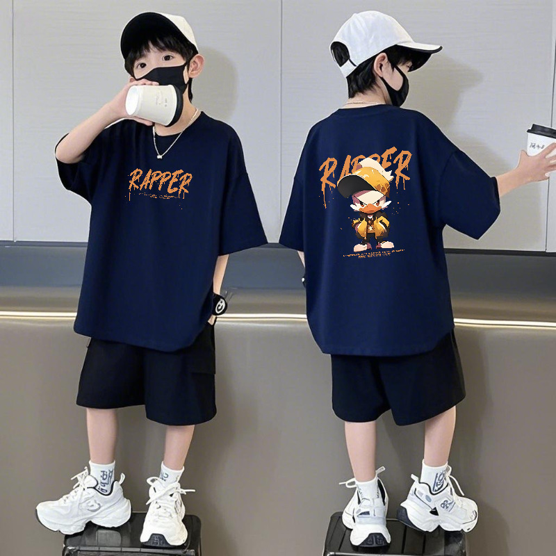 순면 반팔 반바지 소년 정장 어린이 느슨한 라운드 넥 여름 새로운 스타일 중대형 어린이 유행 투피스 세트