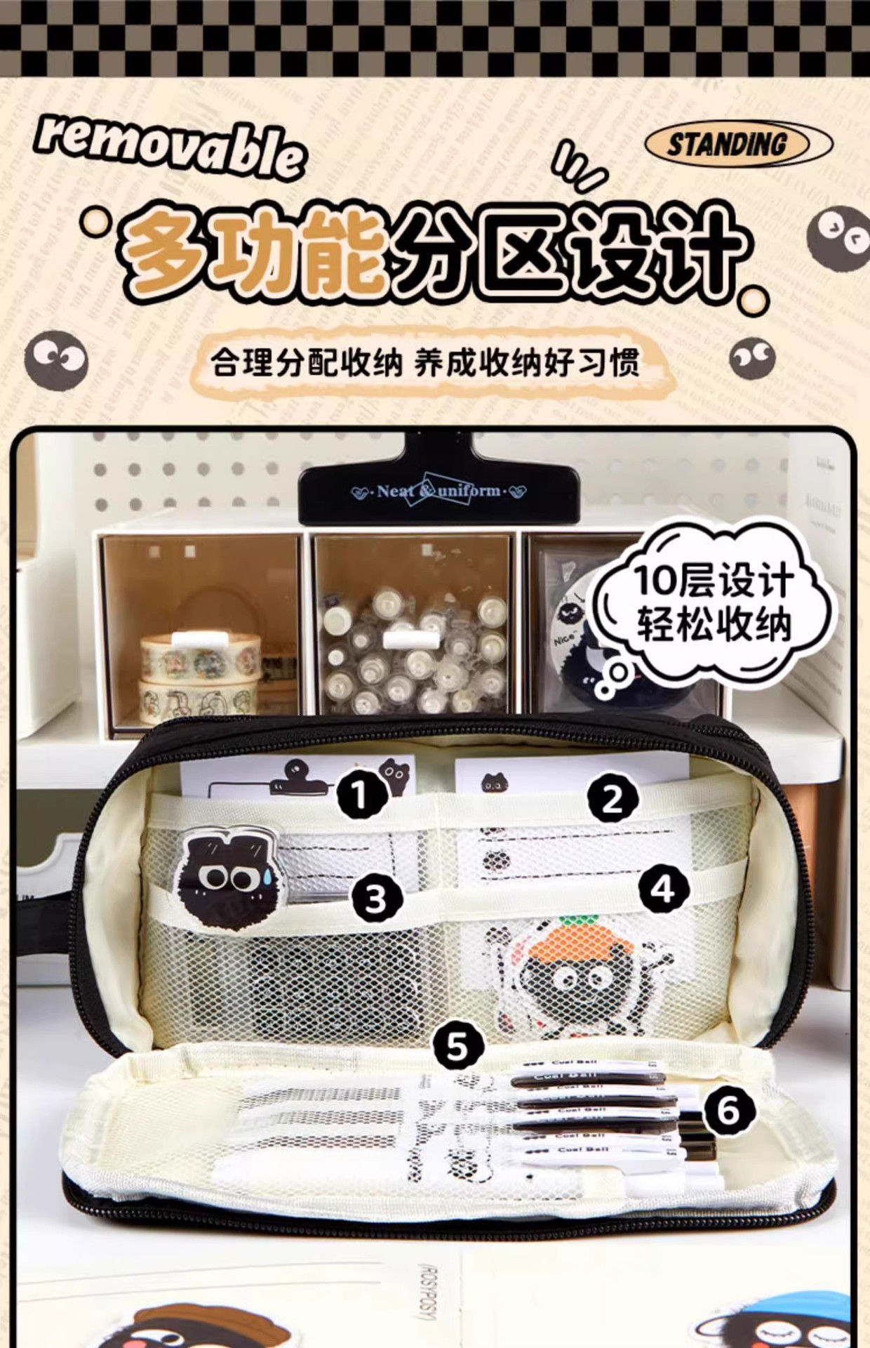 • [탈부착형 10단 투명 필통] 베이지