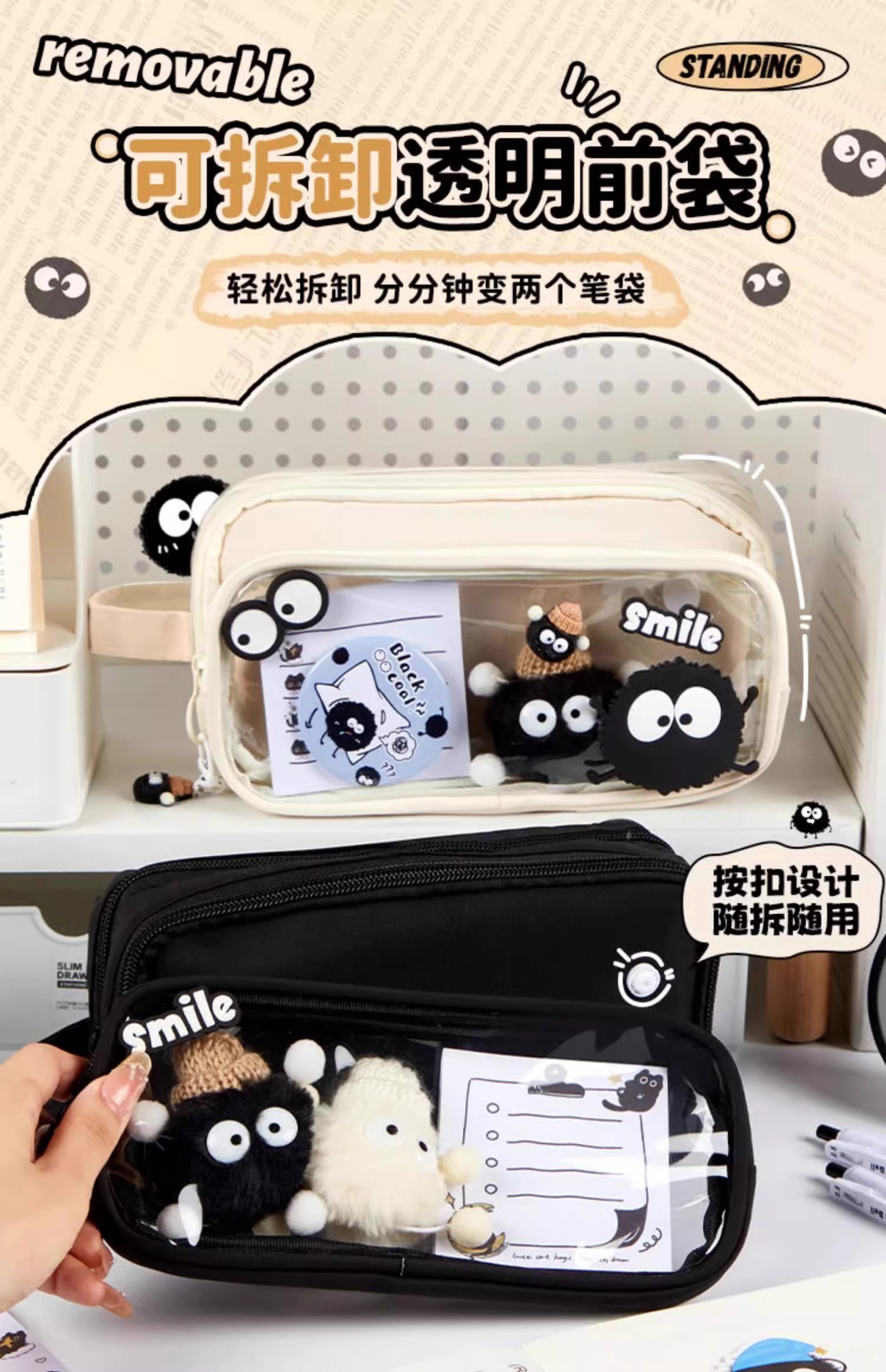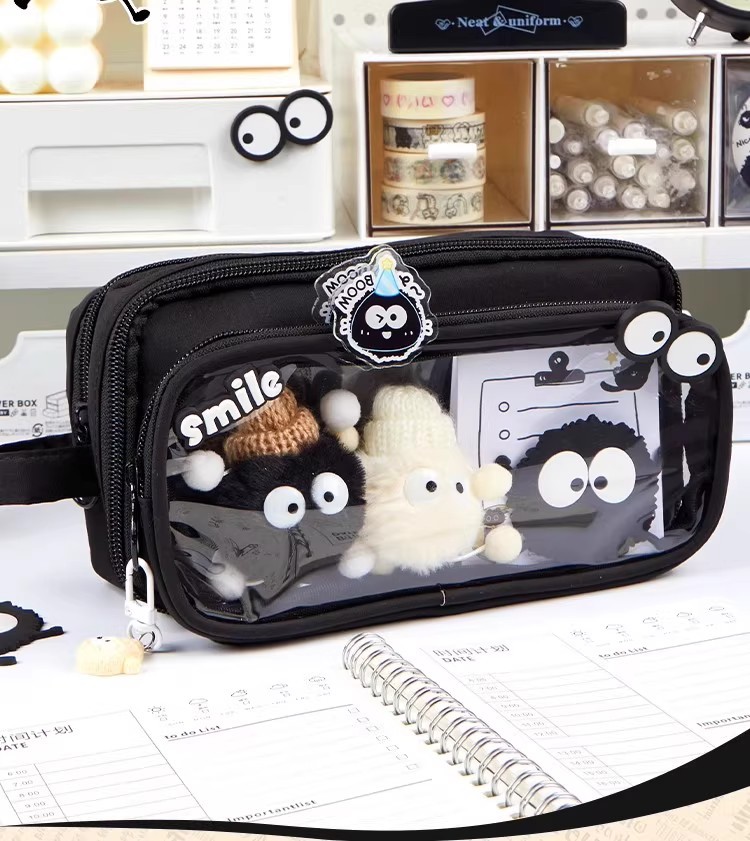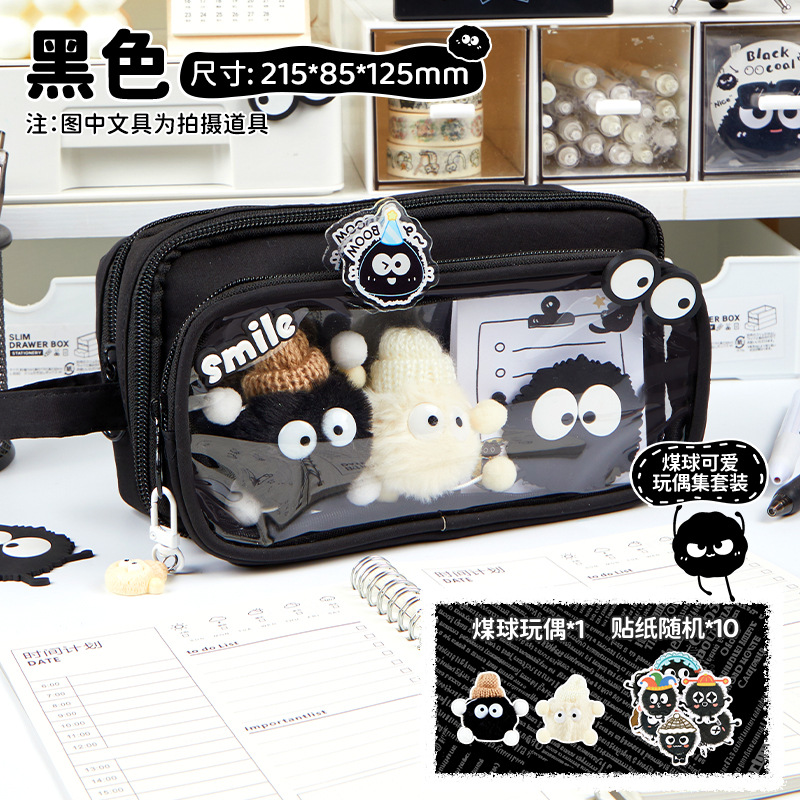 • [귀여운 인형 컬렉션 세트] 쿨 블랙 필통/10단 탈부착 가능 + 연탄 인형 + 스티커*10