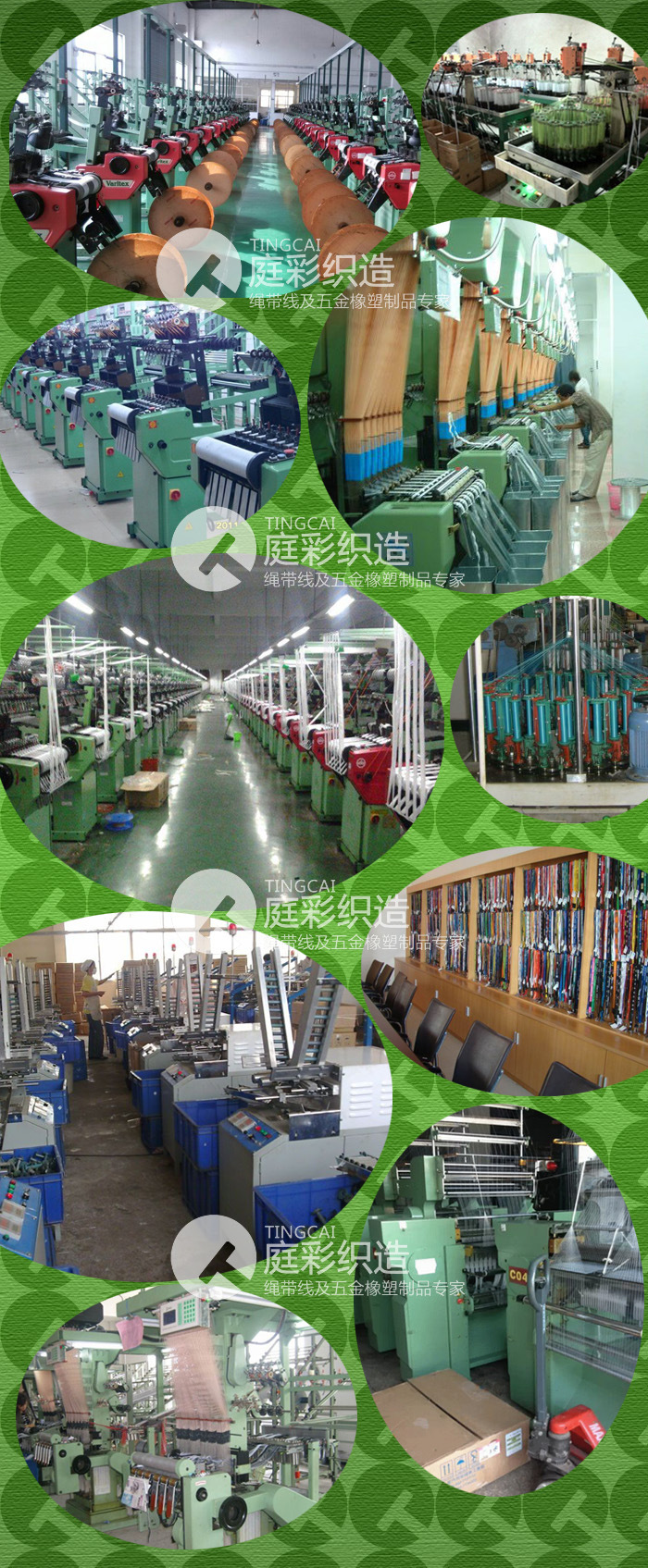 工厂配置有:针通机, 走马机,扭绳机,无梭机.提花机和各种8股、12锭、16锭、24 锭、32锭、48锭等各种编织机。另有大量人工及后加工机械, 可定制各种手工艺品,如流苏、排须、挂绳、鞋带、手提绳、 中国结、毛球等。