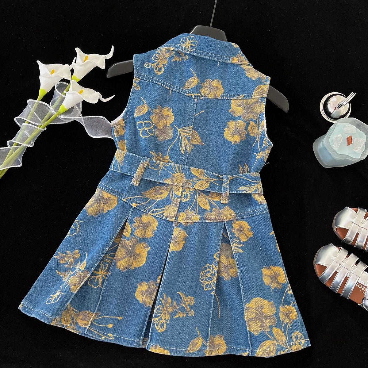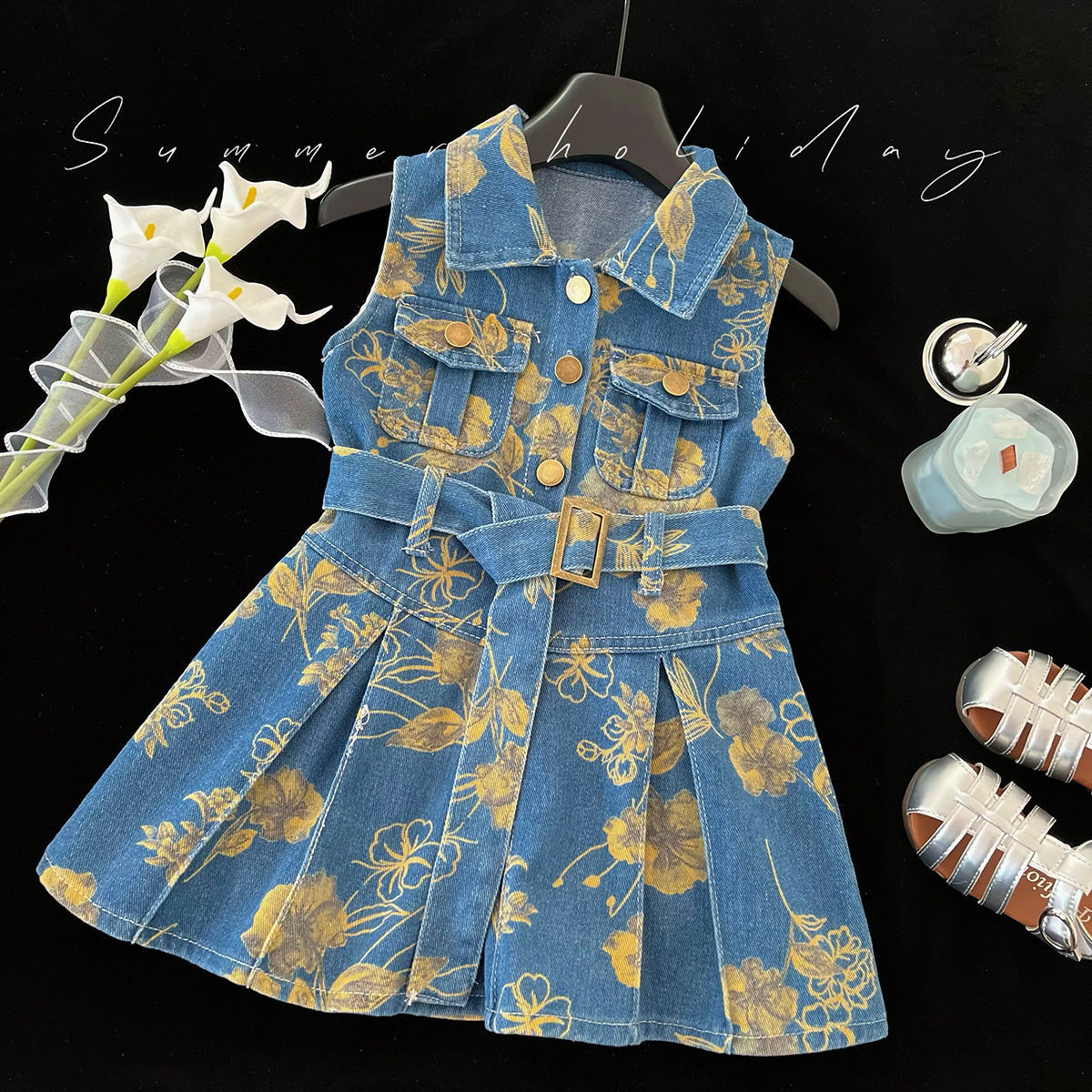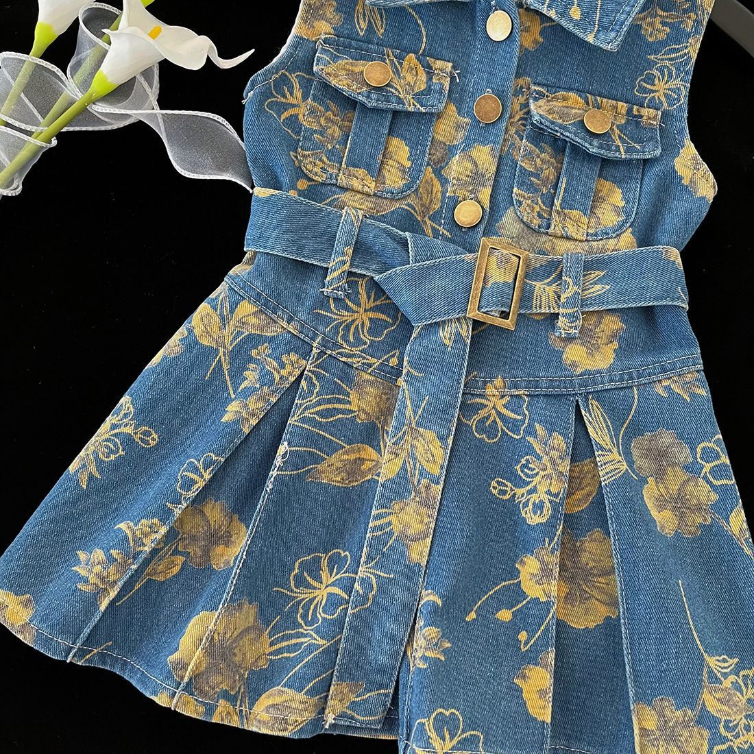 2025 새로운 여자 얇은 데님 드레스 여름 인기 꽃 폴로 칼라 조끼 드레스 트렌디 쿨 작업복 스커트스토어 가기
