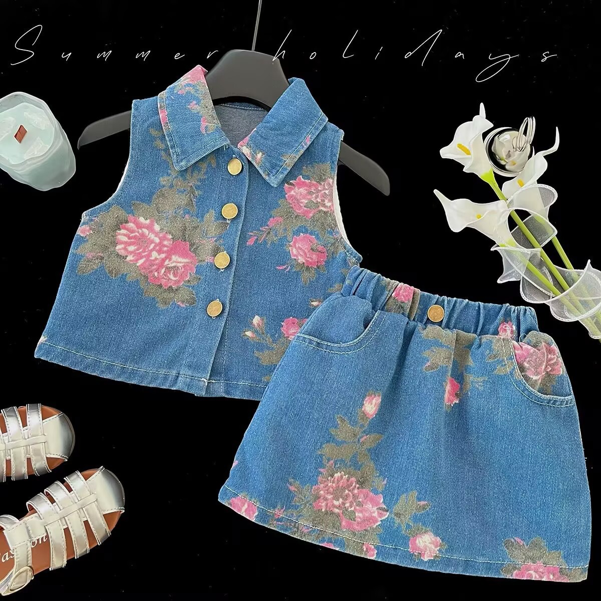 여자 세트 여름 2025 새로운 도착 인쇄 데님 조끼 아기 소녀를위한 최고 짧은 치마 민소매 캐주얼 투피스 세트