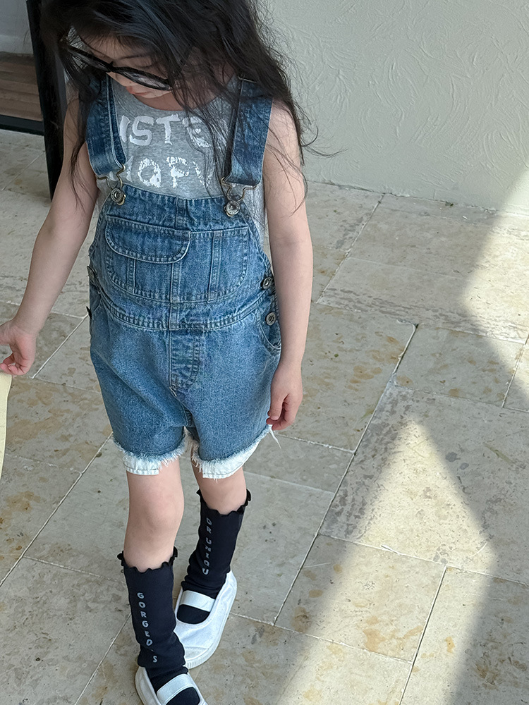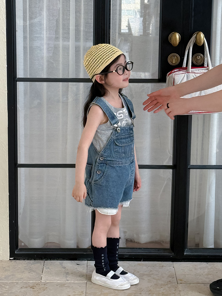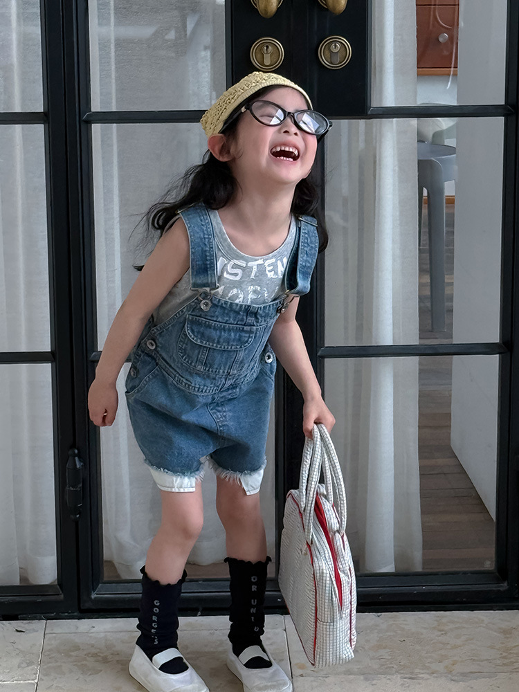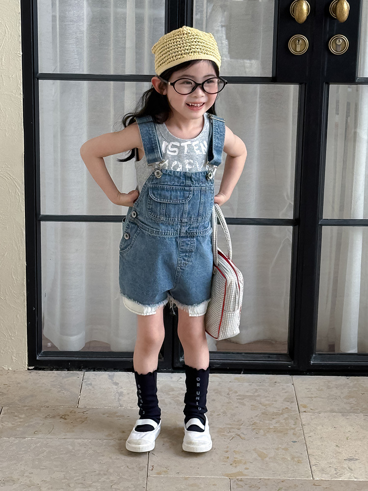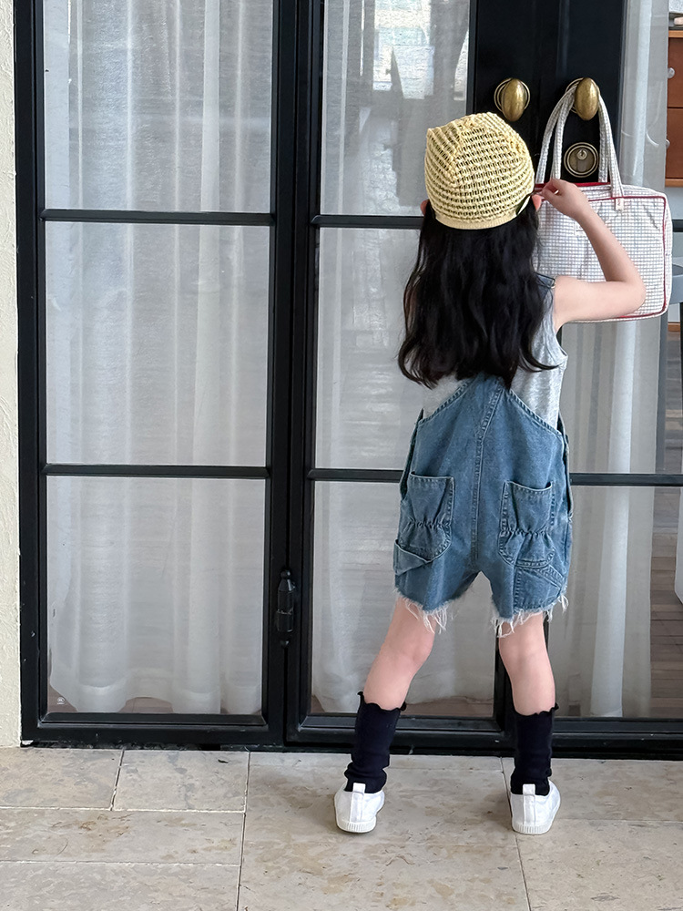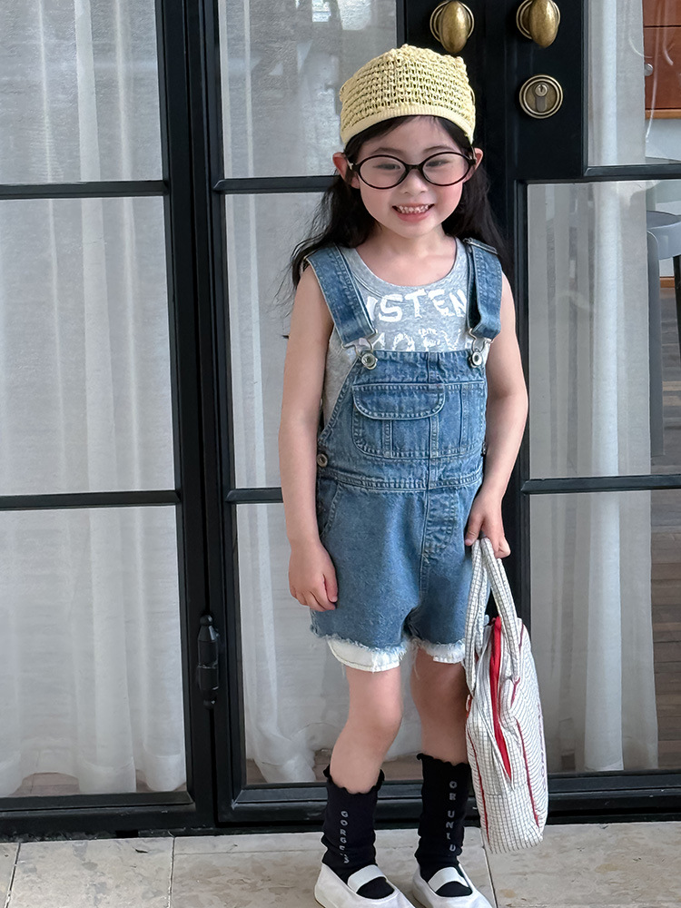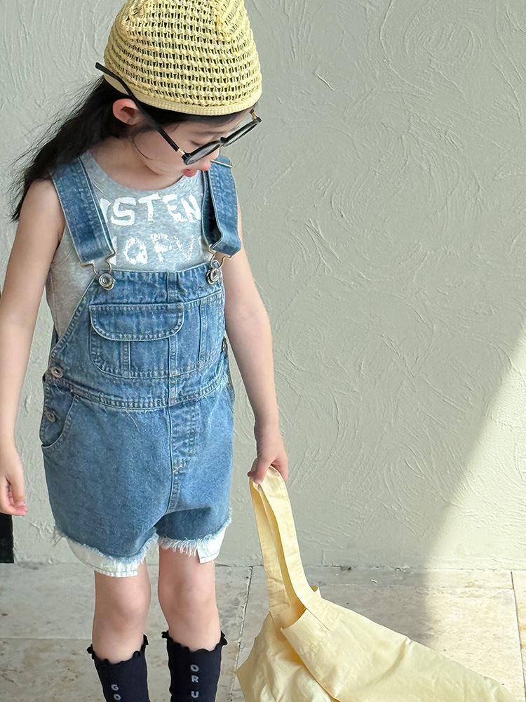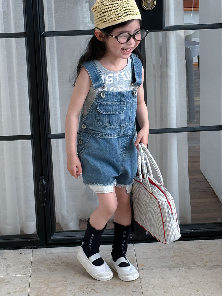 어린이 DD 동일 스타일 데님 스트래피 팬츠 2025 여름 새로운 한국 스타일 소년 및 소녀 데님 모피 가장자리 반바지스토어 가기