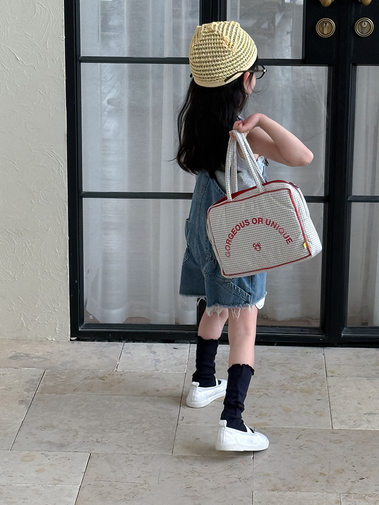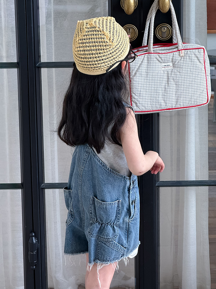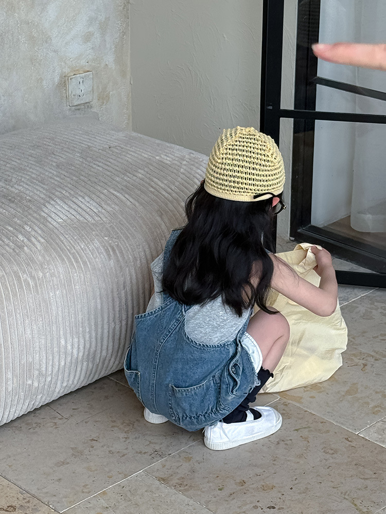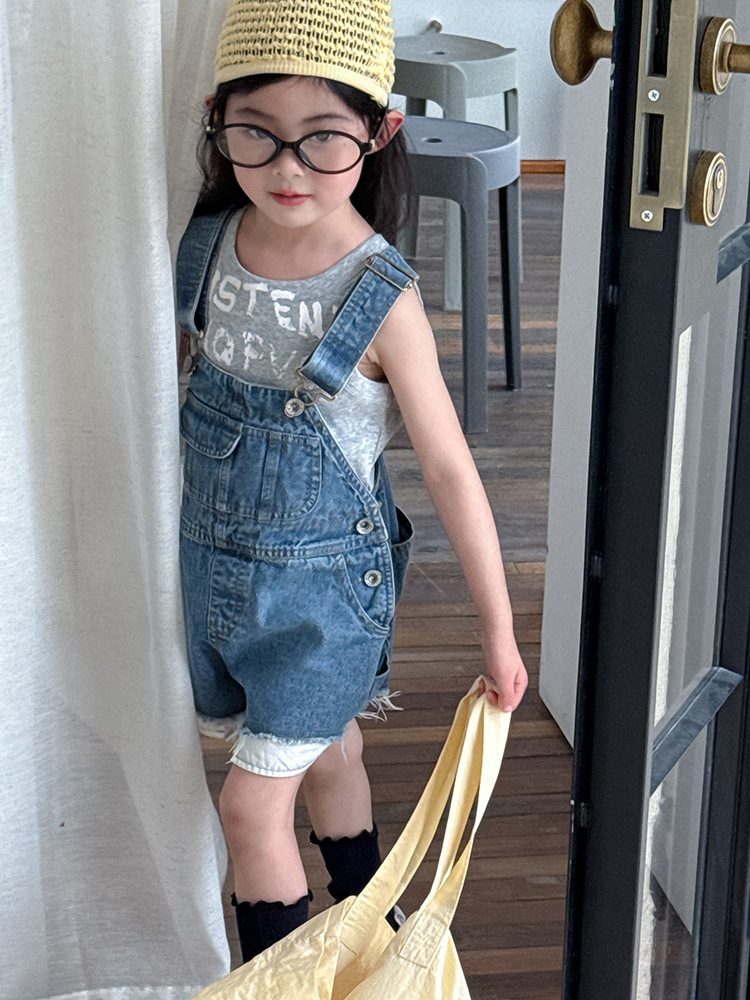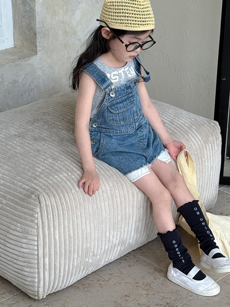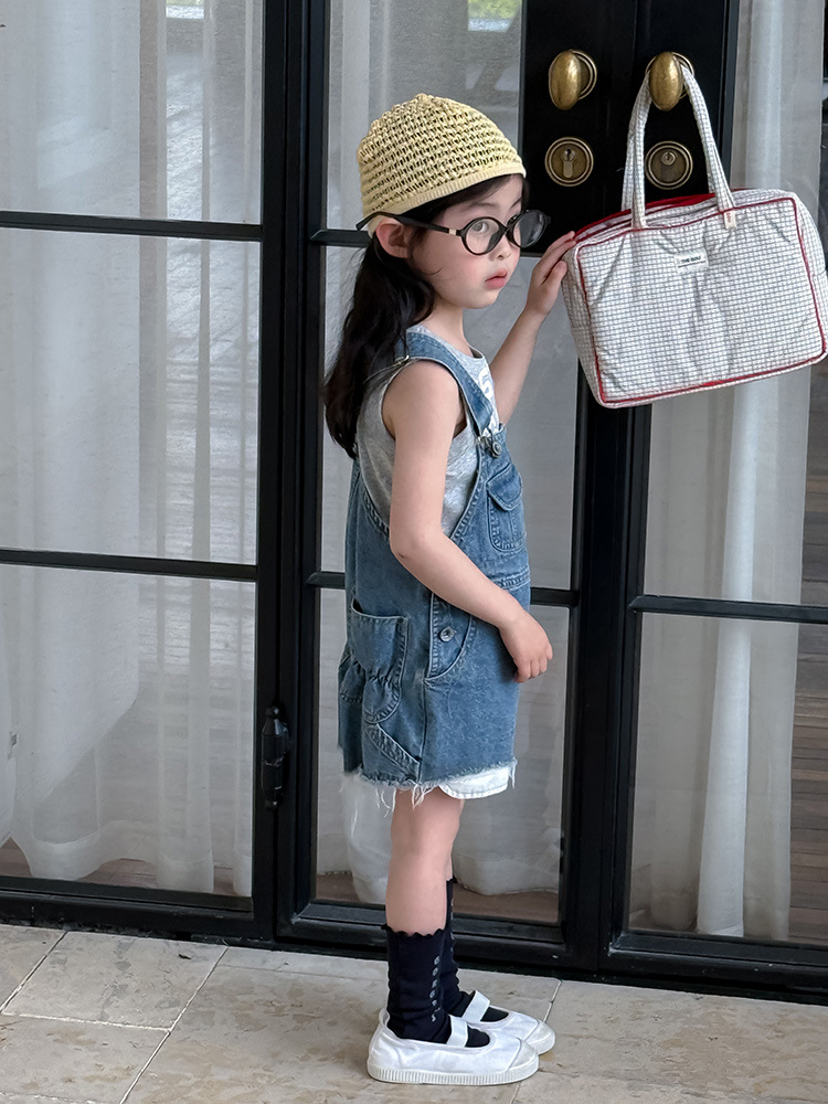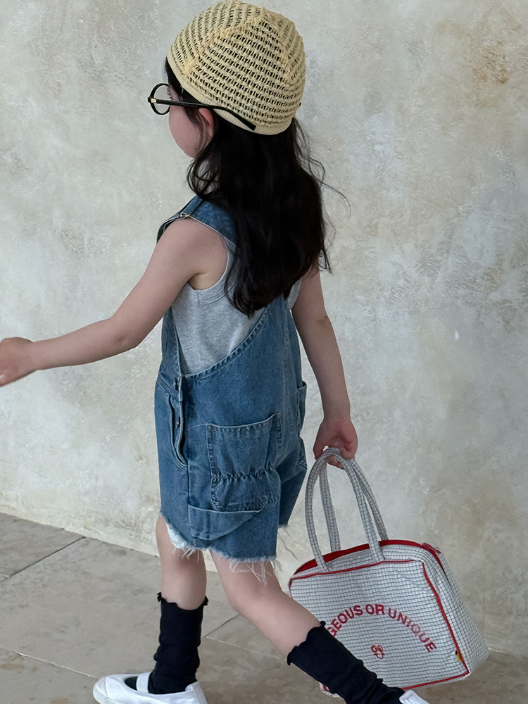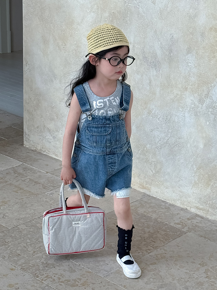 어린이 DD 동일 스타일 데님 스트래피 팬츠 2025 여름 새로운 한국 스타일 소년 및 소녀 데님 모피 가장자리 반바지스토어 가기