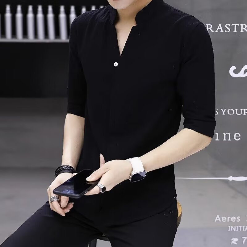 중국 스타일 스탠드 칼라 남성 셔츠 봄 여름 한국 스타일 미드 슬리브 슬림 핏 핸섬 인치 셔츠 트렌디 캐주얼 비즈니스 반팔 셔츠스토어 가기