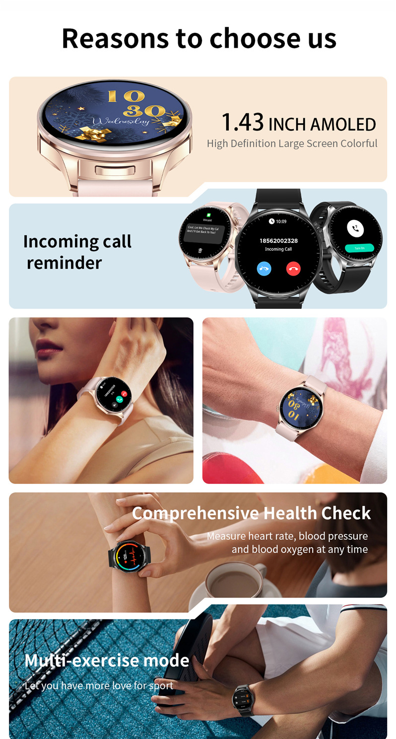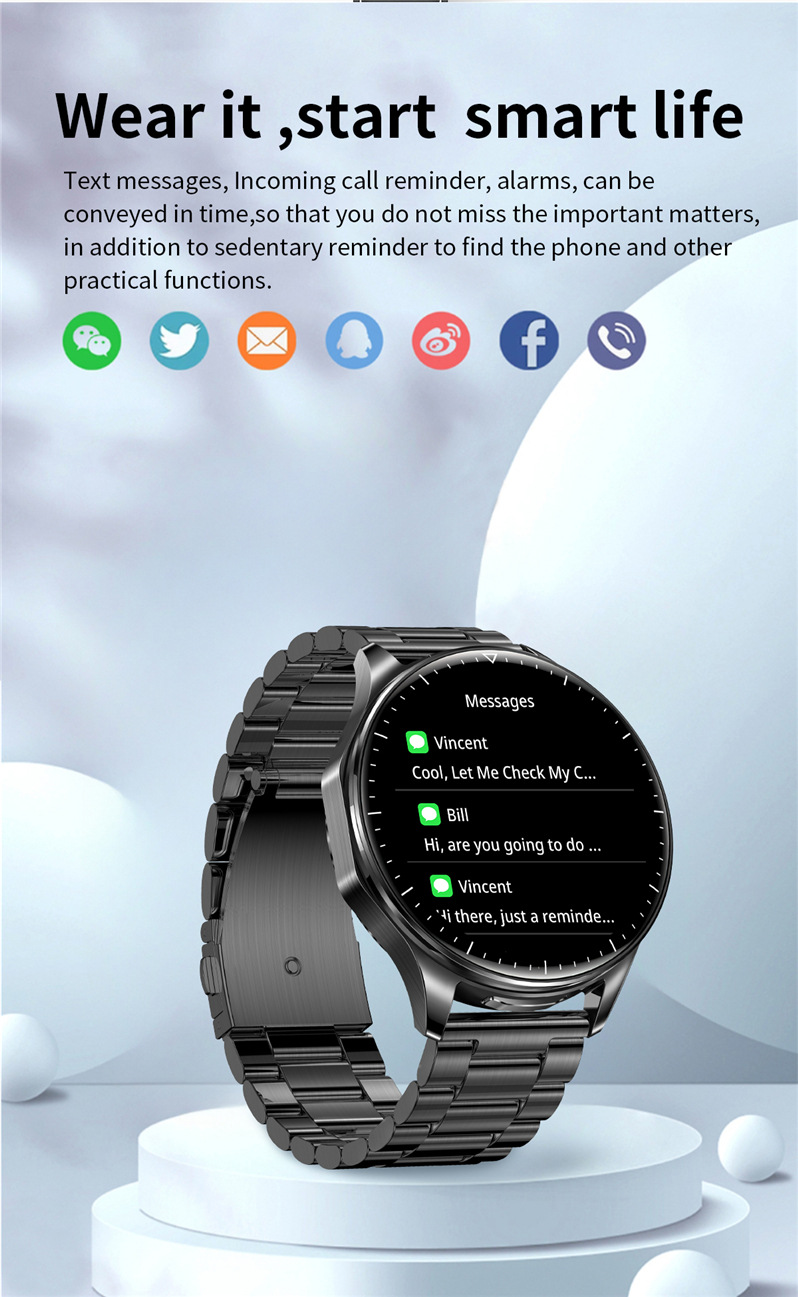 产品卖点推荐(智能手表部分) | 商务外观,金属工艺,TPU高档高务运动风表带,全圆全触+机械按键操作双项操作,3套UI风格,BLE5.0版本,300mAH实容大电池,智能手表具有24小时精准检测心率,血压监测,血氧监测,运动监测,里程,卡里路消耗,消息提醒,睡眠记录,消息提醒,摇控拍照,海量免费表盘下载及DIY表盘制作。 | ||