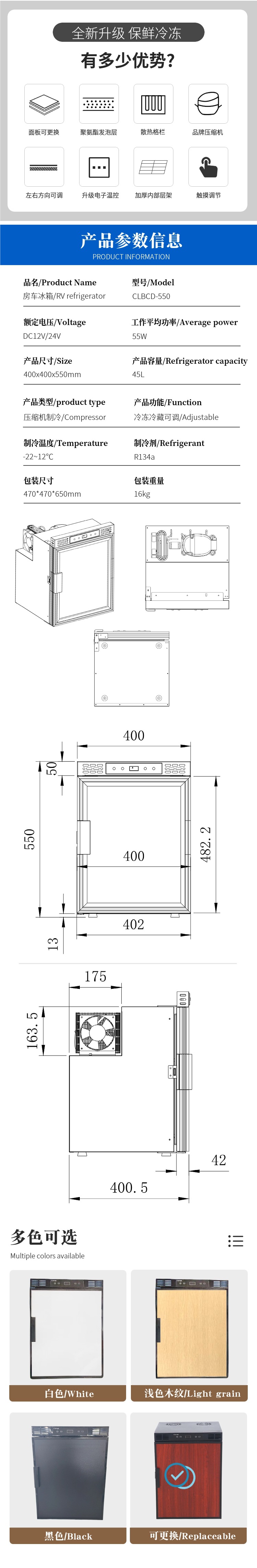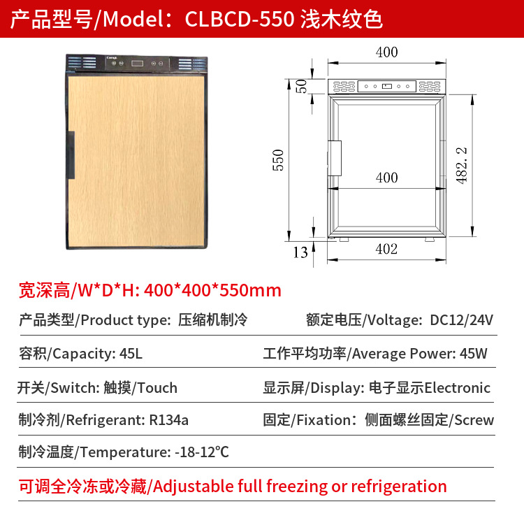 • 400x400x550mm 밝은 나뭇결 색상, 전자 스크린, 조절 가능한 완전 냉장 및 냉동