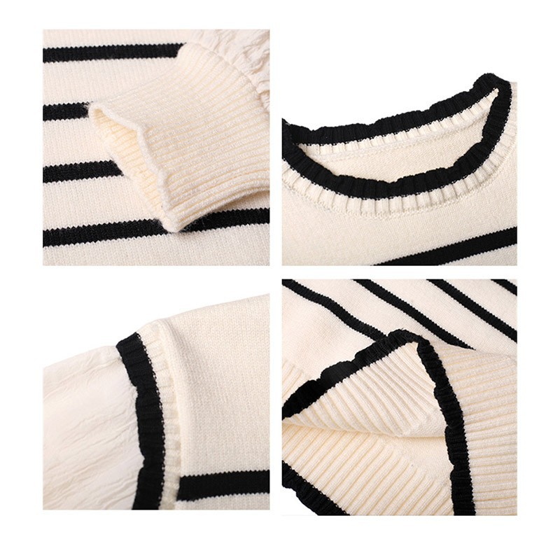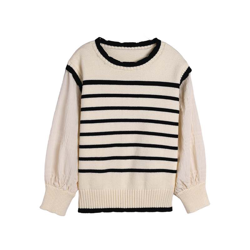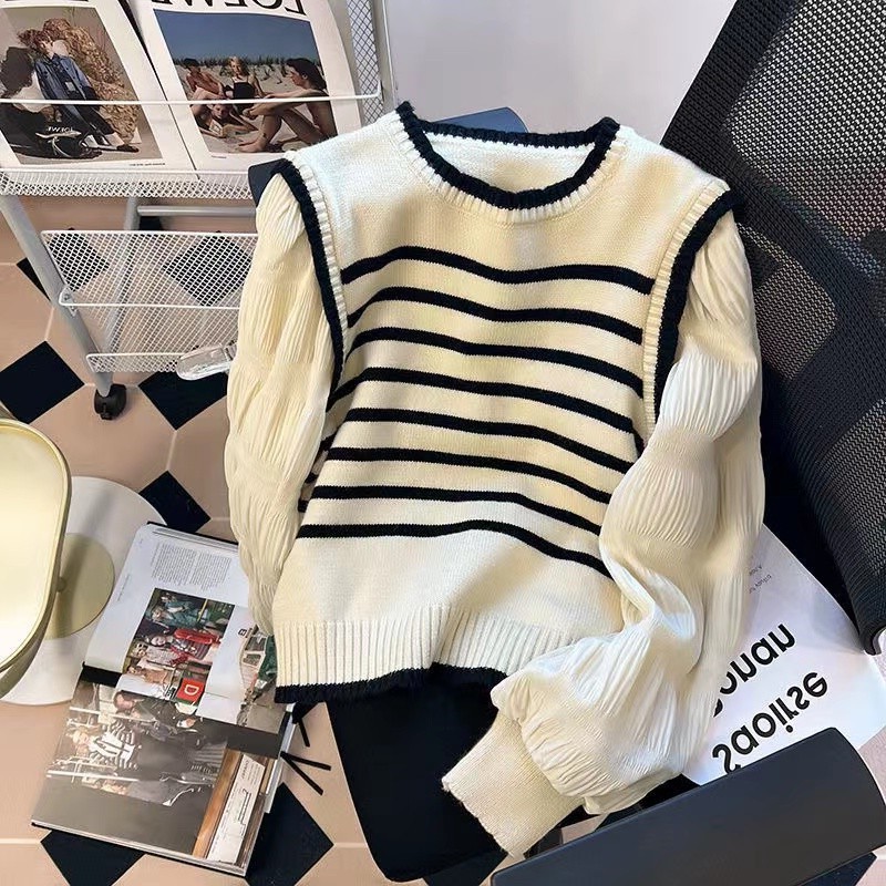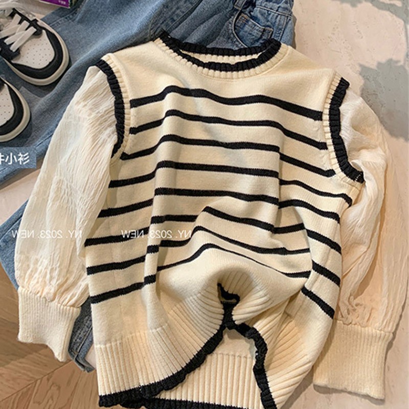 소녀 2024 가을 새로운 유행 가을 착용 긴 소매 외부 세련된 줄무늬 가짜 두 조각 니트 탑 착용
