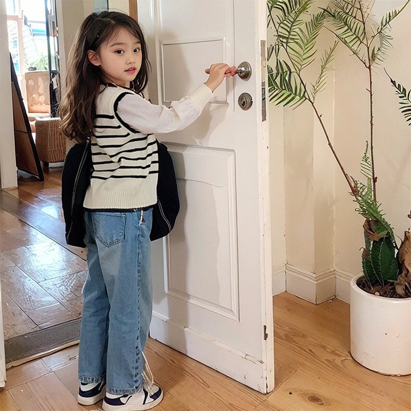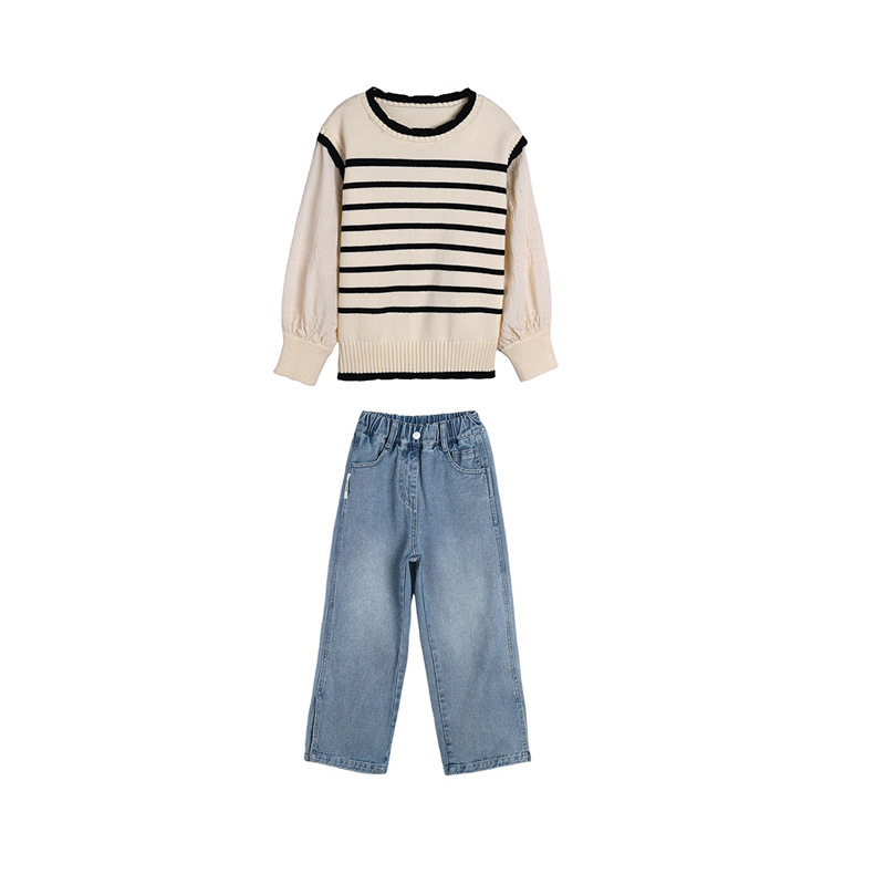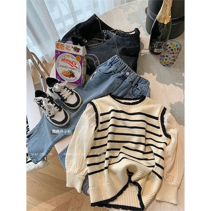 소녀 2024 가을 새로운 유행 가을 착용 긴 소매 외부 세련된 줄무늬 가짜 두 조각 니트 탑 착용스토어 가기
