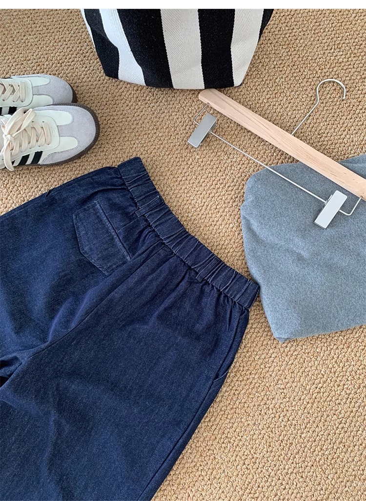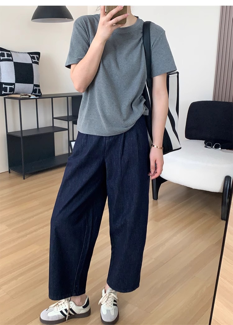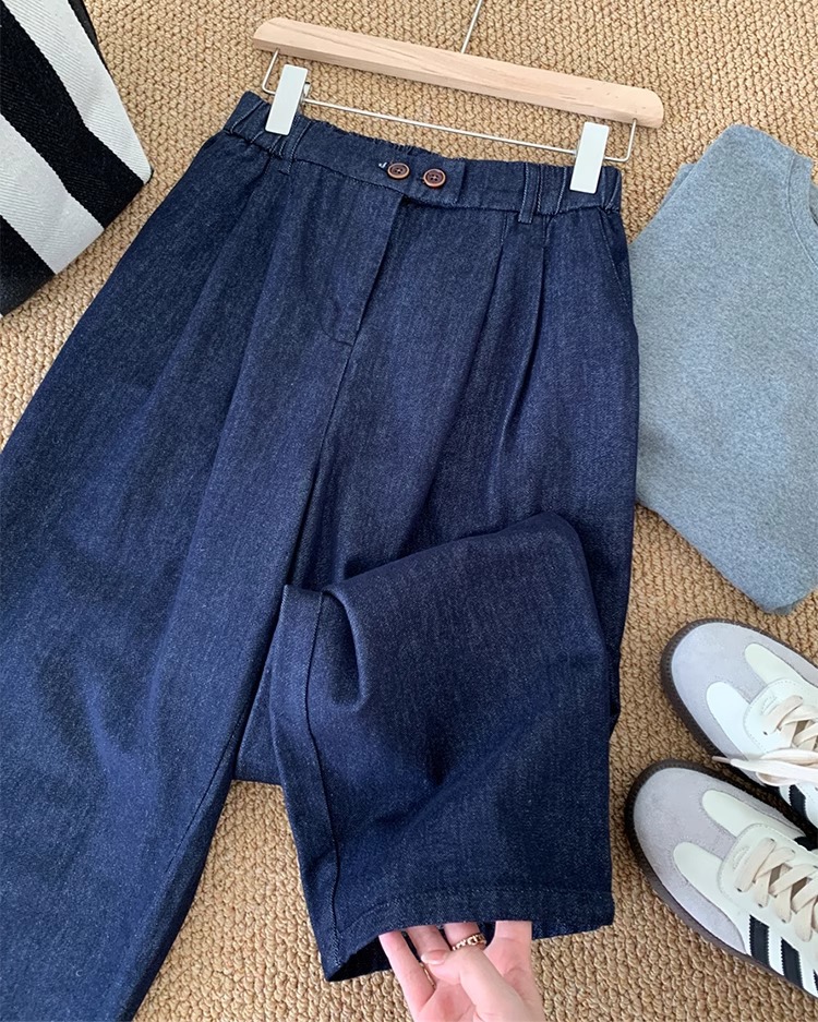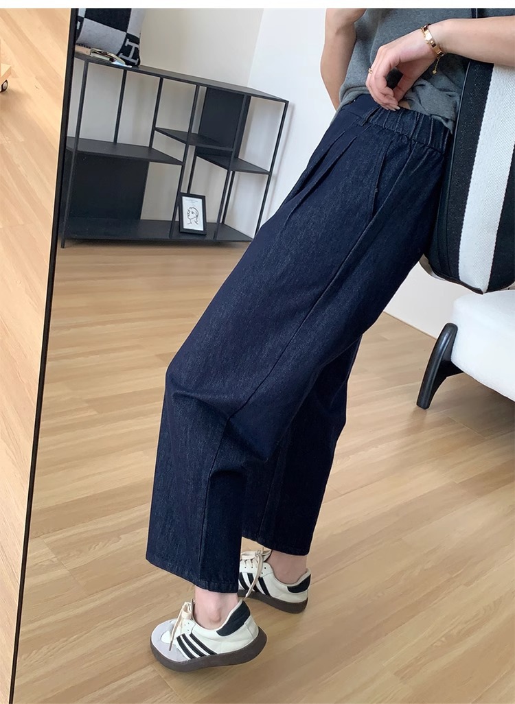 다크 블루 유럽 와이드 레그 바지 여자 일본식 할머니 바지 여름 루즈 슬리밍 주름 할란 올 매치 크롭 팬츠