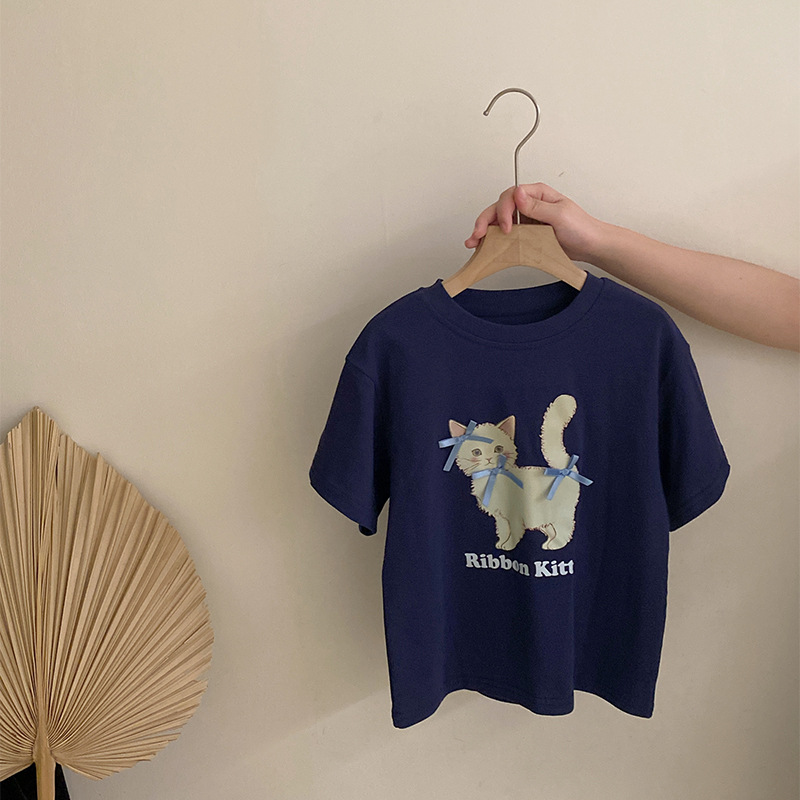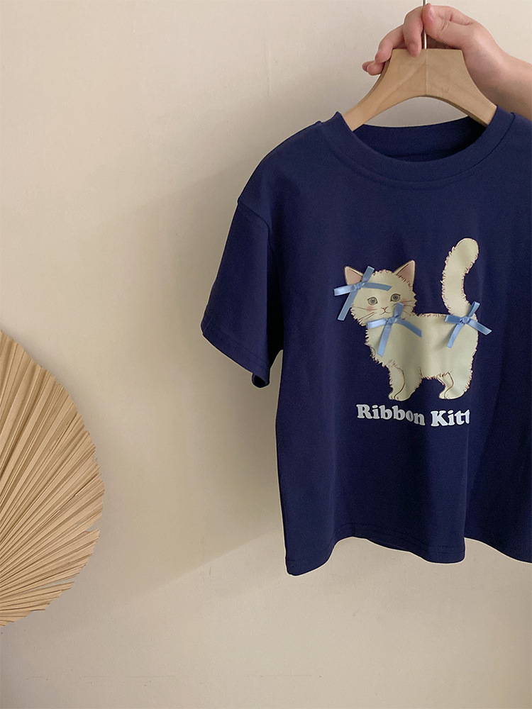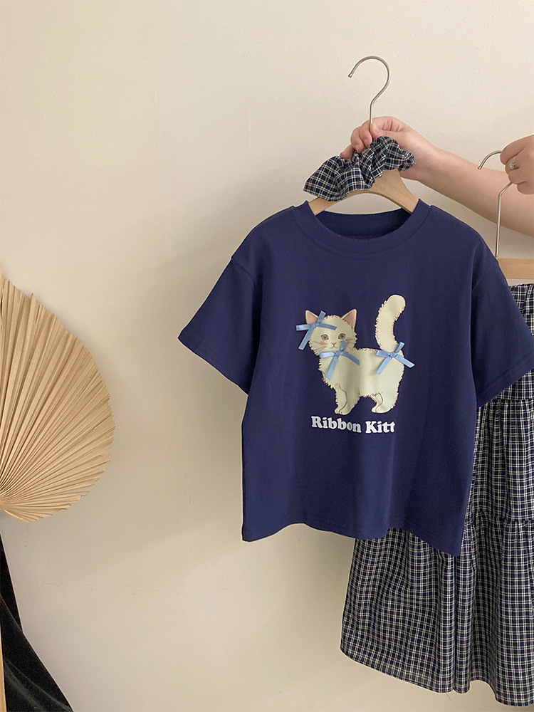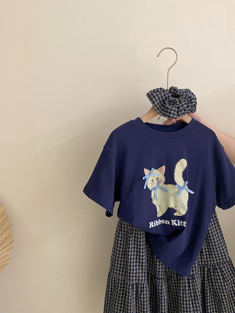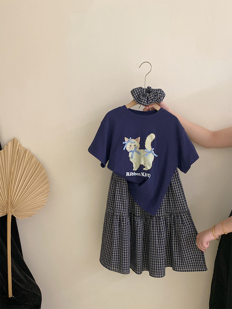 소녀 한국식 새 만화 고양이 인쇄 반팔 티셔츠 2025 올 매치 패치 워크 체크 스커트 투피스 세트