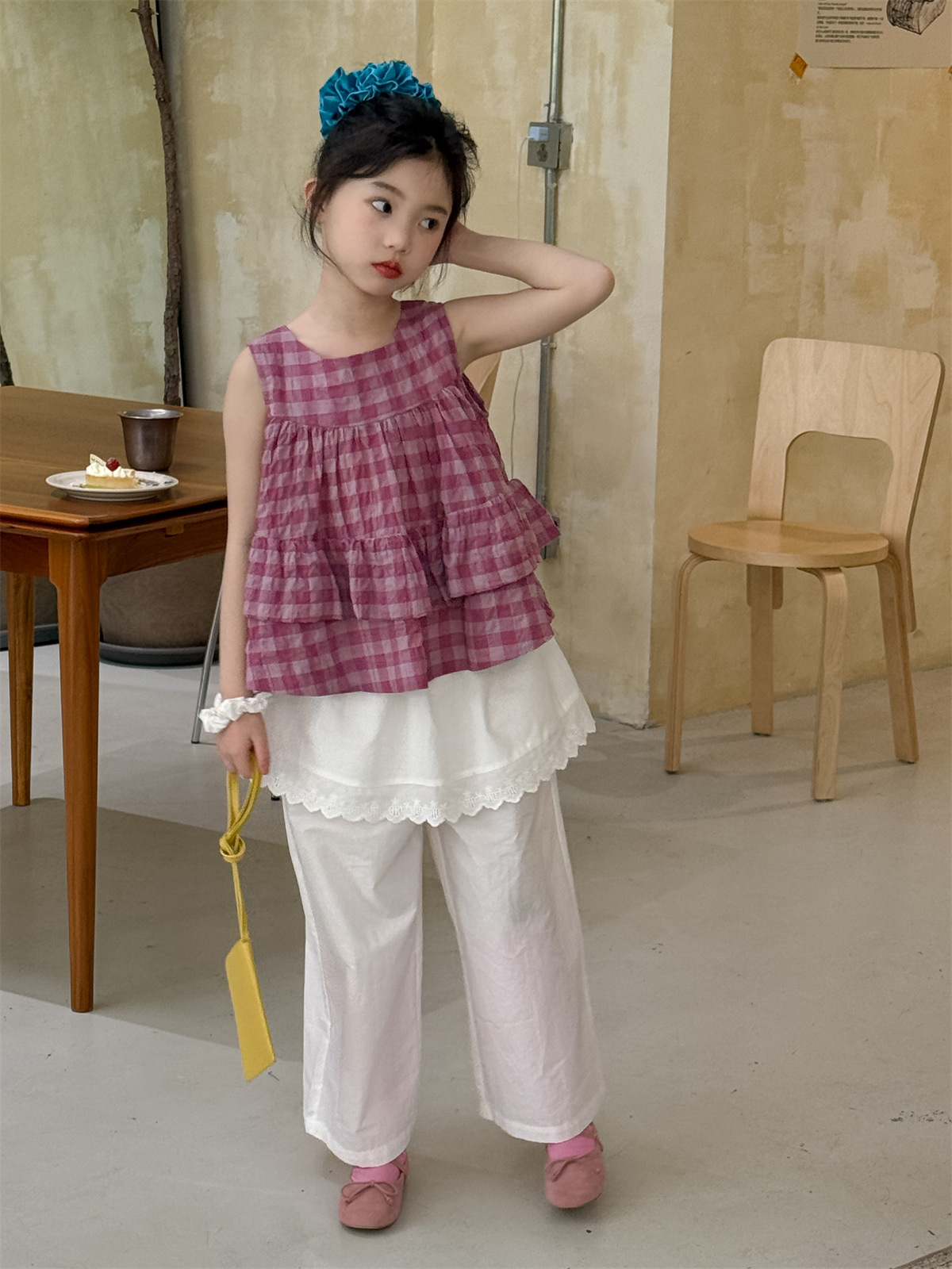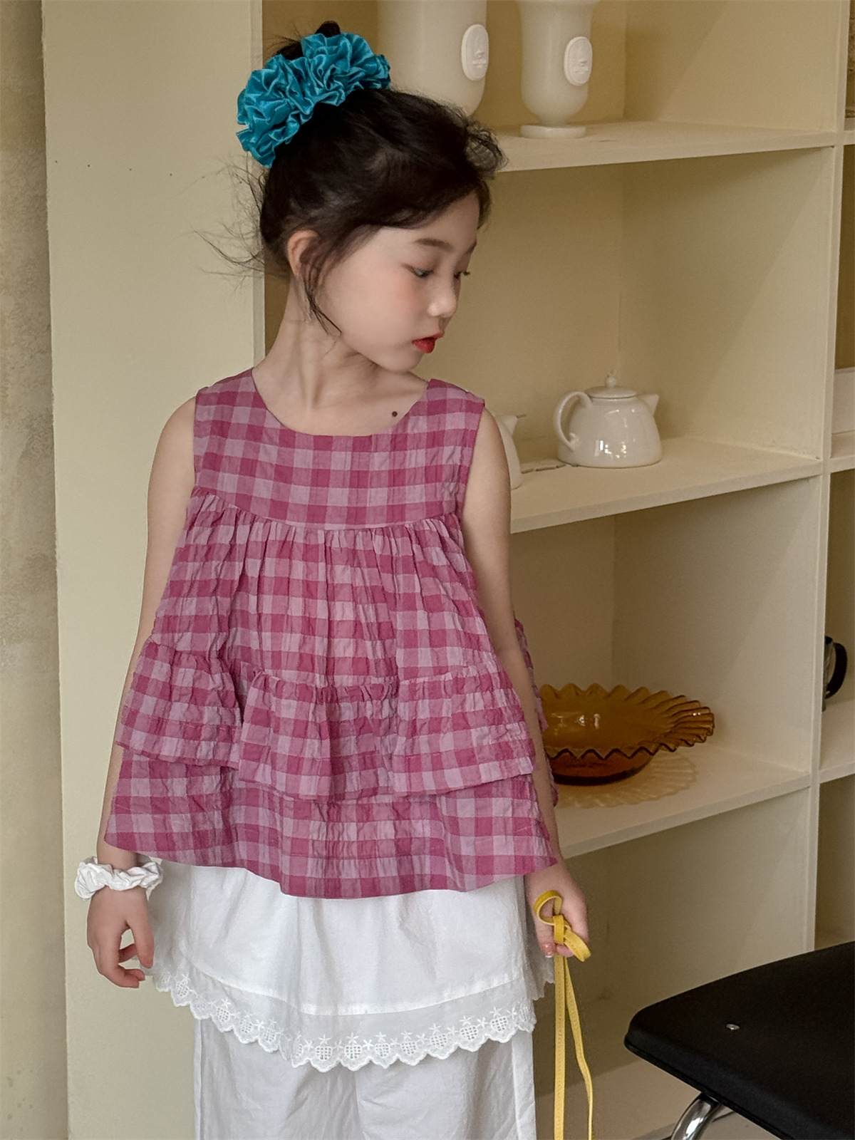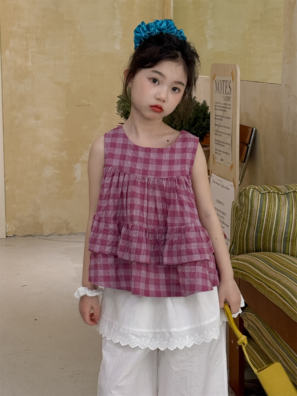 소녀를위한 꽃과 키즈 탑 2025 여름 격자 무늬 레이스 민소매 어린이 통기성 올 매치 작은 셔츠 어린이를위한 유행스토어 가기