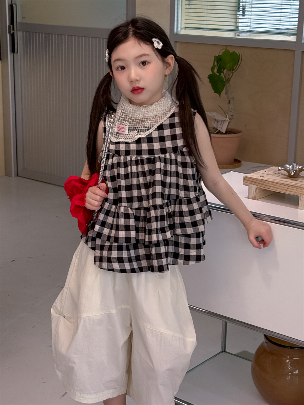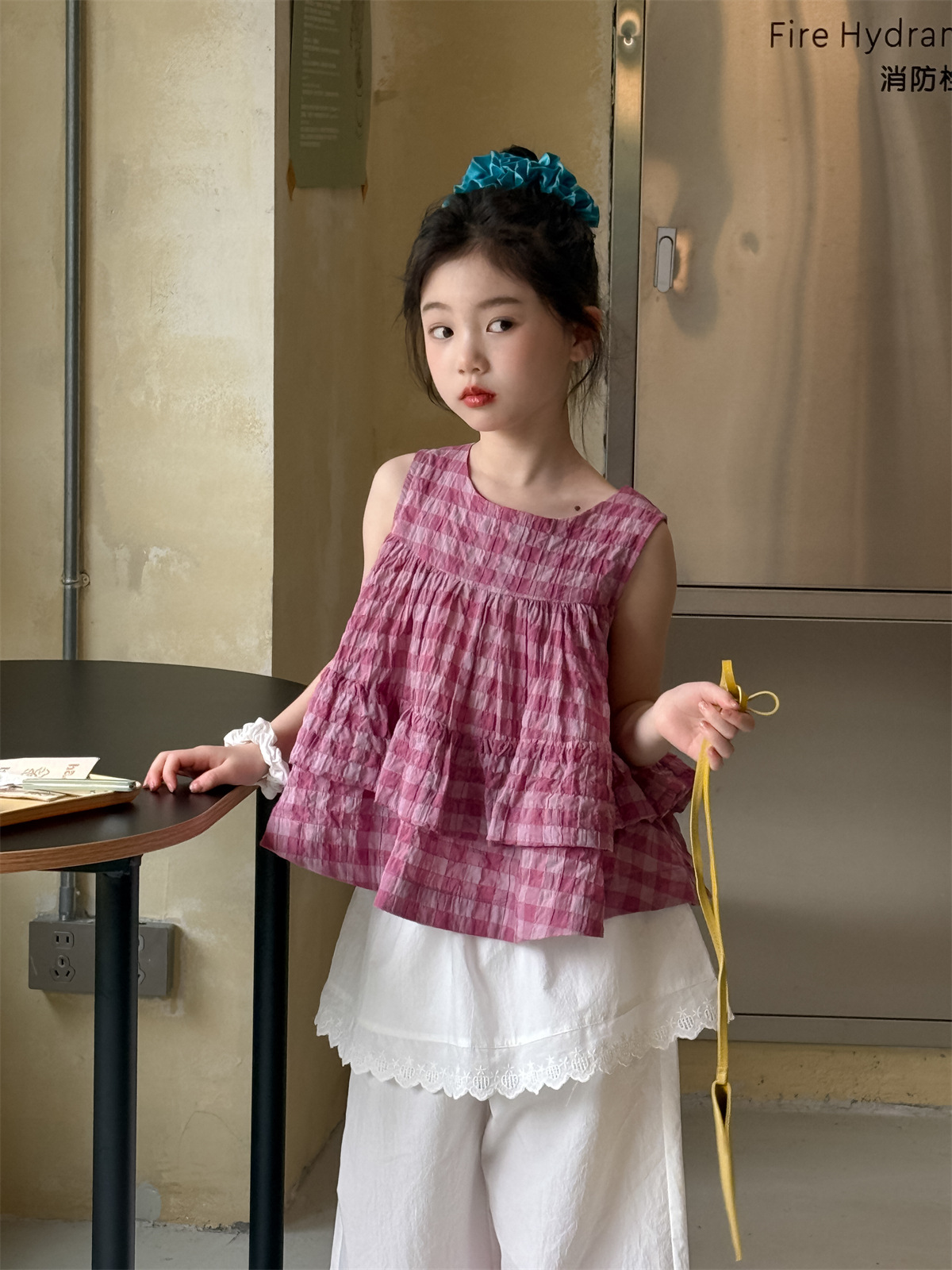 소녀를위한 꽃과 키즈 탑 2025 여름 격자 무늬 레이스 민소매 어린이 통기성 올 매치 작은 셔츠 어린이를위한 유행