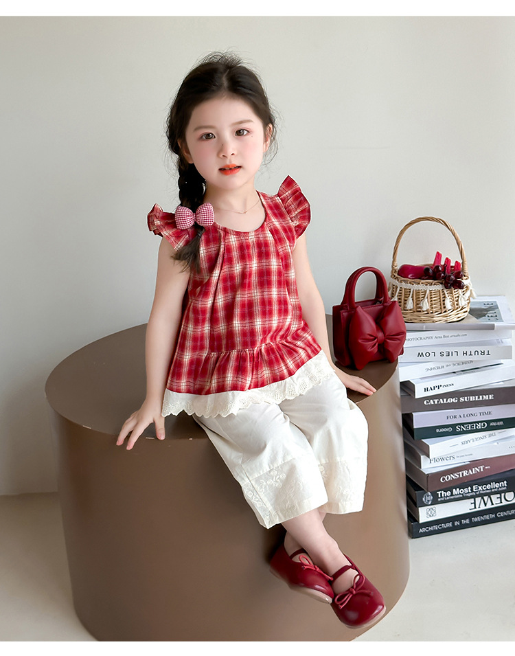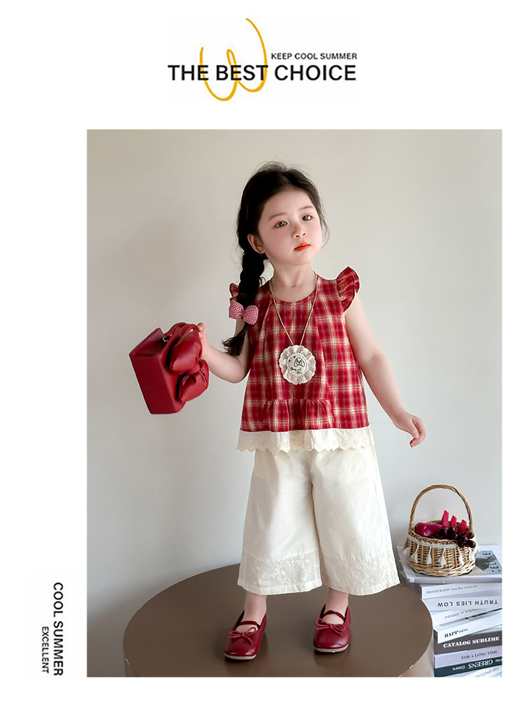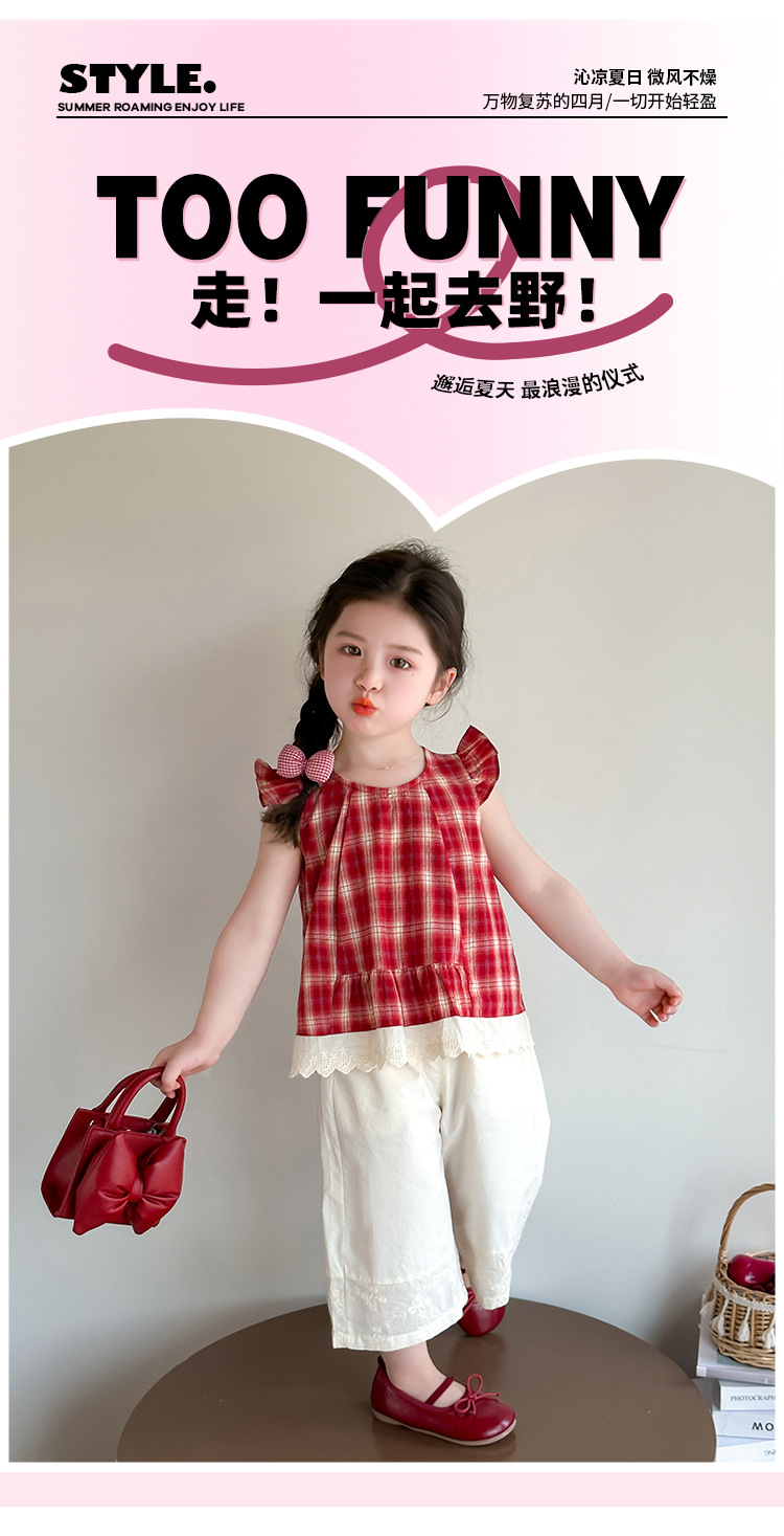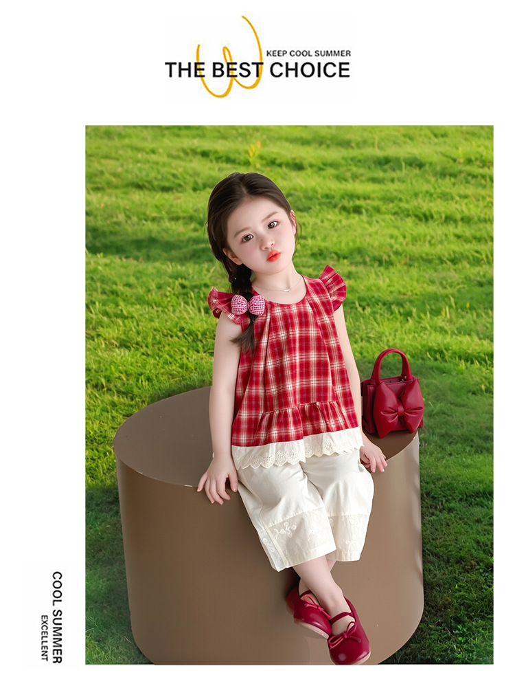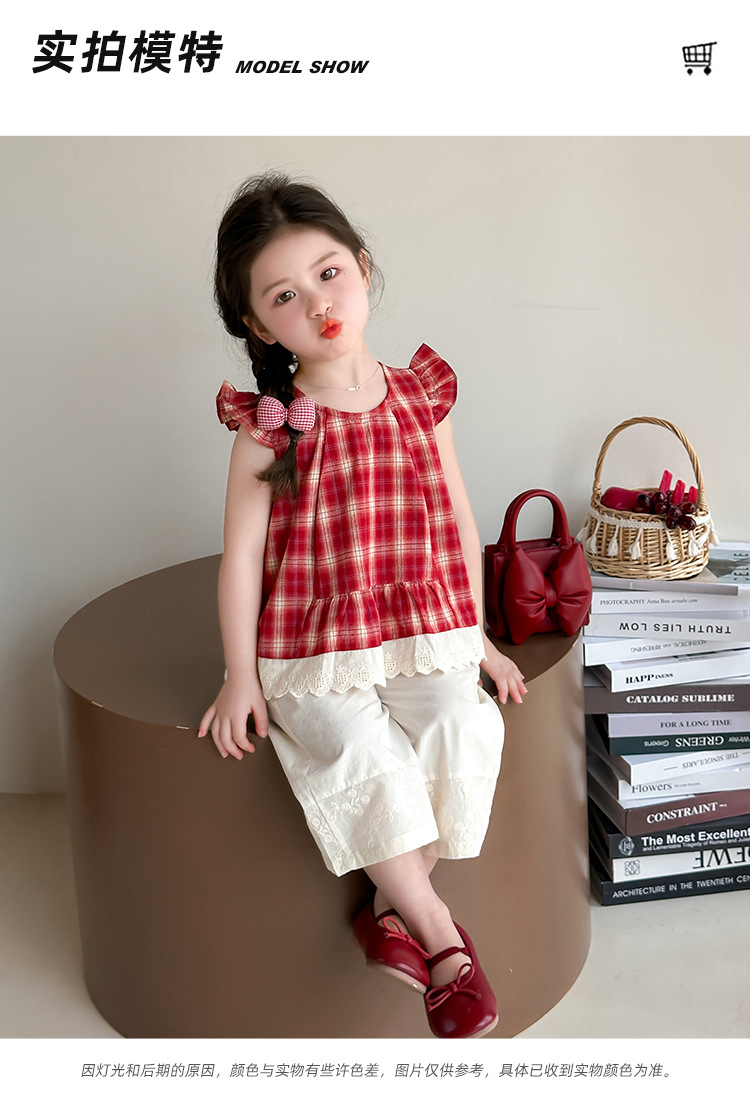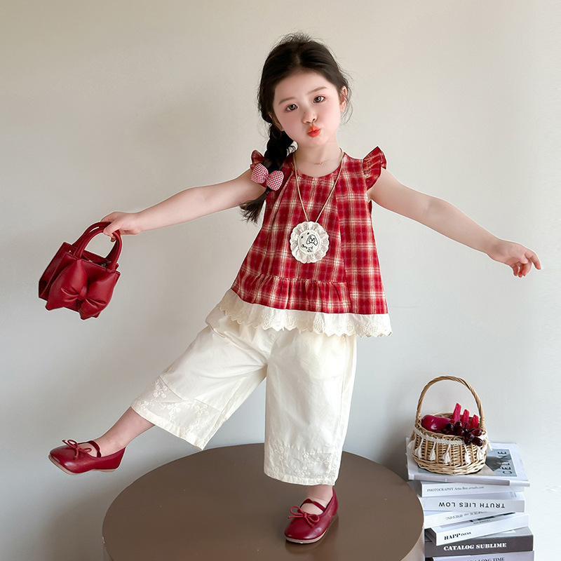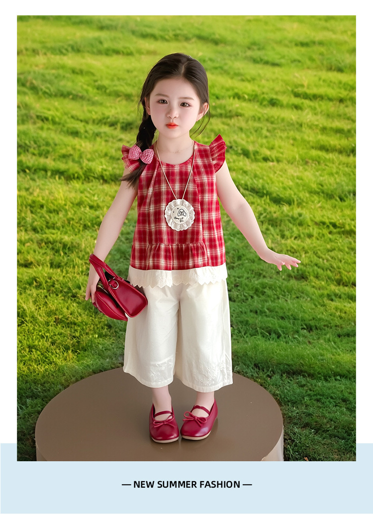 소녀 격자 무늬 캐주얼 세트 2025 새로운 어린이 서양 스타일 유행 빨간 격자 무늬 탁자 아기 소녀 여름 두 조각스토어 가기