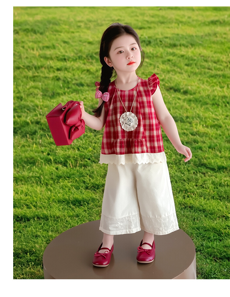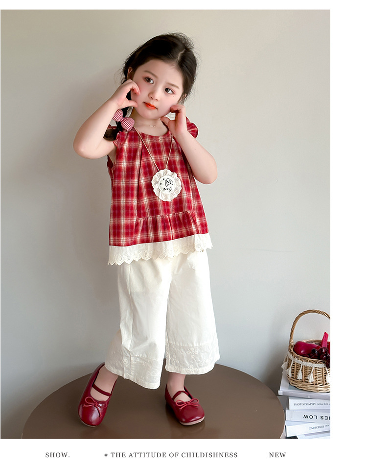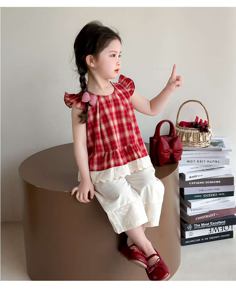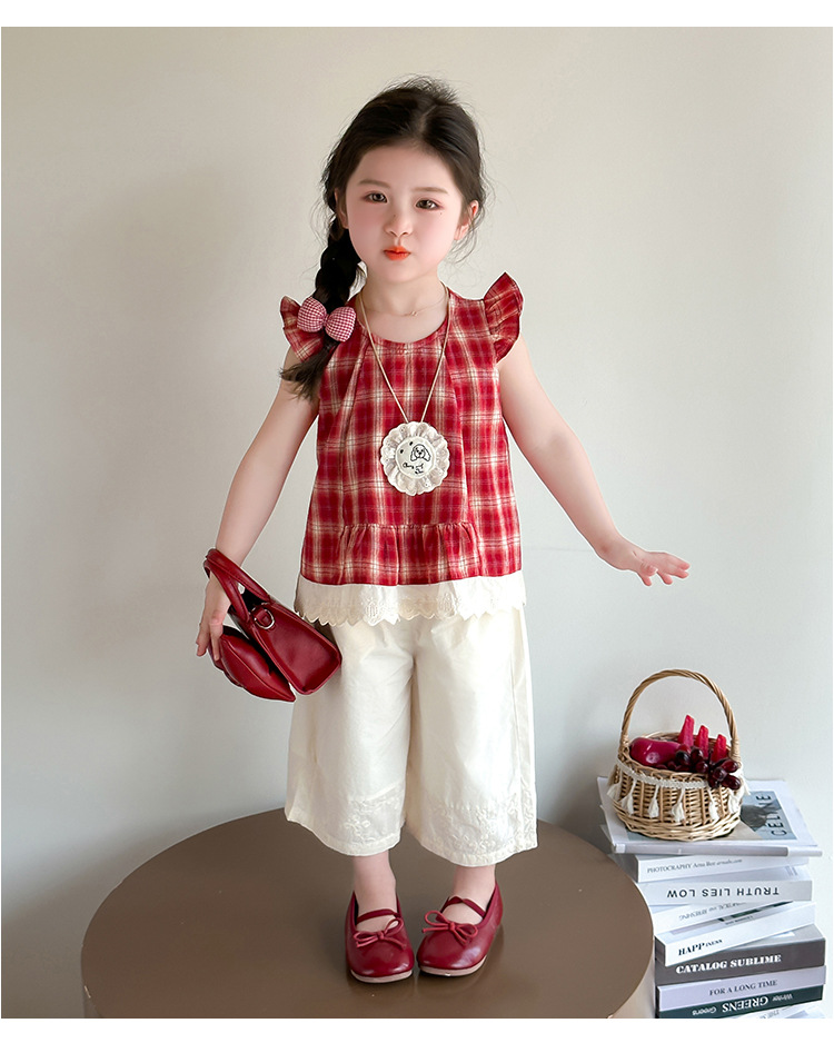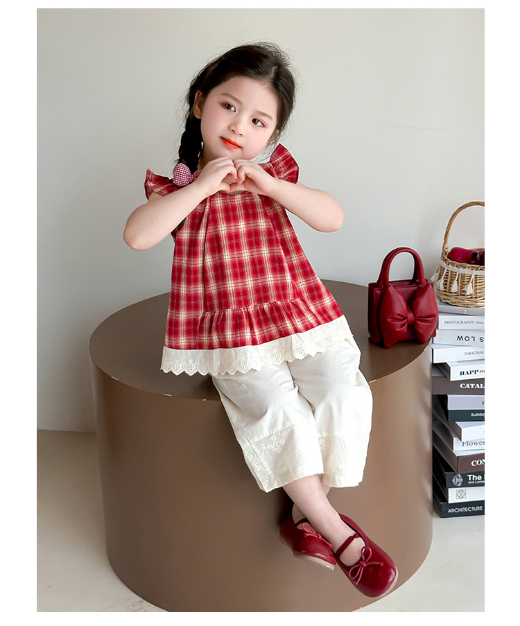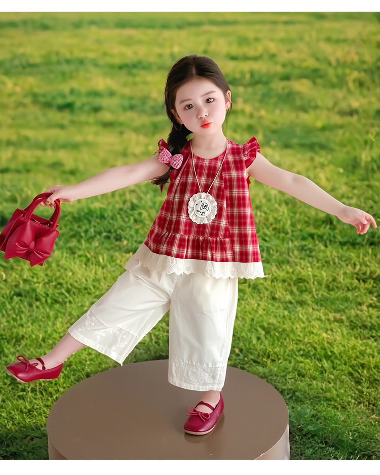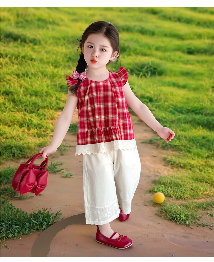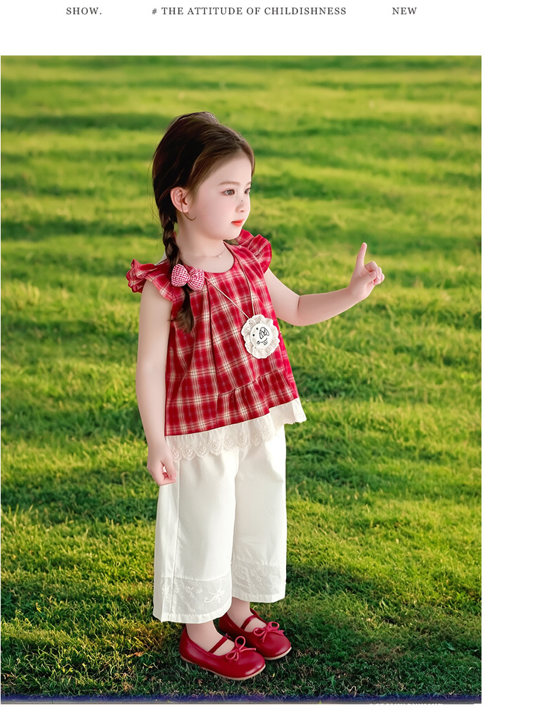 소녀 격자 무늬 캐주얼 세트 2025 새로운 어린이 서양 스타일 유행 빨간 격자 무늬 탁자 아기 소녀 여름 두 조각스토어 가기