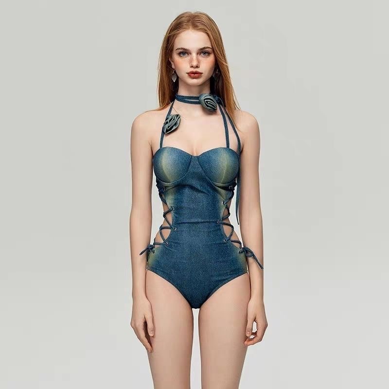 2025 오리지널 아메리칸 스타일 스파이스 소녀 레트로 데님 타이트한 허리 스트랩 슬림 벨리 커버 온천 휴가 수영복 여성