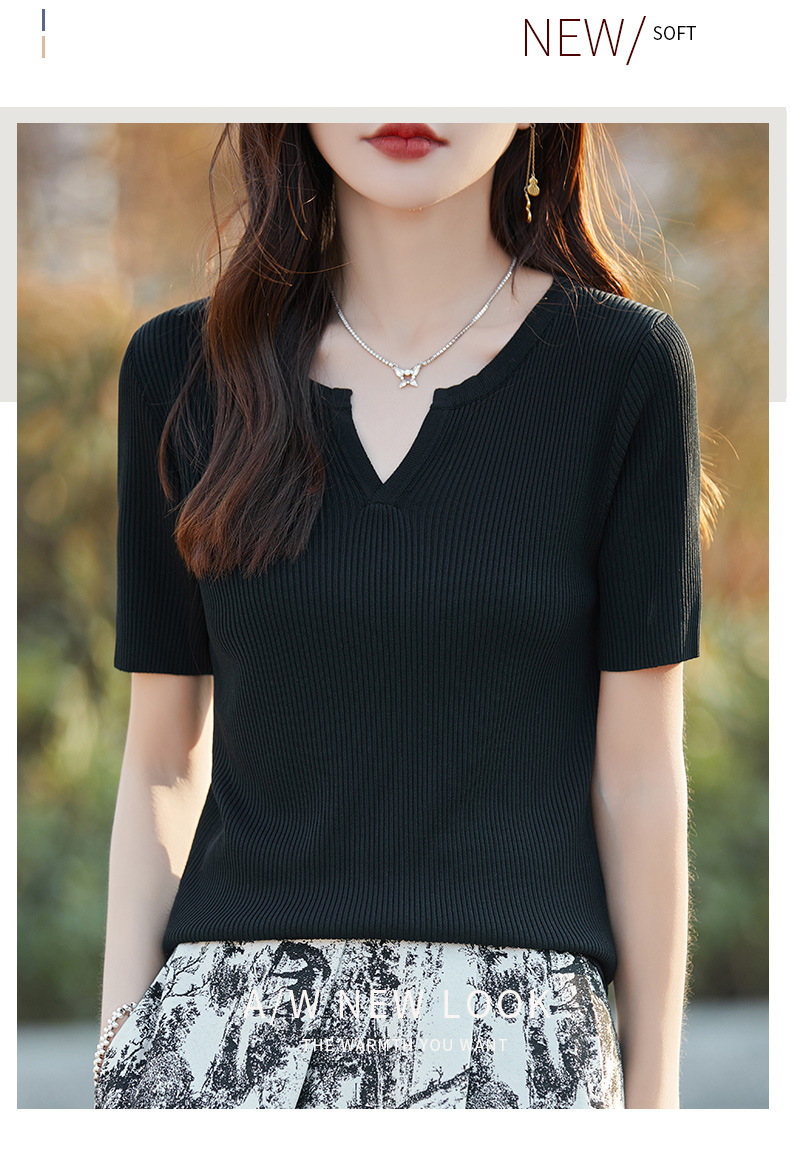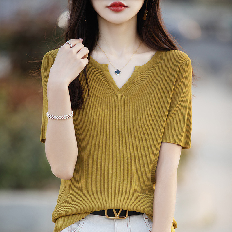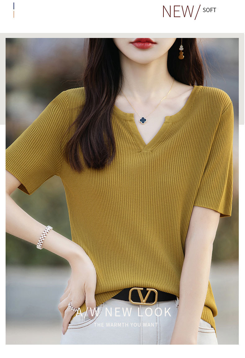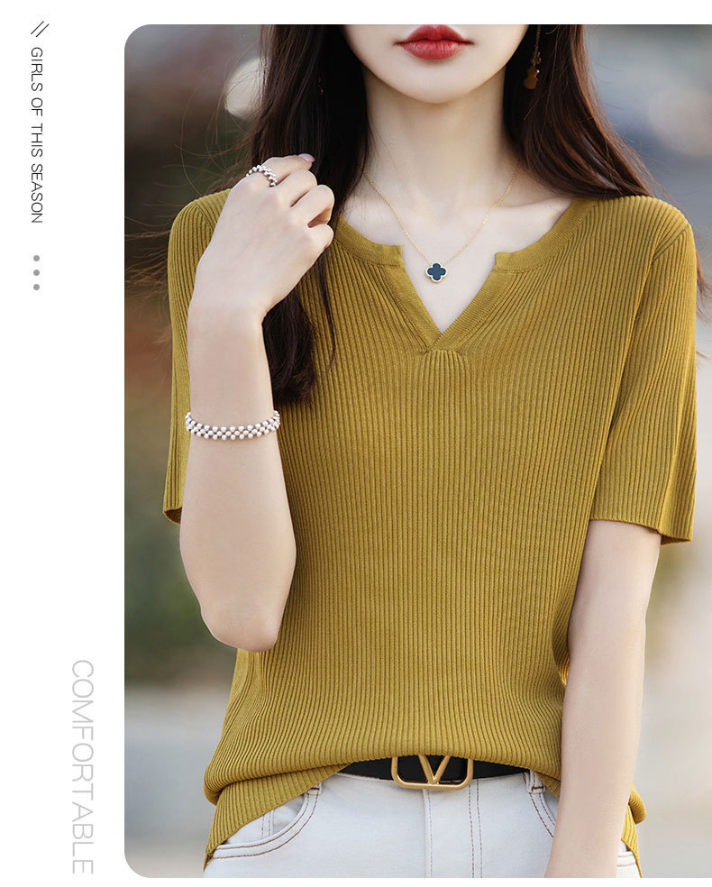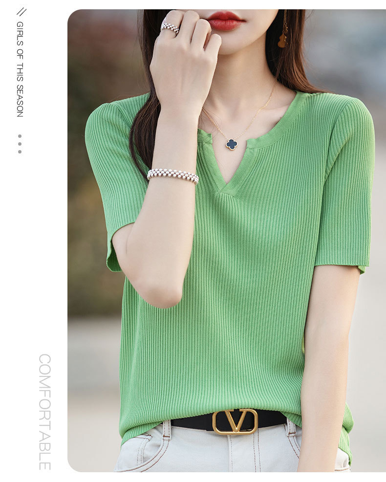여름 새로운 여성 의류 Quzhu 아이스 대마 실크 짧은 소매 여성용 스웨터 티셔츠 여성용 V 넥 얇은 슬림 대외 무역 도매 세대스토어 가기