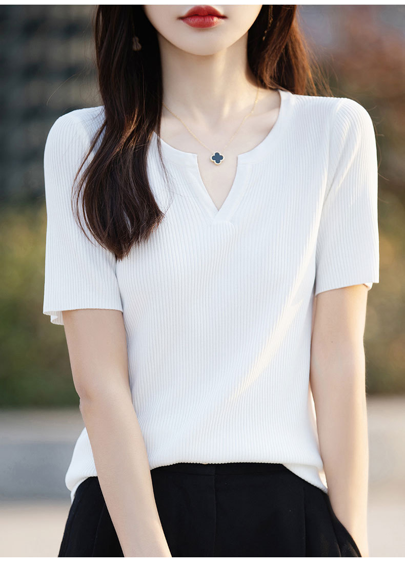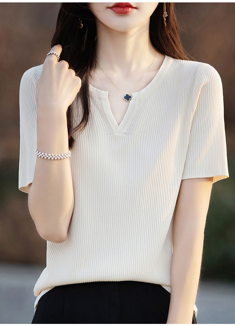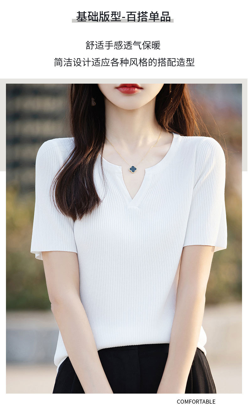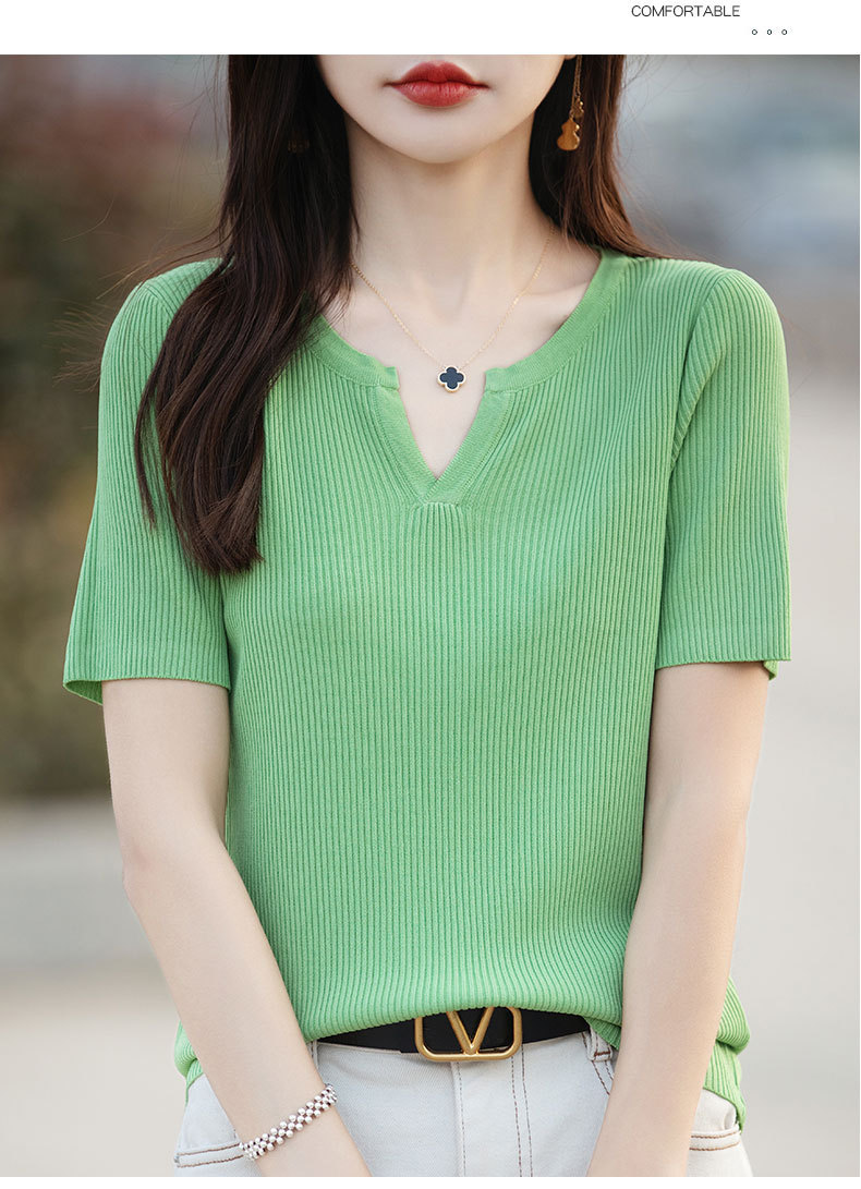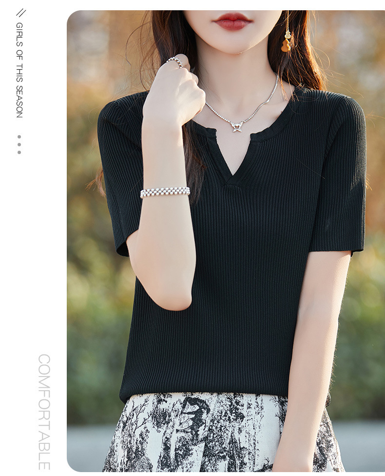 여름 새로운 여성 의류 Quzhu 아이스 대마 실크 짧은 소매 여성용 스웨터 티셔츠 여성용 V 넥 얇은 슬림 대외 무역 도매 세대스토어 가기