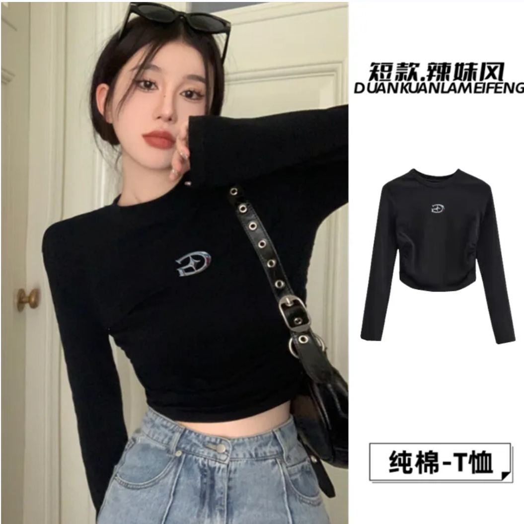 아메리칸 레트로 달콤하고 매운 배꼽 노출 타이트 핫걸 블랙 쇼트 탑 여성 여름 오른쪽 어깨 긴팔 아우터 티셔츠스토어 가기